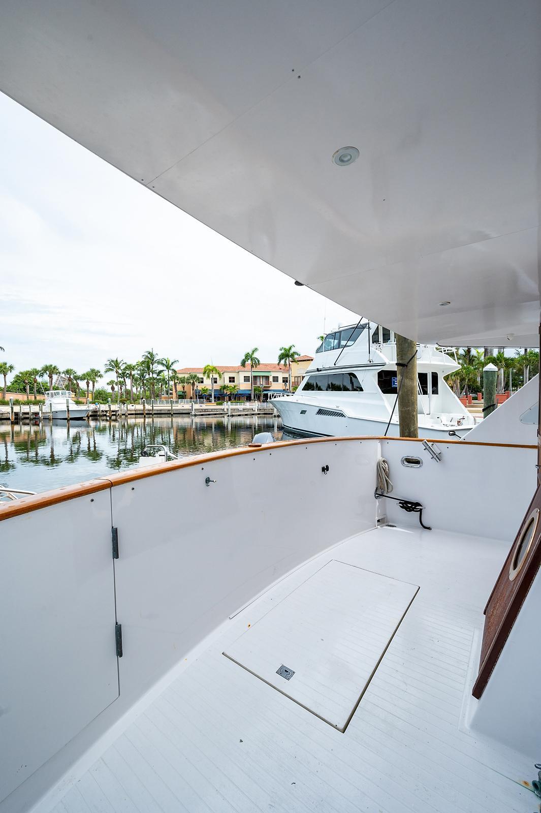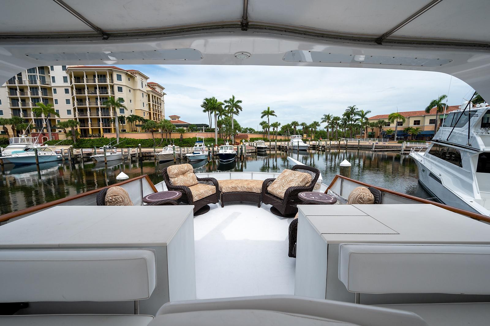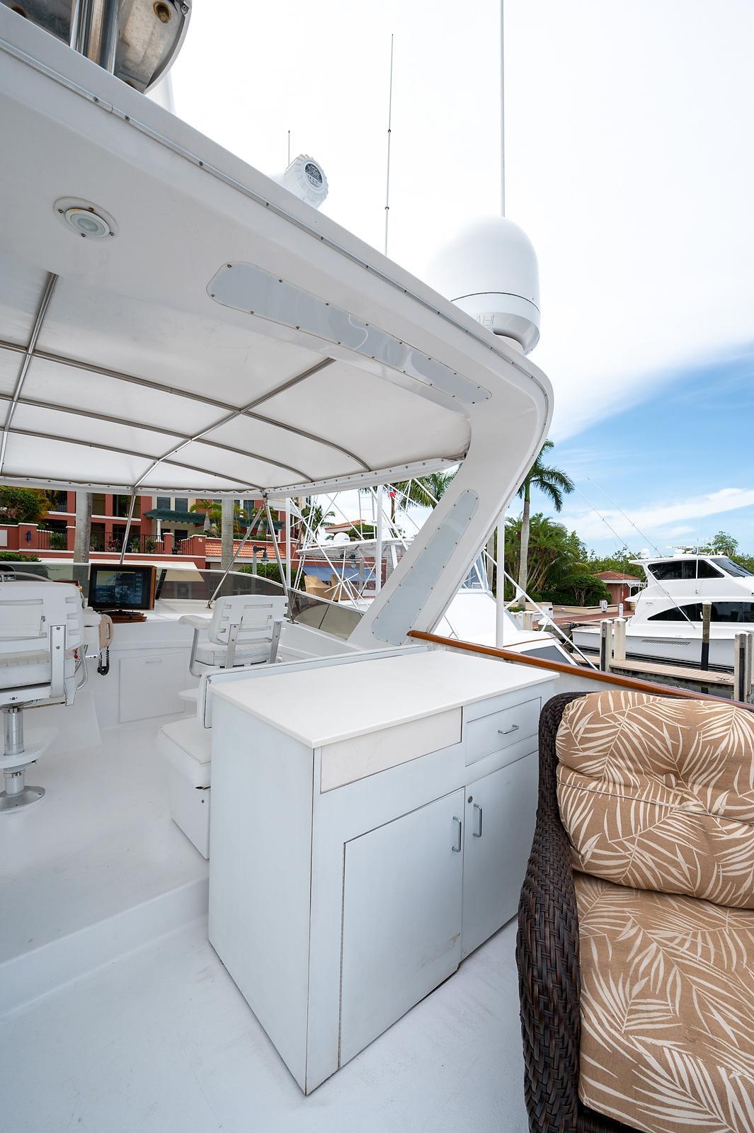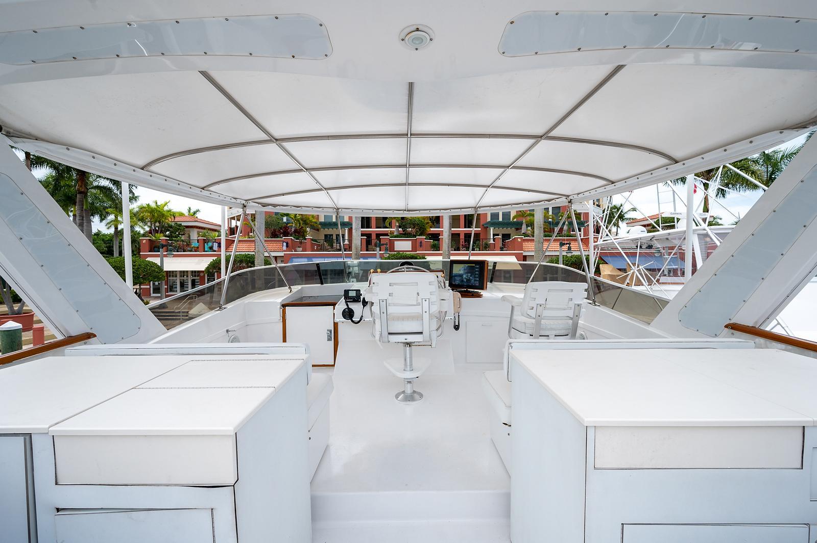 The flybridge offers a fully appointed, centerline helm, guest seating an open-air lounging area on the boat deck amidships, and the dinghy on davit aft. Engine room access is provided through a centerline door in the cockpit area. There are full walkaround decks which are covered as is the cockpit. 6'4" Cabin Headroom.