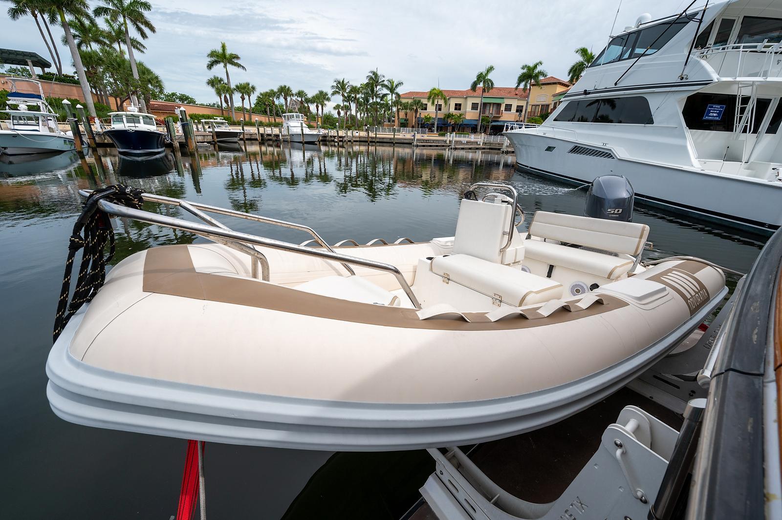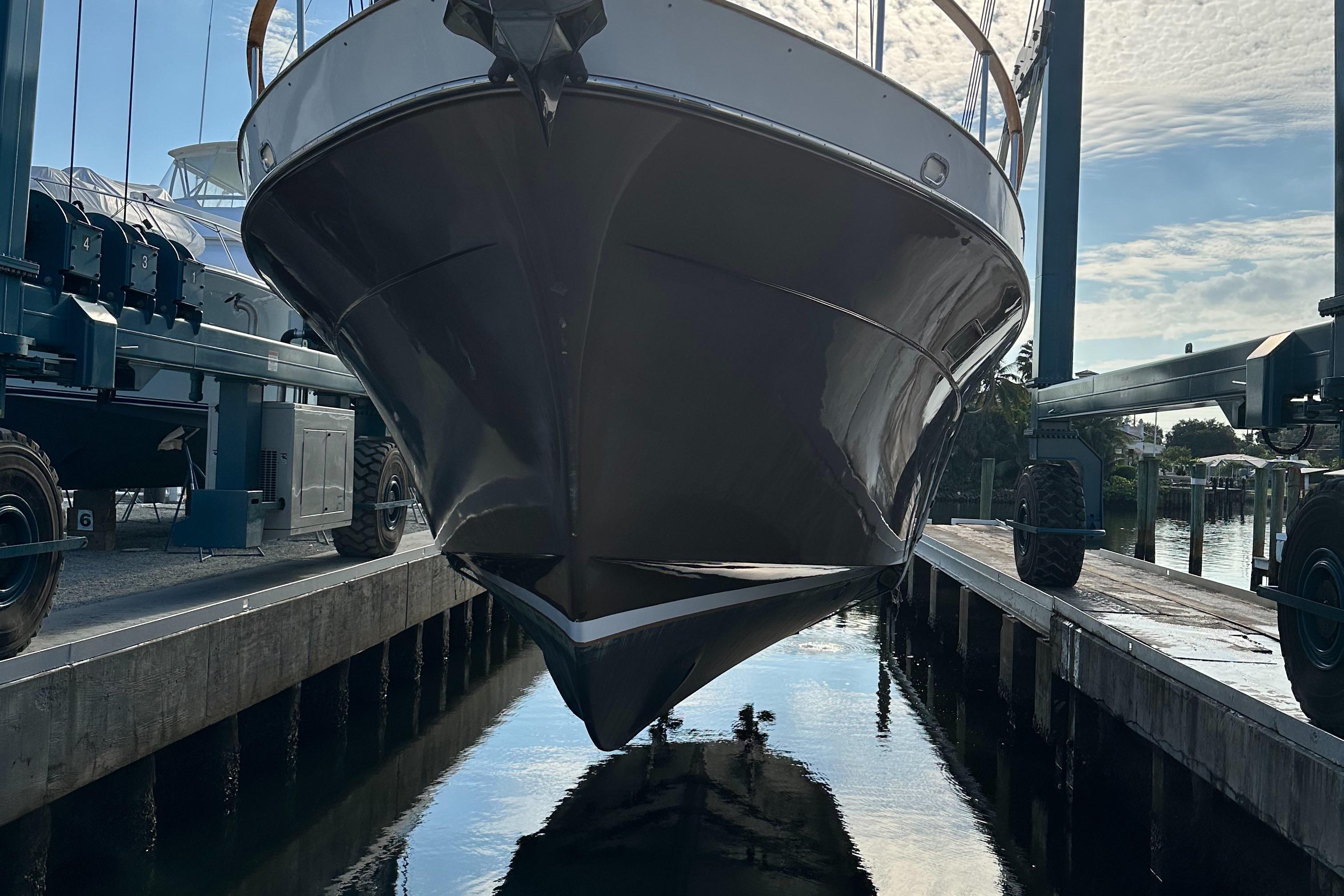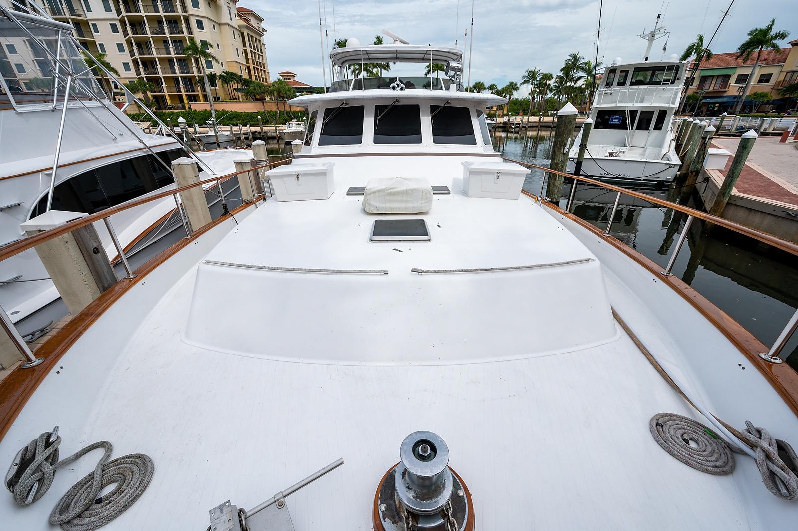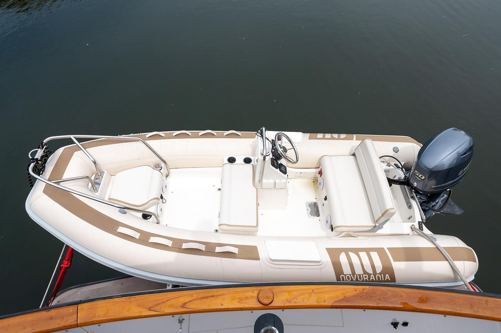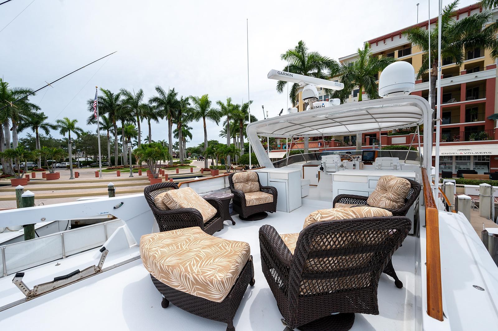 The flybridge offers a fully appointed, centerline helm, guest seating an open-air lounging area on the boat deck amidships, and the dinghy on davit aft. Engine room access is provided through a centerline door in the cockpit area. There are full walkaround decks which are covered as is the cockpit. 6'4" Cabin Headroom.