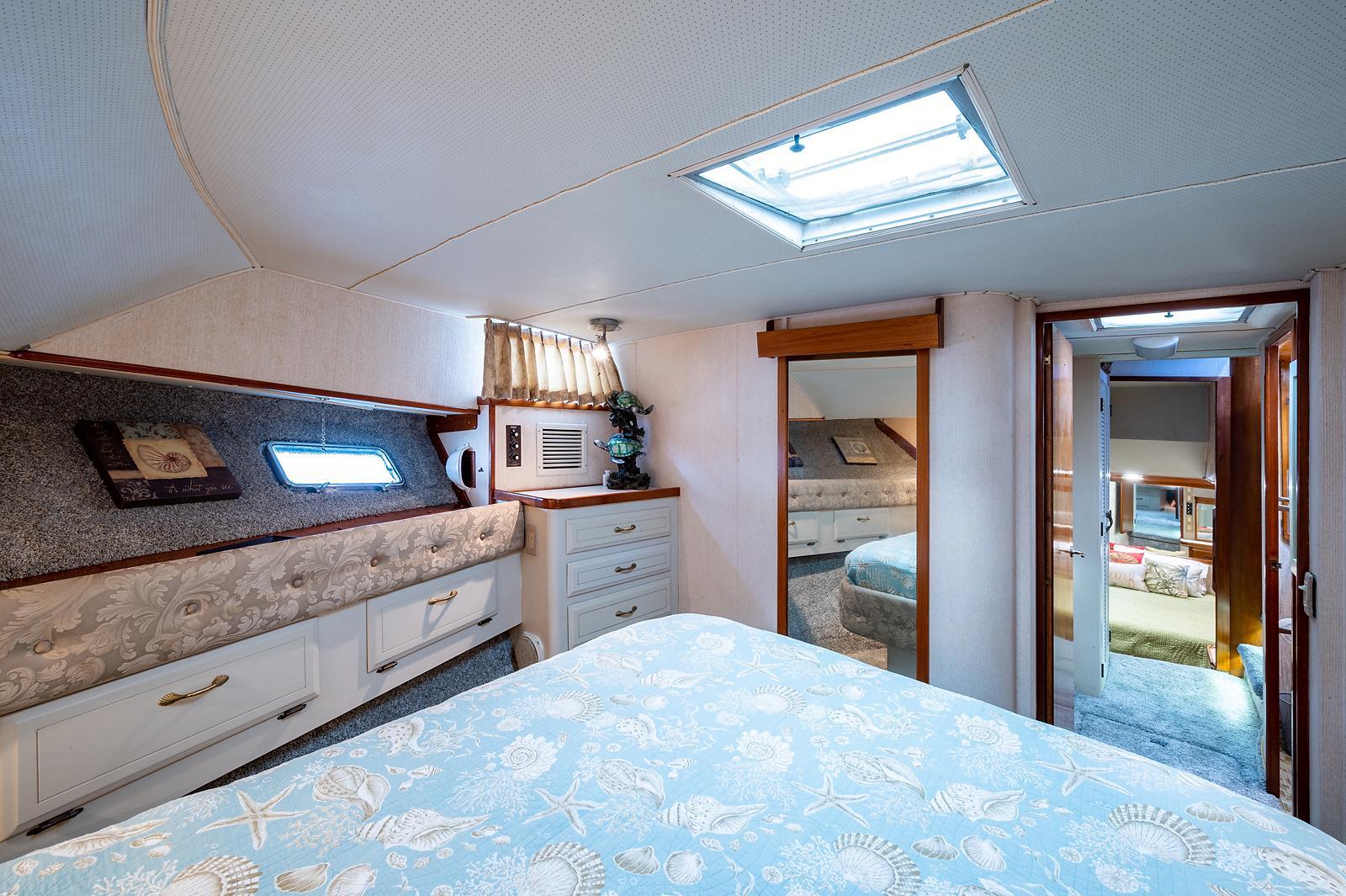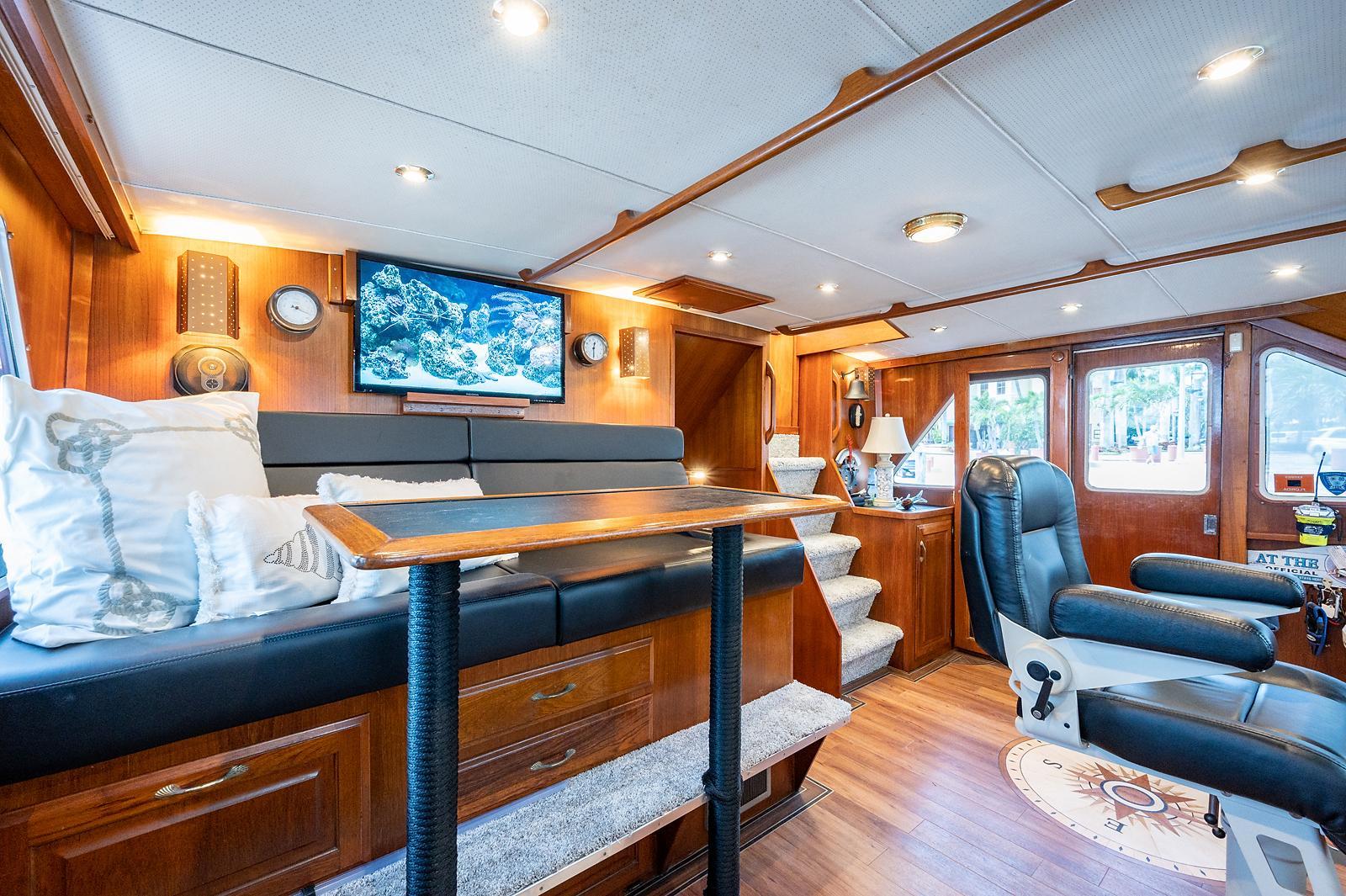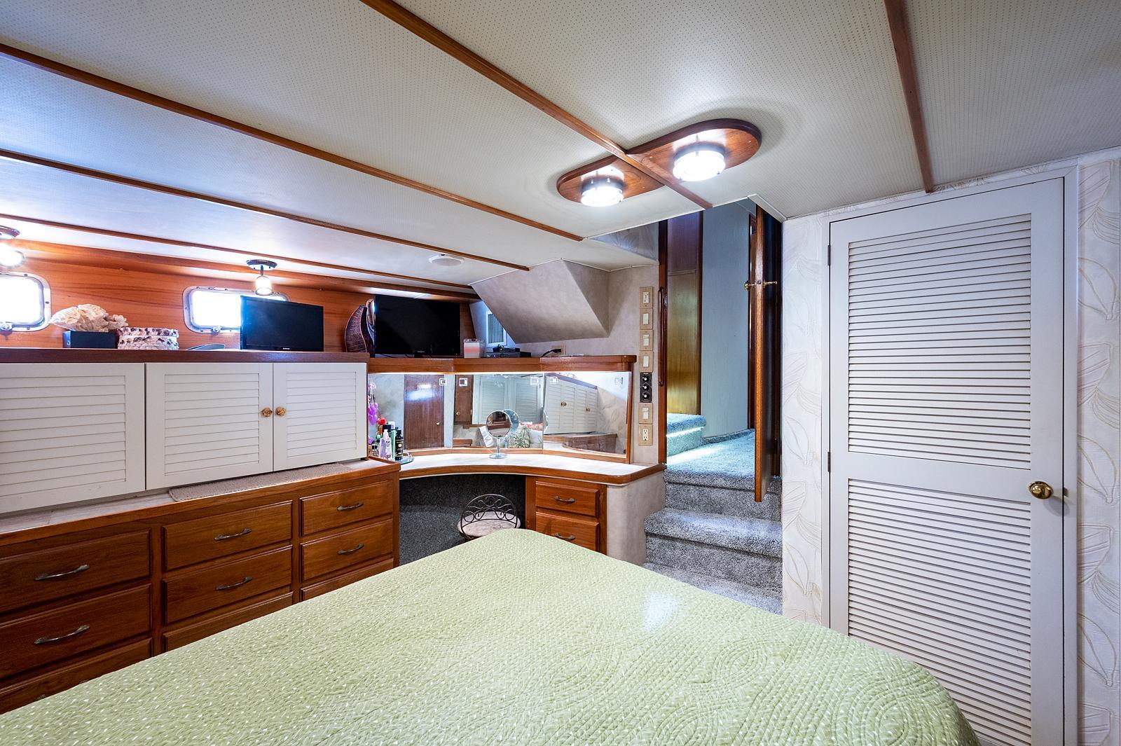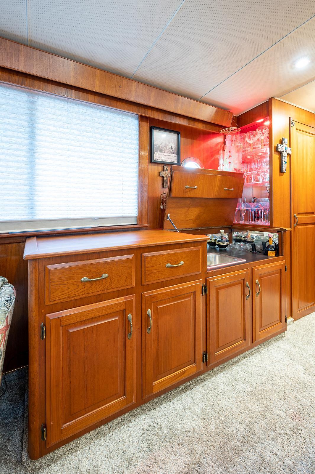 The satin teak interior sleeps 6 in 3 cabins. Through double teak doors on the port side aft, enter the salon with a floor-to-ceiling centerline entertainment center inboard of a writing desk on the aft bulkhead. An L-shaped settee is forward to starboard with an adjustable teak table, opposite portside occasional chairs with end table. Forward on the port side, the wet bar cabinets with glass and bottle storage is to port, and the deep U-shaped galley is opposite. Continue forward and up to the pilothouse with a centerline helm station, port & starboard wing doors, raised settee aft to starboard and a flybridge staircase aft to port.
