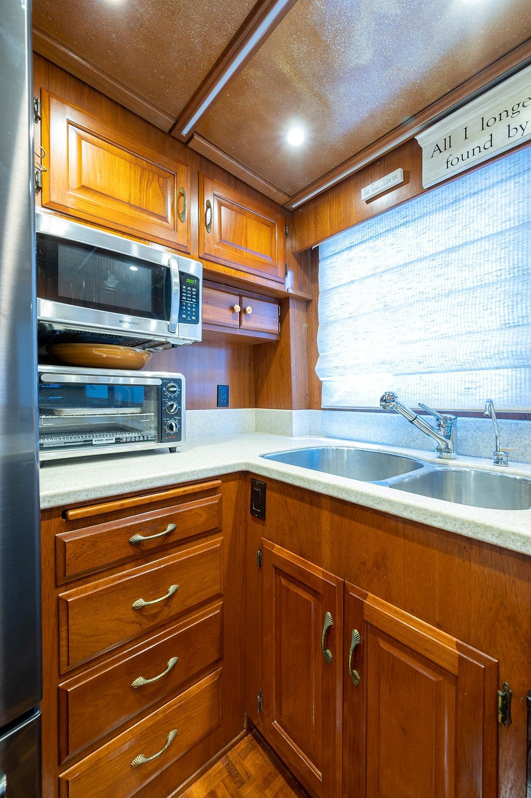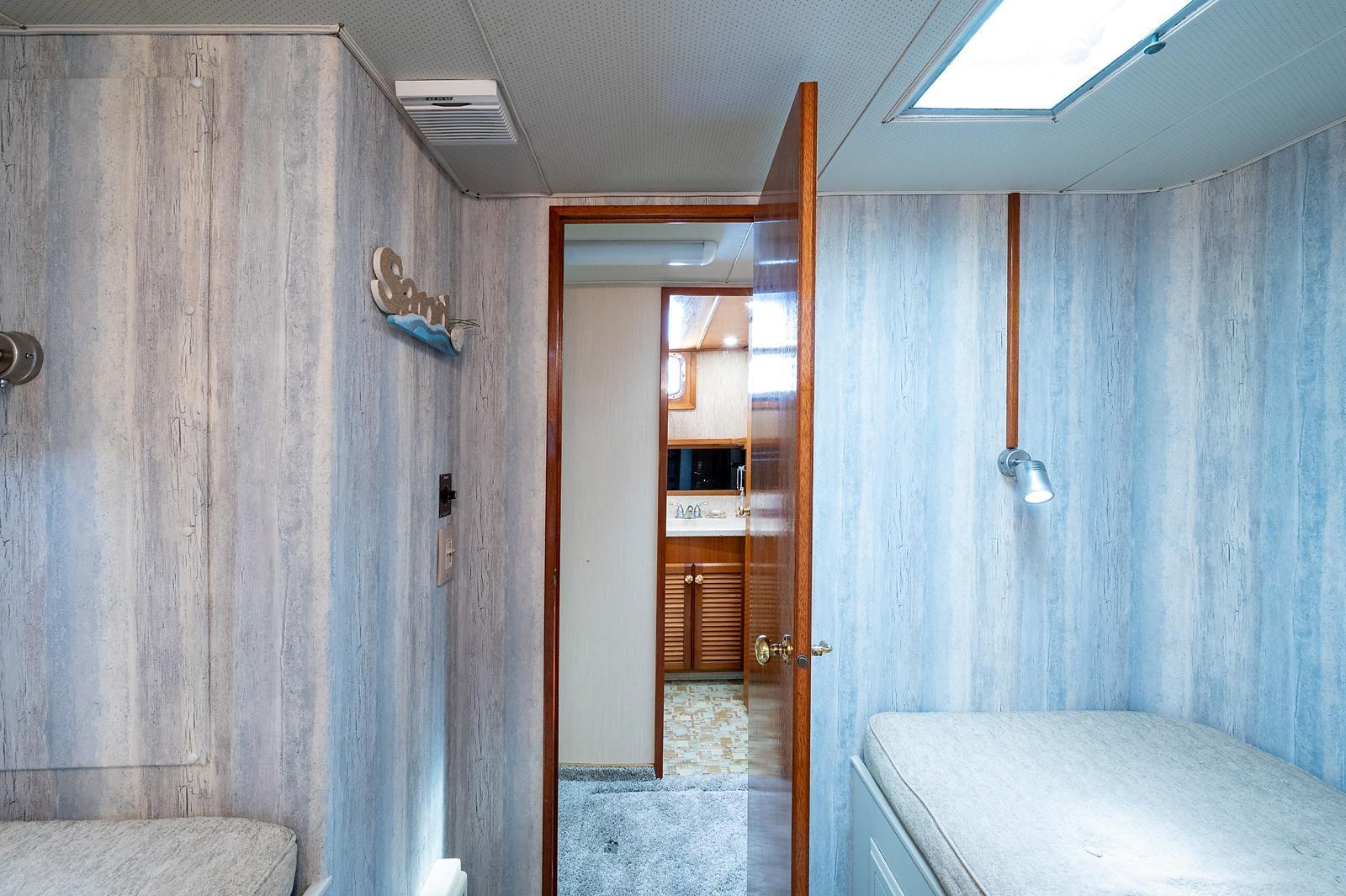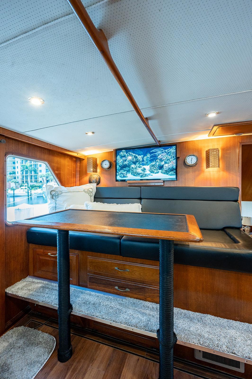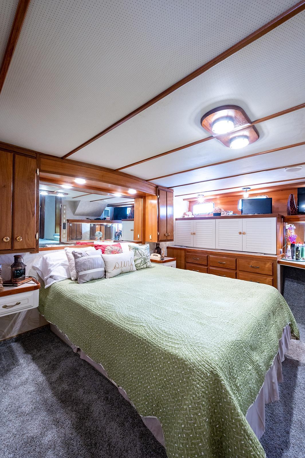 The satin teak interior sleeps 6 in 3 cabins. Through double teak doors on the port side aft, enter the salon with a floor-to-ceiling centerline entertainment center inboard of a writing desk on the aft bulkhead. An L-shaped settee is forward to starboard with an adjustable teak table, opposite portside occasional chairs with end table. Forward on the port side, the wet bar cabinets with glass and bottle storage is to port, and the deep U-shaped galley is opposite. Continue forward and up to the pilothouse with a centerline helm station, port & starboard wing doors, raised settee aft to starboard and a flybridge staircase aft to port.