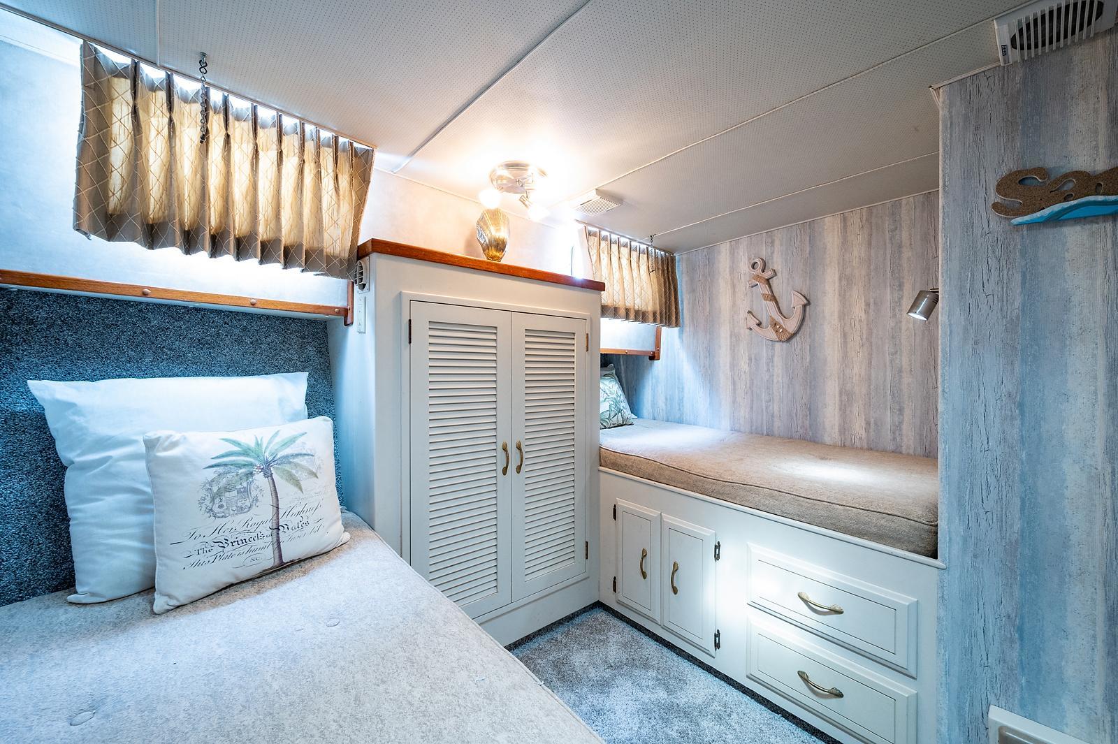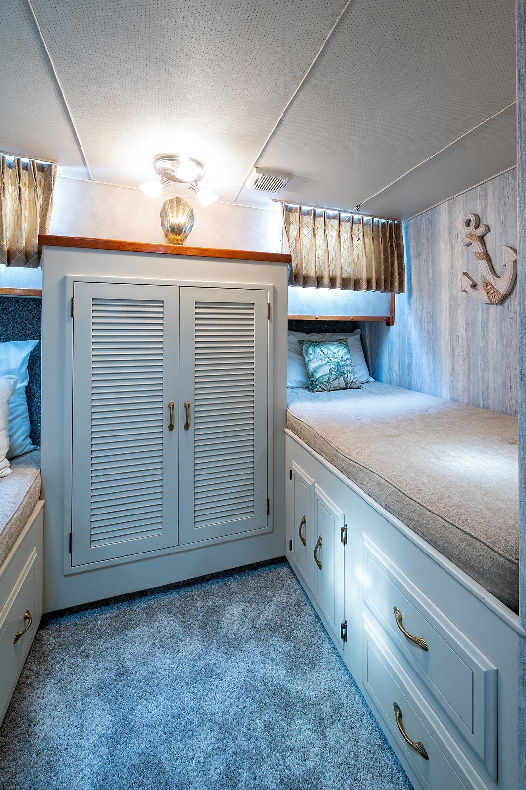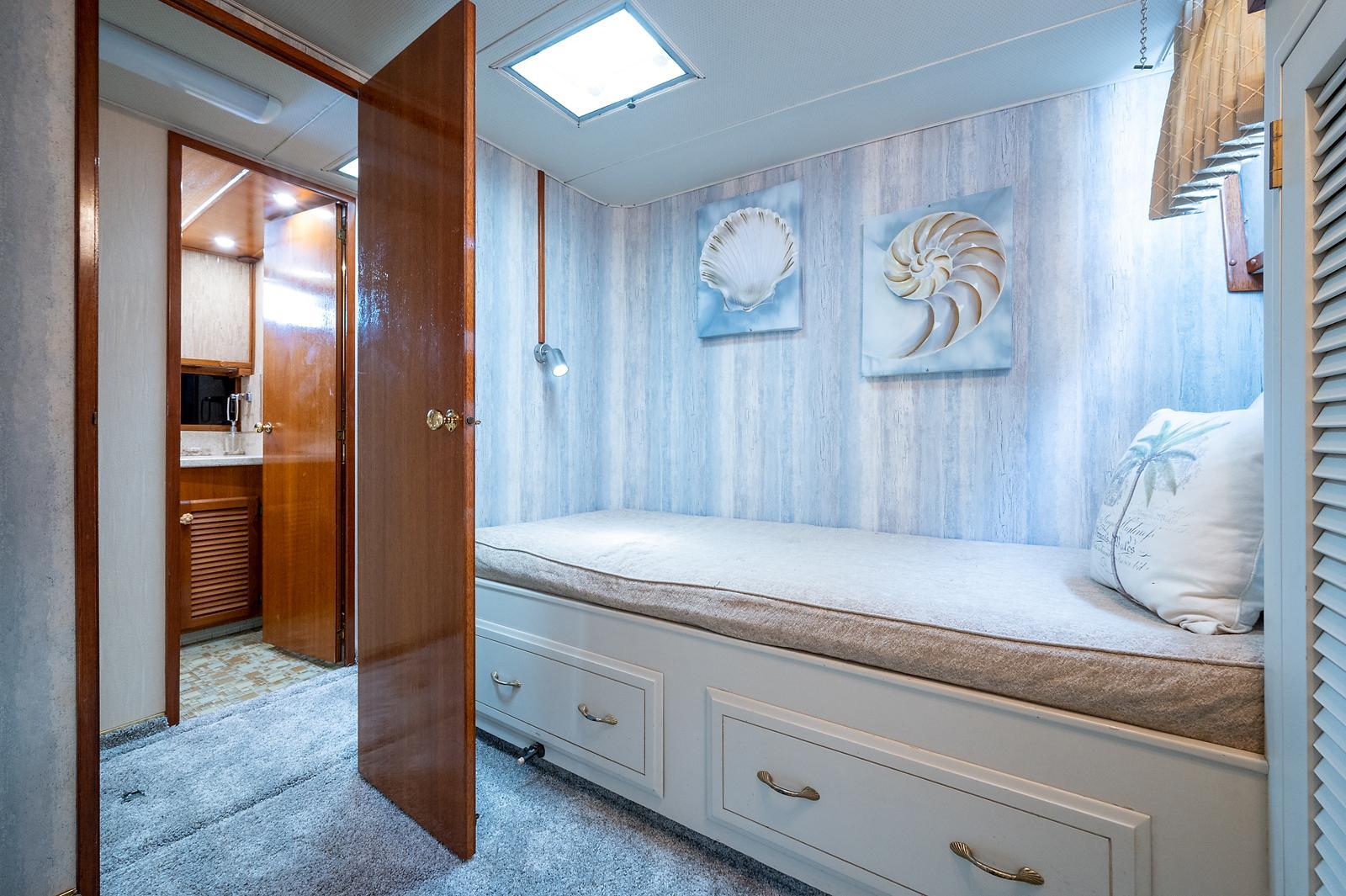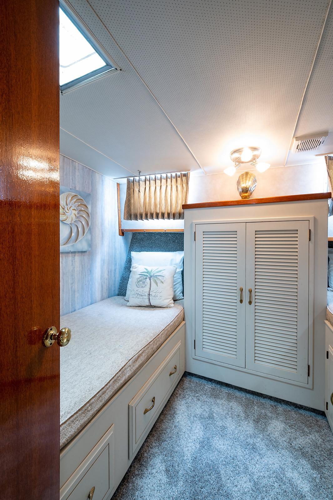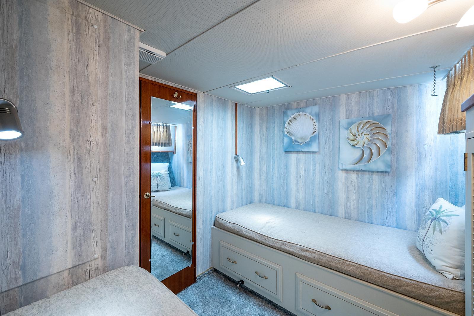 Below decks, the VIP guest stateroom is in the bow with a centerline queen, followed aft to port by the head and shower - shared with the twin guest stateroom immediately opposite. There is an apartment sized over under washer/dryer behind louvered doors in the hallway.