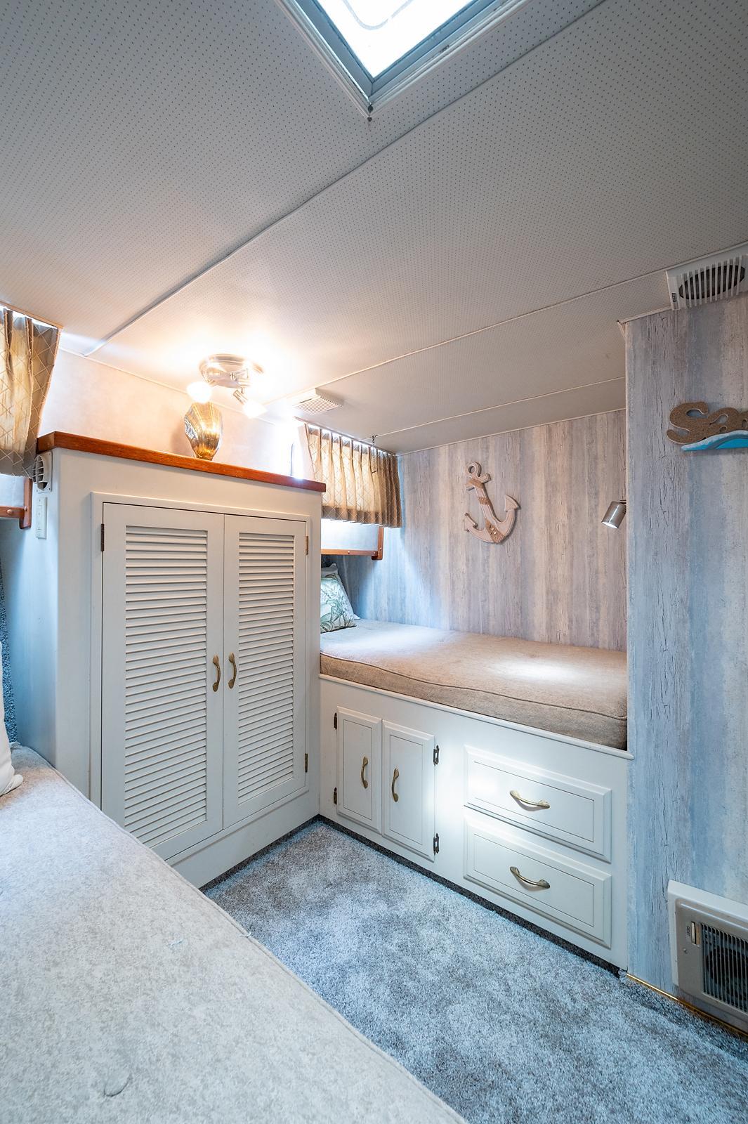 The full width master is amidships with a centerline queen, nightstands, and expansive in-line drawer storage/counter space to port that curves forward into the lighted vanity; to starboard are hanging lockers, tall drawer storage and the private head with shower. The hanging lockers and storage are ample as is the floor space in all cabins.