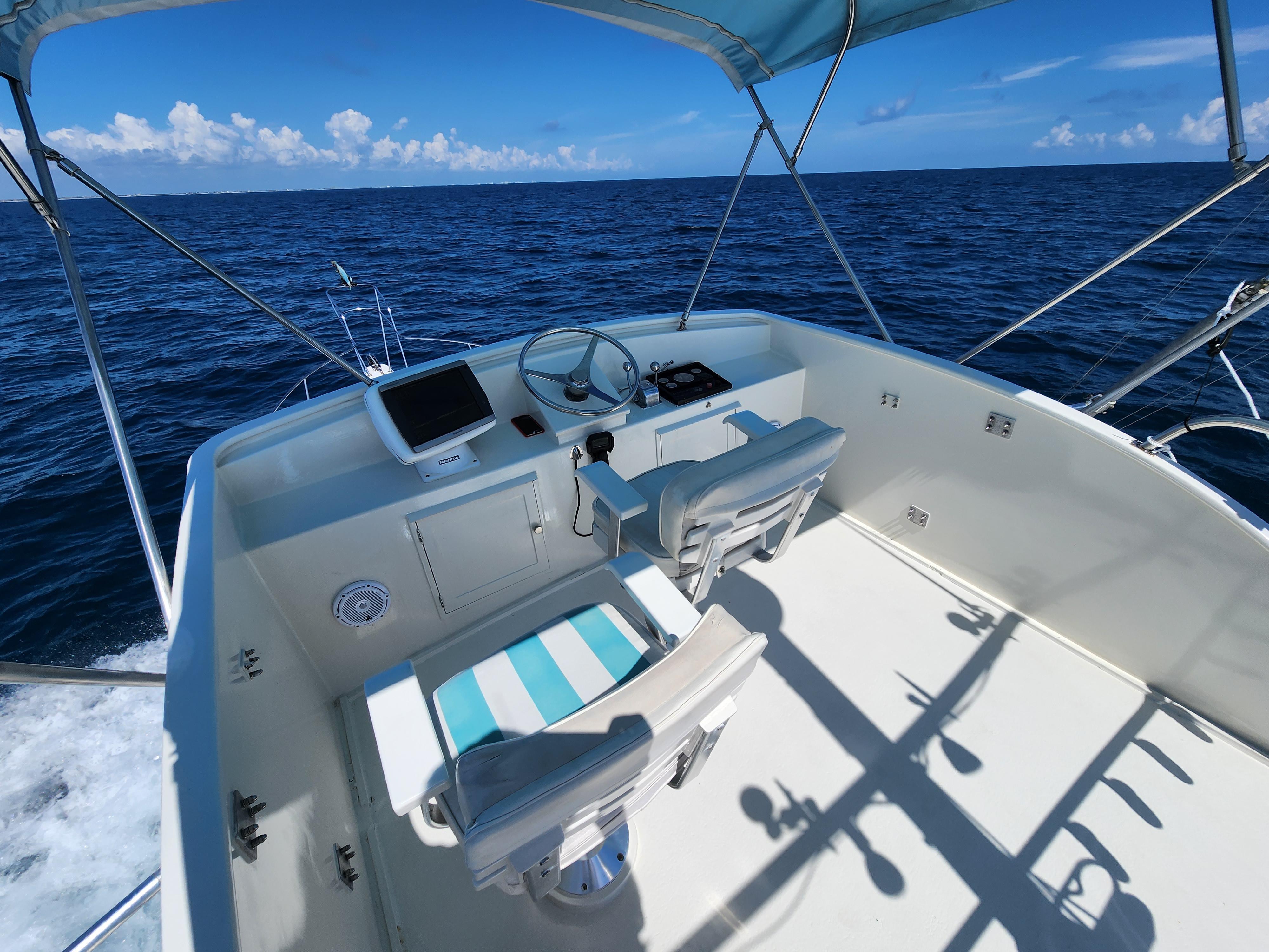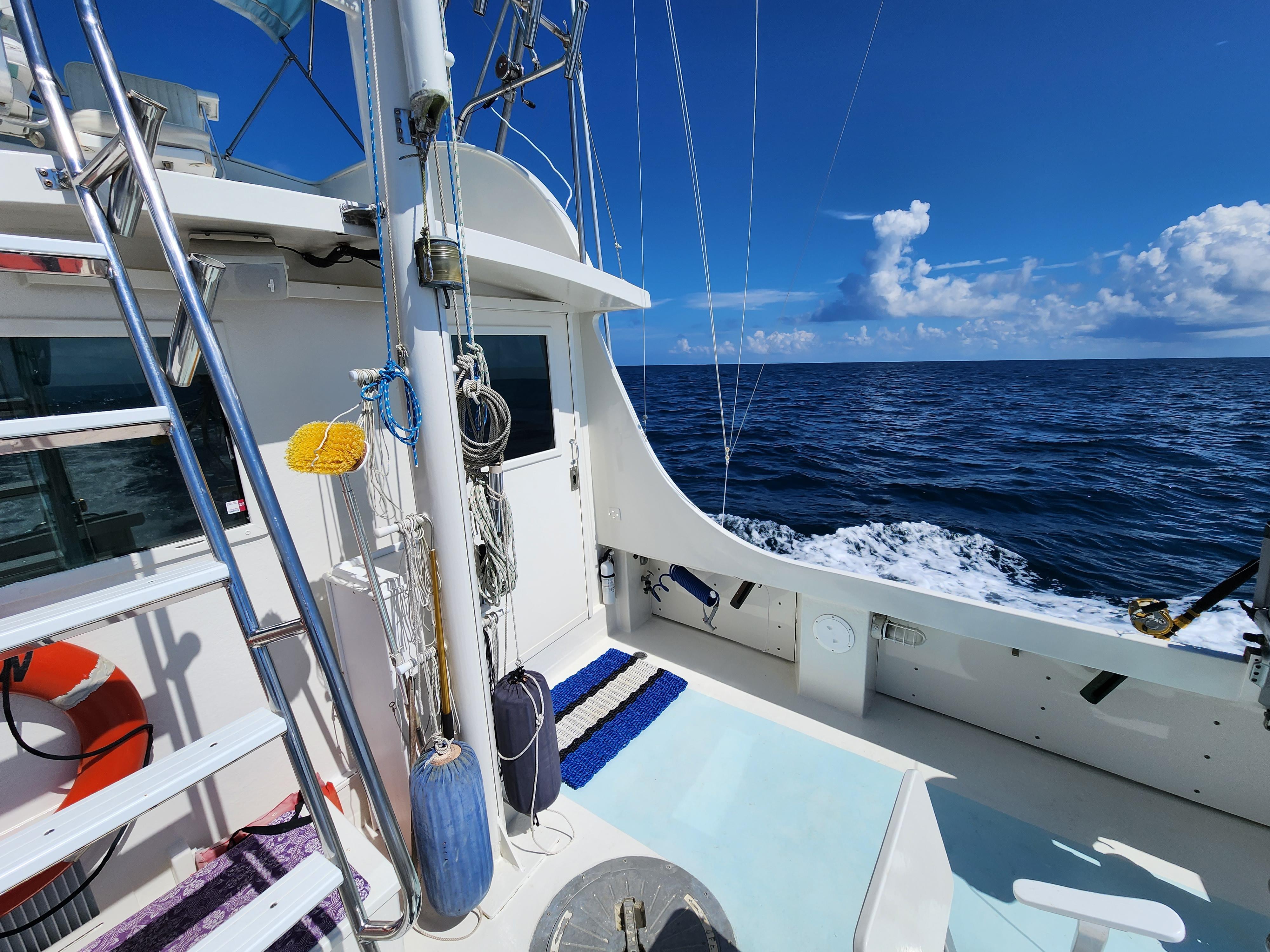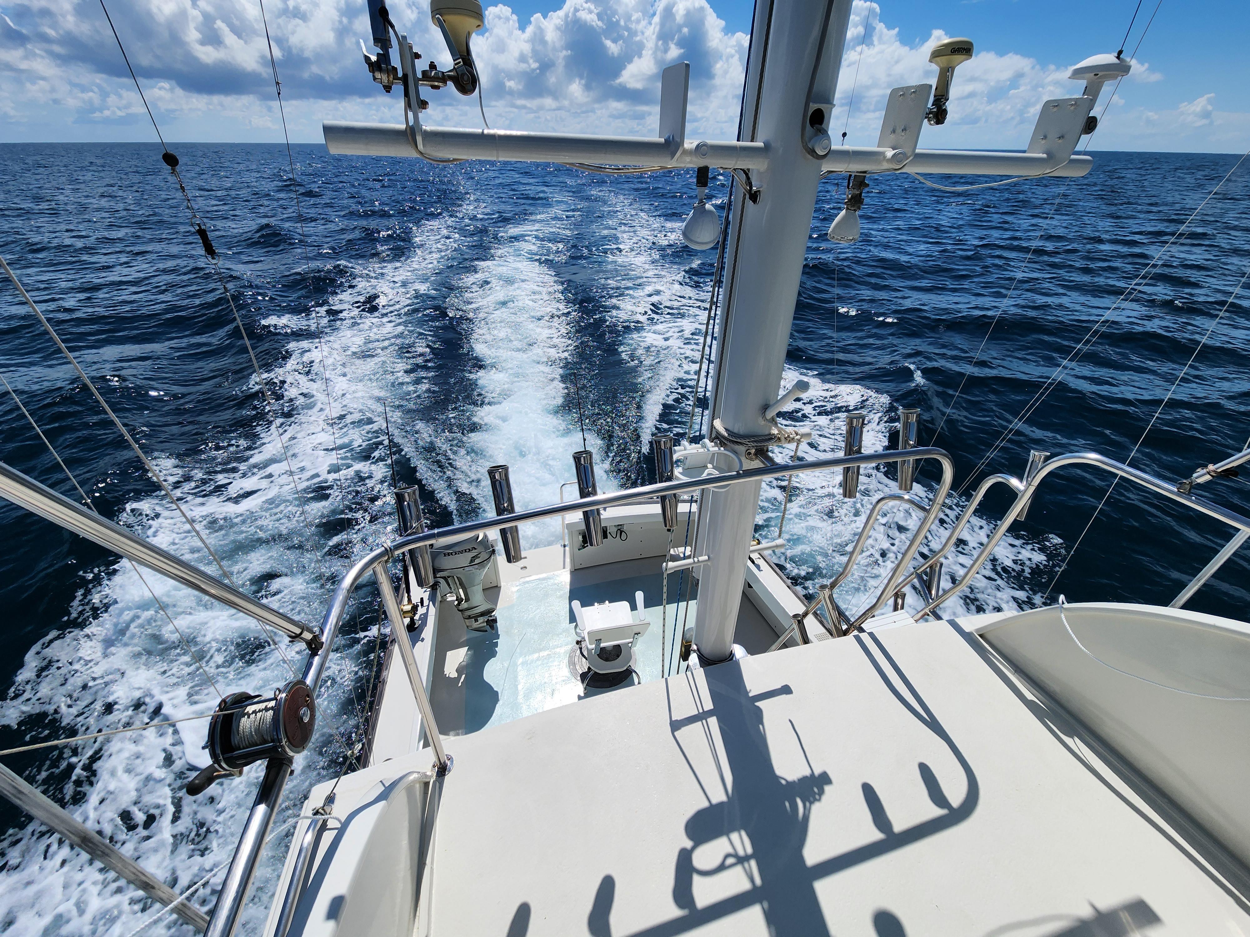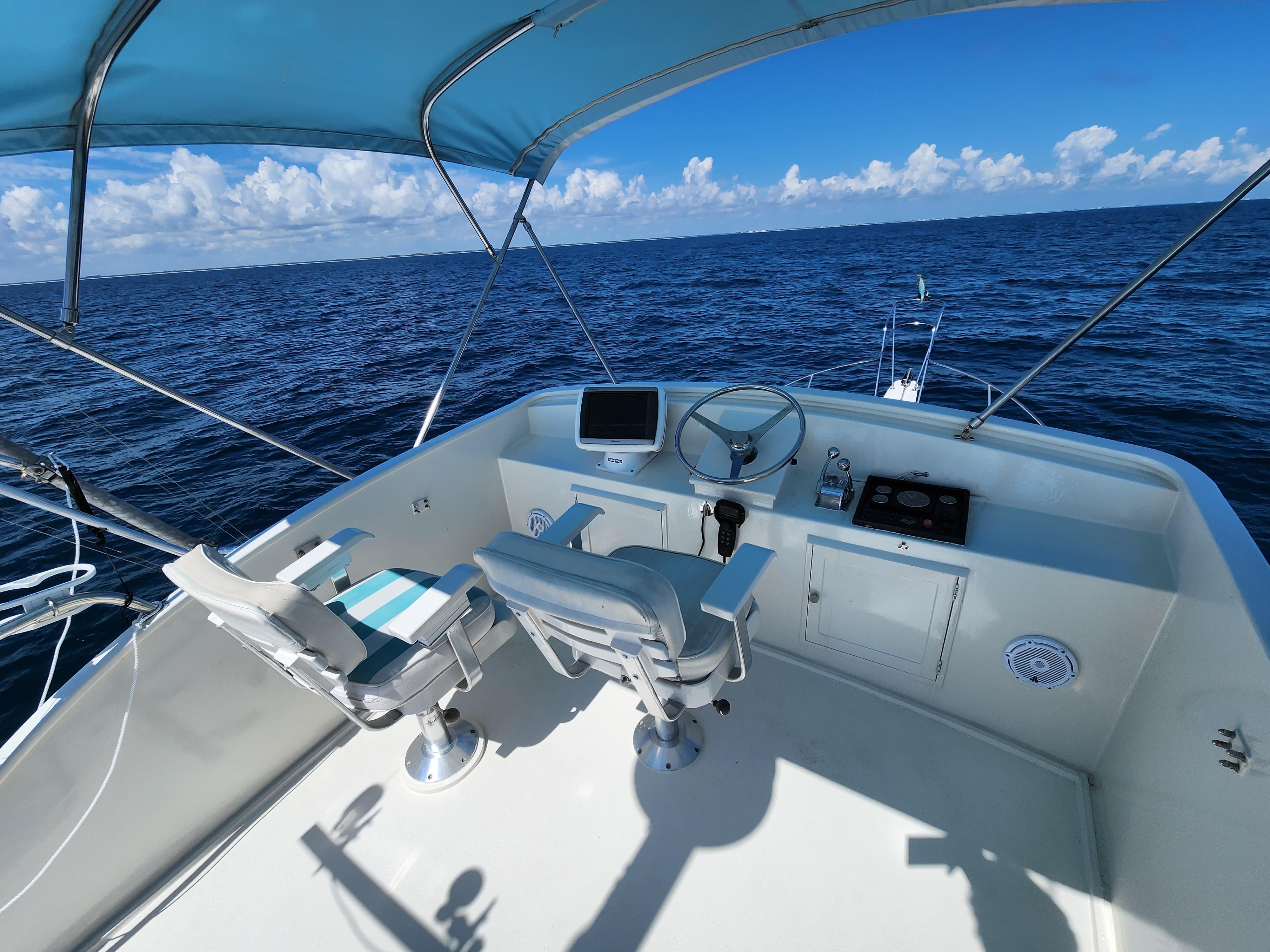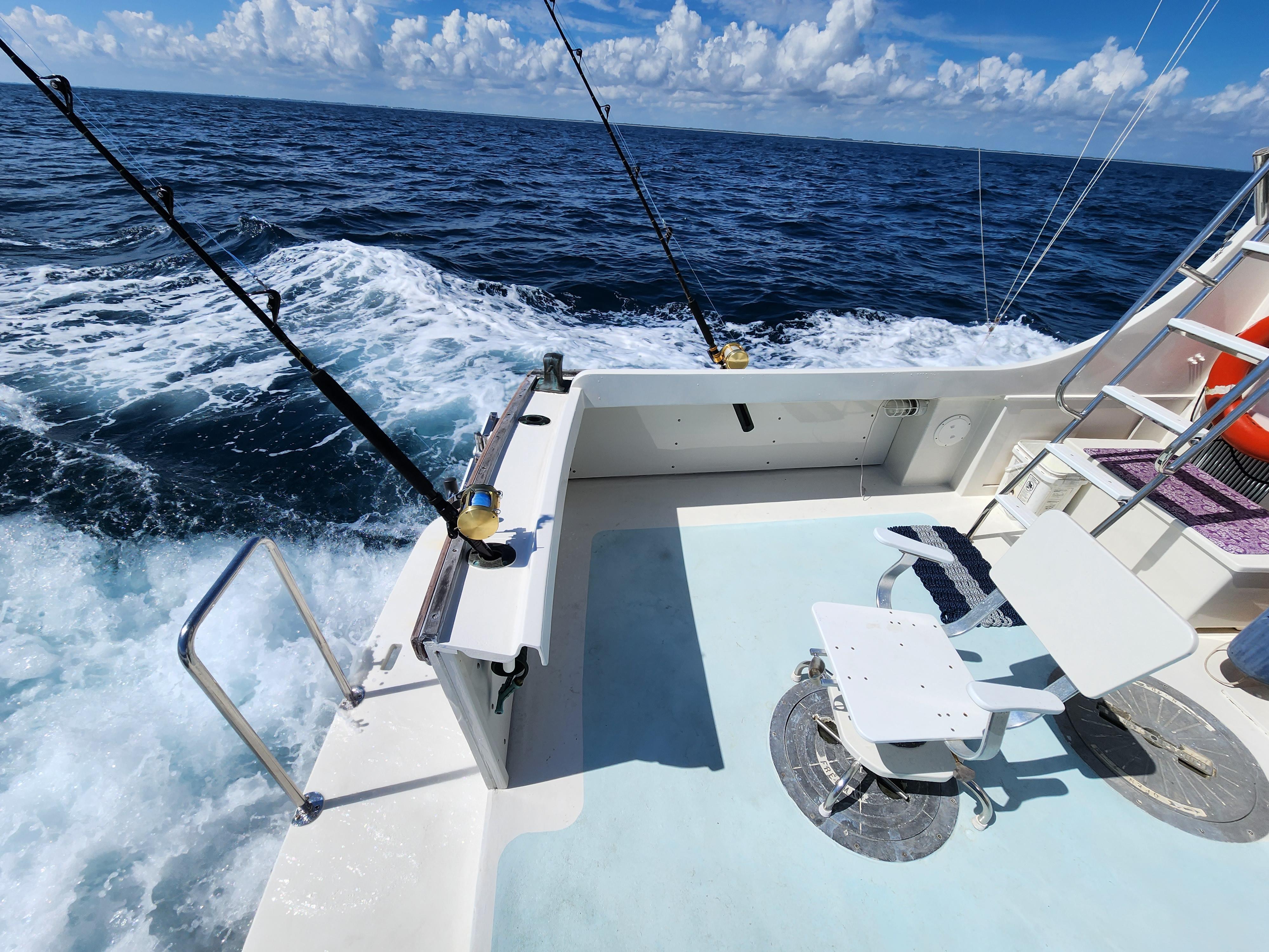2 high water alarms, 2 Rule pumps - 12v & auto, 6" Danforth compass on cabin bridge, 6 opening ports, Custom S/S swim ladder, Polished Stainless Steel handrail on swim platform, fiberglass swim platform, transom door. Custom starboard 5 drawer tackle locker in cockpit, Five bronze rod holders in Cockpit Six stainless rod holders on polished stainless steel ladder with starboard steps to bridge. Six stainless steel rod holders on stainless steel bridge railing. One portable chrome Lee rod holder on mast in cockpit Custom 5/4 teak overhead rod rack in salon for eight rods. (26 rods total) Anchor windless with controls at bow and bridge. Rupp Outriggers. Hot and cold water washdown at the transom.
