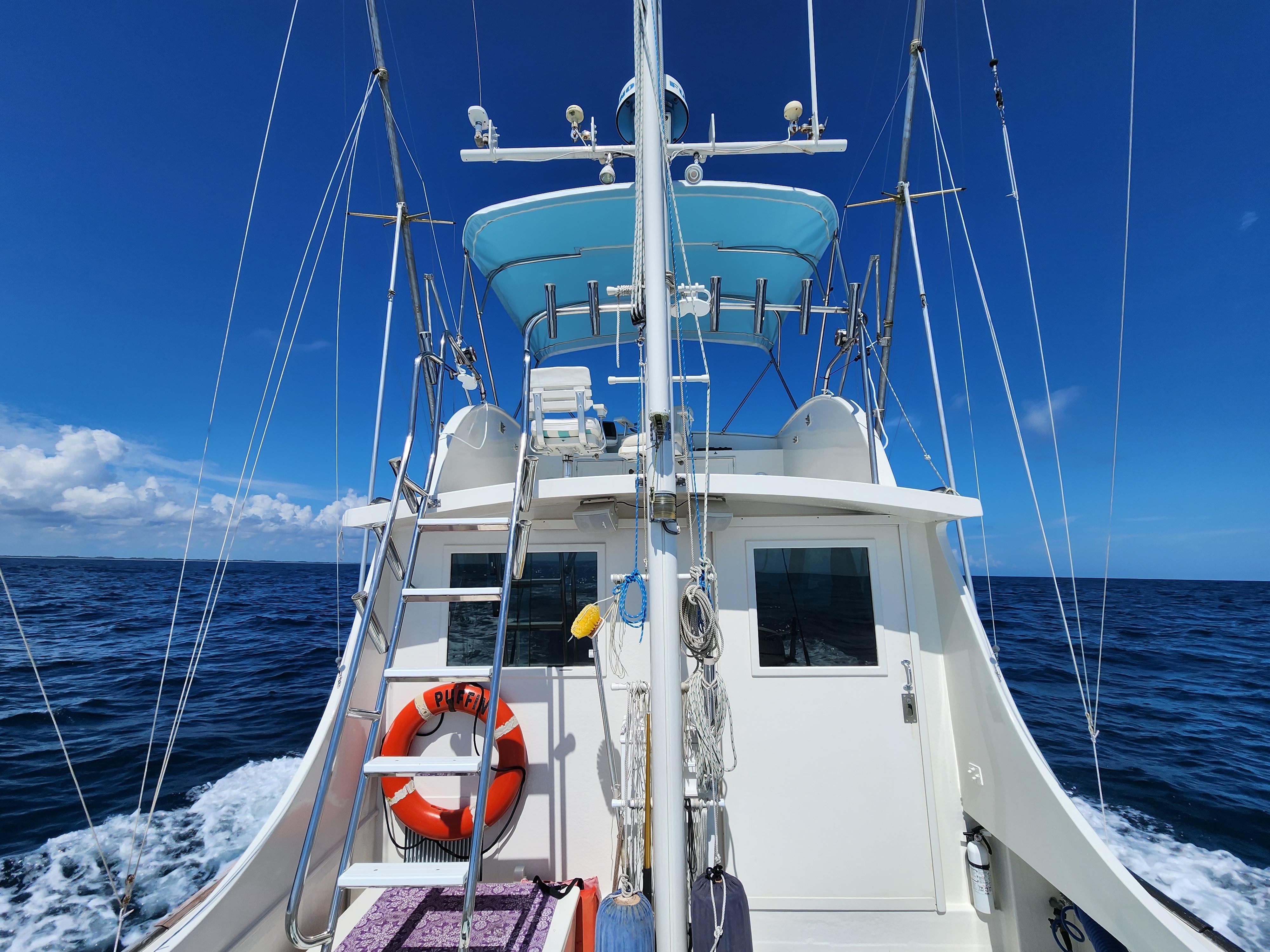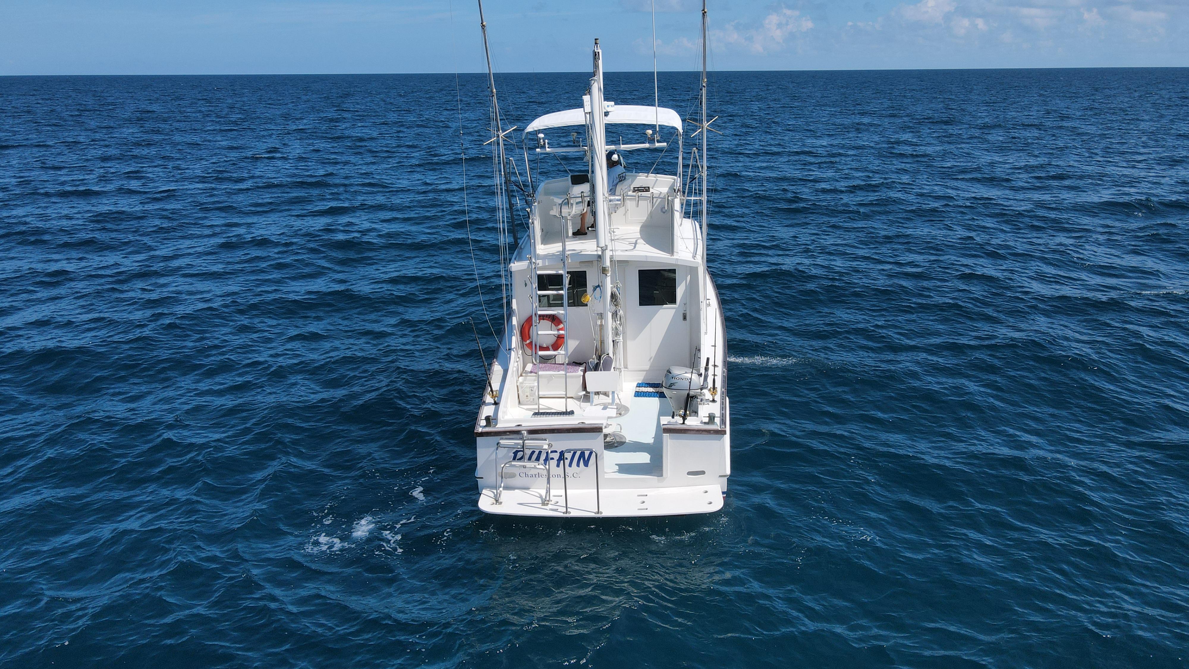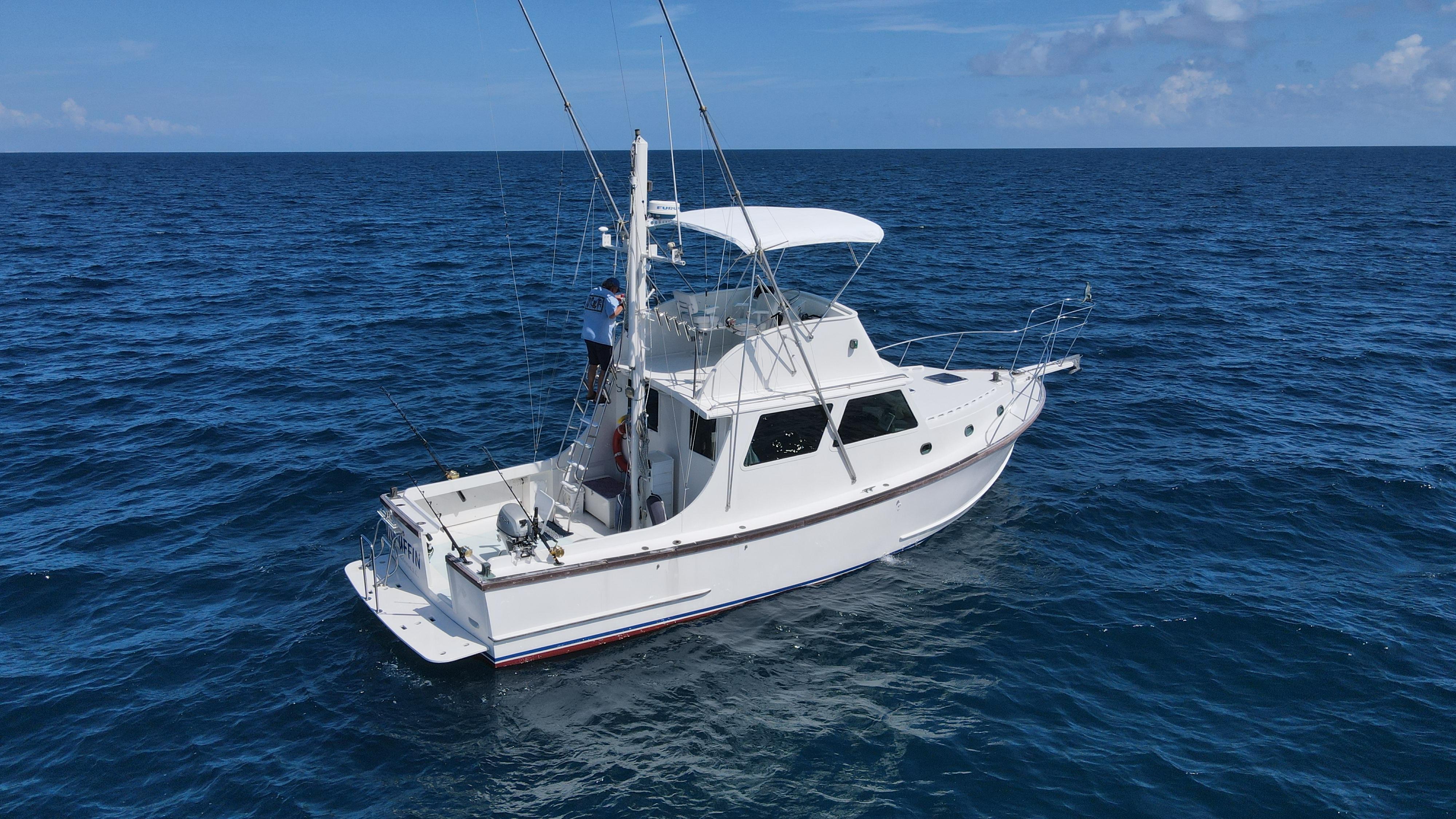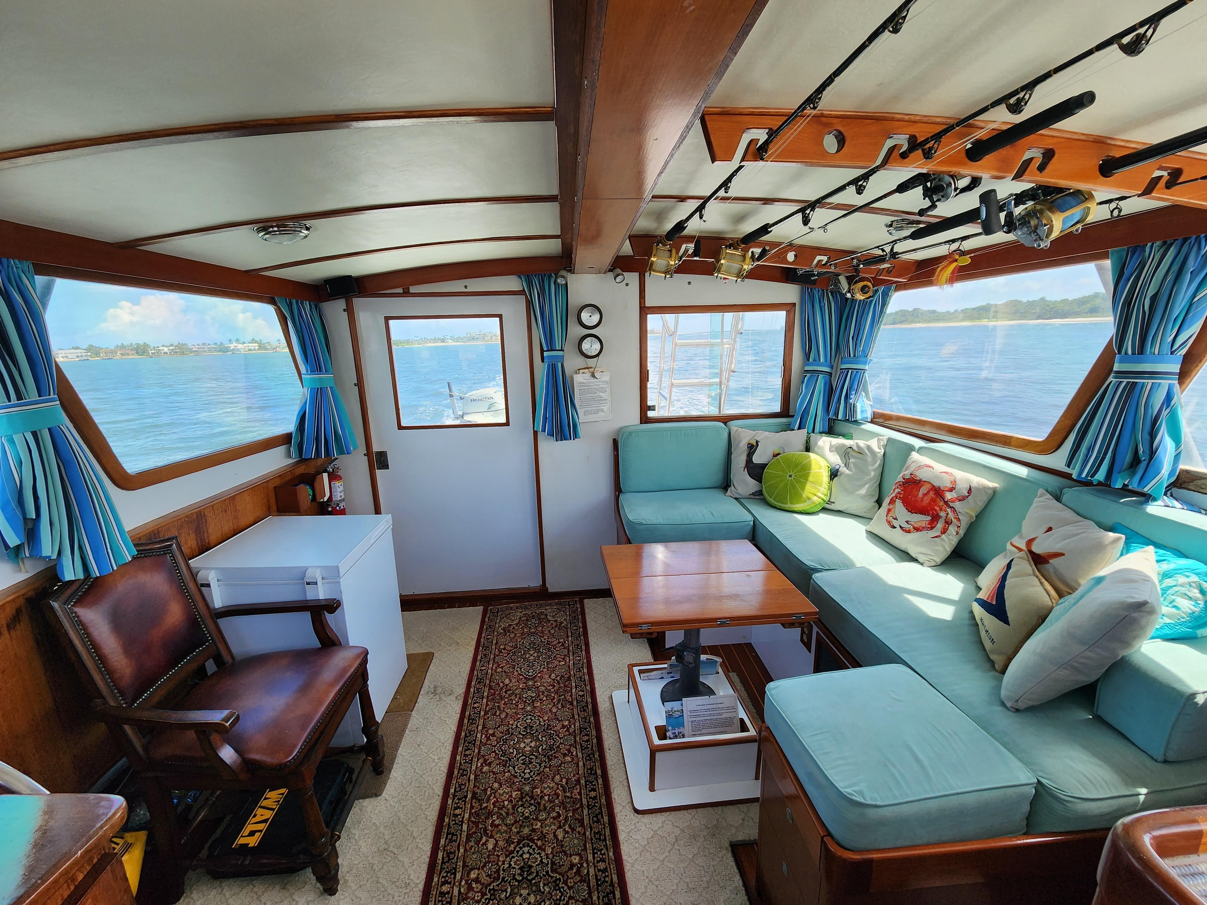 2 high water alarms, 2 Rule pumps - 12v & auto, 6" Danforth compass on cabin bridge, 6 opening ports, Custom S/S swim ladder, Polished Stainless Steel handrail on swim platform, fiberglass swim platform, transom door. Custom starboard 5 drawer tackle locker in cockpit, Five bronze rod holders in Cockpit Six stainless rod holders on polished stainless steel ladder with starboard steps to bridge. Six stainless steel rod holders on stainless steel bridge railing. One portable chrome Lee rod holder on mast in cockpit Custom 5/4 teak overhead rod rack in salon for eight rods. (26 rods total) Anchor windless with controls at bow and bridge. Rupp Outriggers. Hot and cold water washdown at the transom.