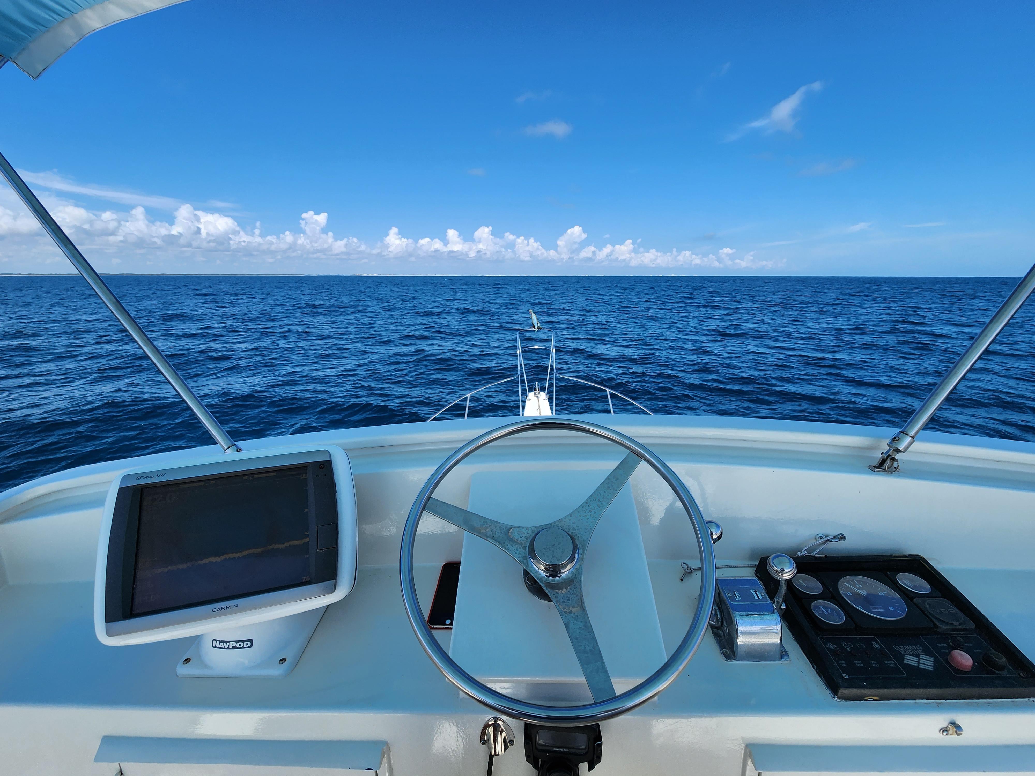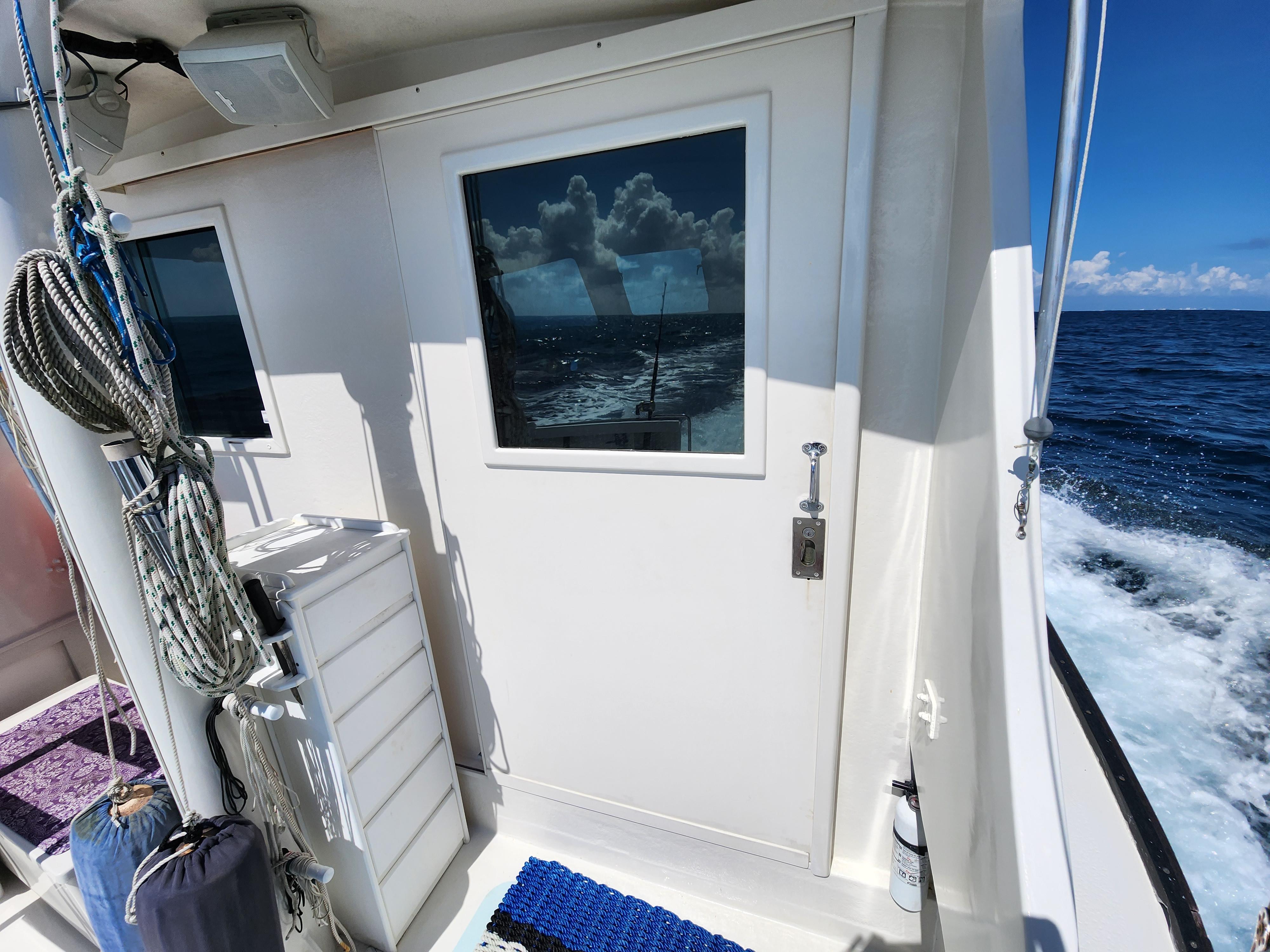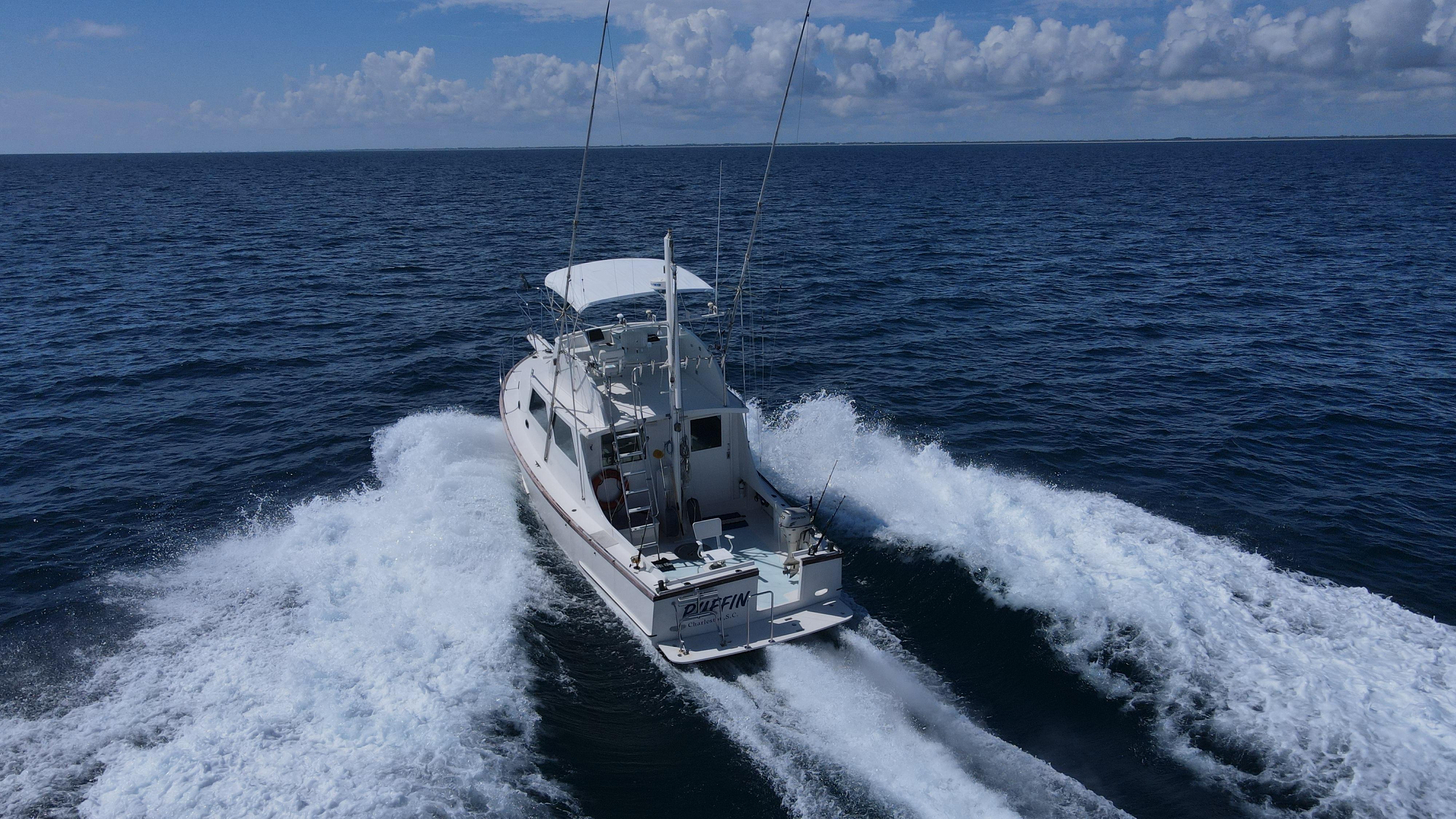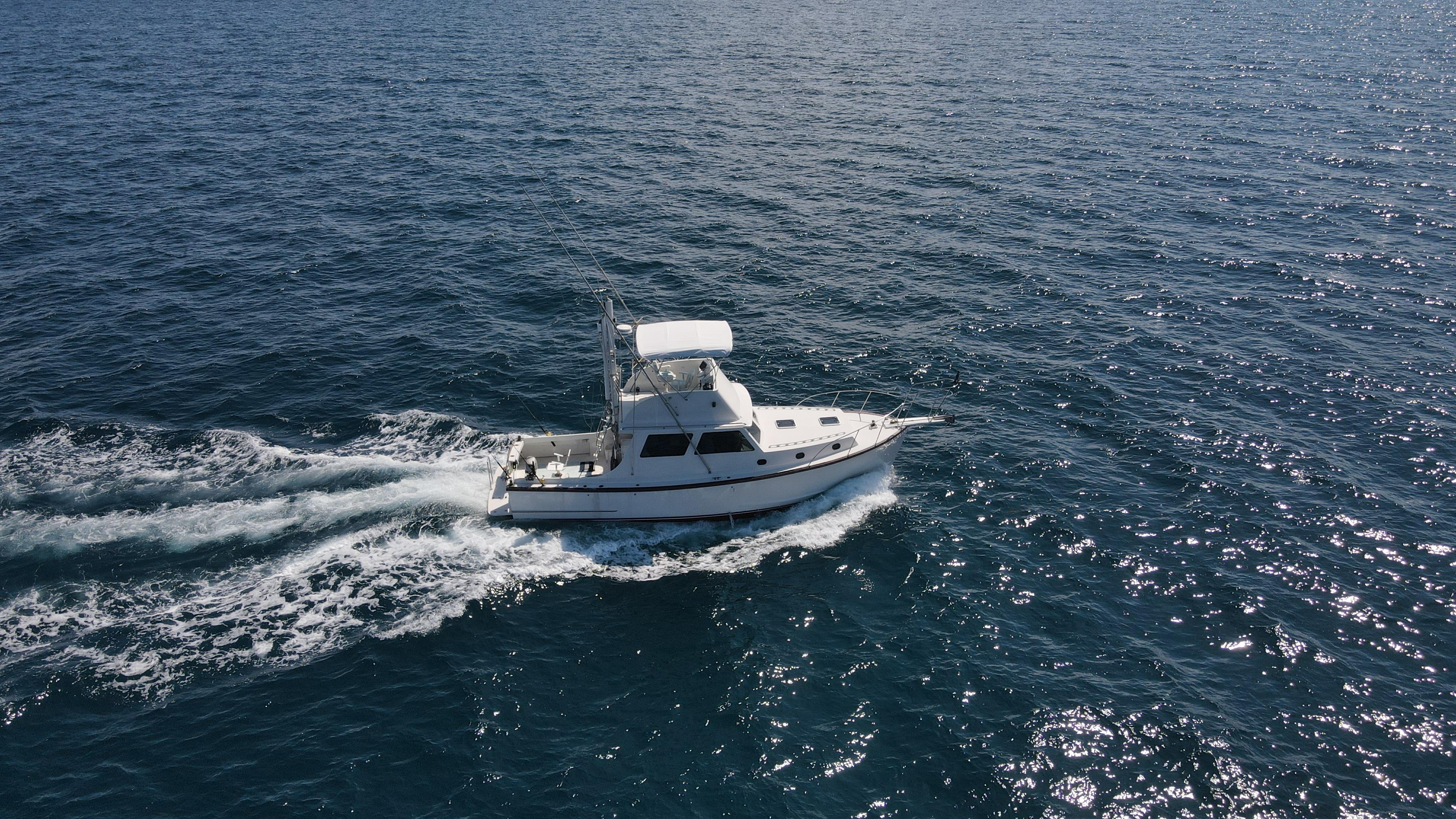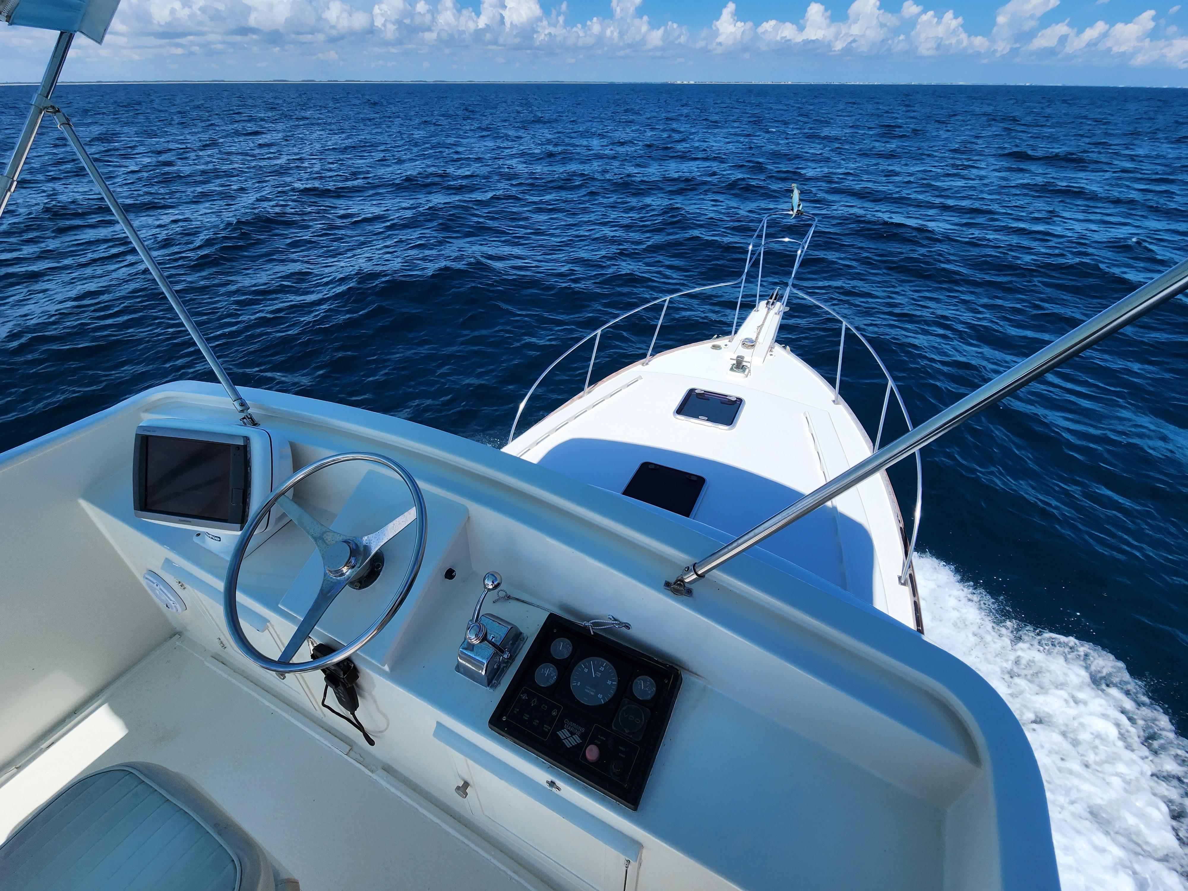 2 high water alarms, 2 Rule pumps - 12v & auto, 6" Danforth compass on cabin bridge, 6 opening ports, Custom S/S swim ladder, Polished Stainless Steel handrail on swim platform, fiberglass swim platform, transom door. Custom starboard 5 drawer tackle locker in cockpit, Five bronze rod holders in Cockpit Six stainless rod holders on polished stainless steel ladder with starboard steps to bridge. Six stainless steel rod holders on stainless steel bridge railing. One portable chrome Lee rod holder on mast in cockpit Custom 5/4 teak overhead rod rack in salon for eight rods. (26 rods total) Anchor windless with controls at bow and bridge. Rupp Outriggers. Hot and cold water washdown at the transom.