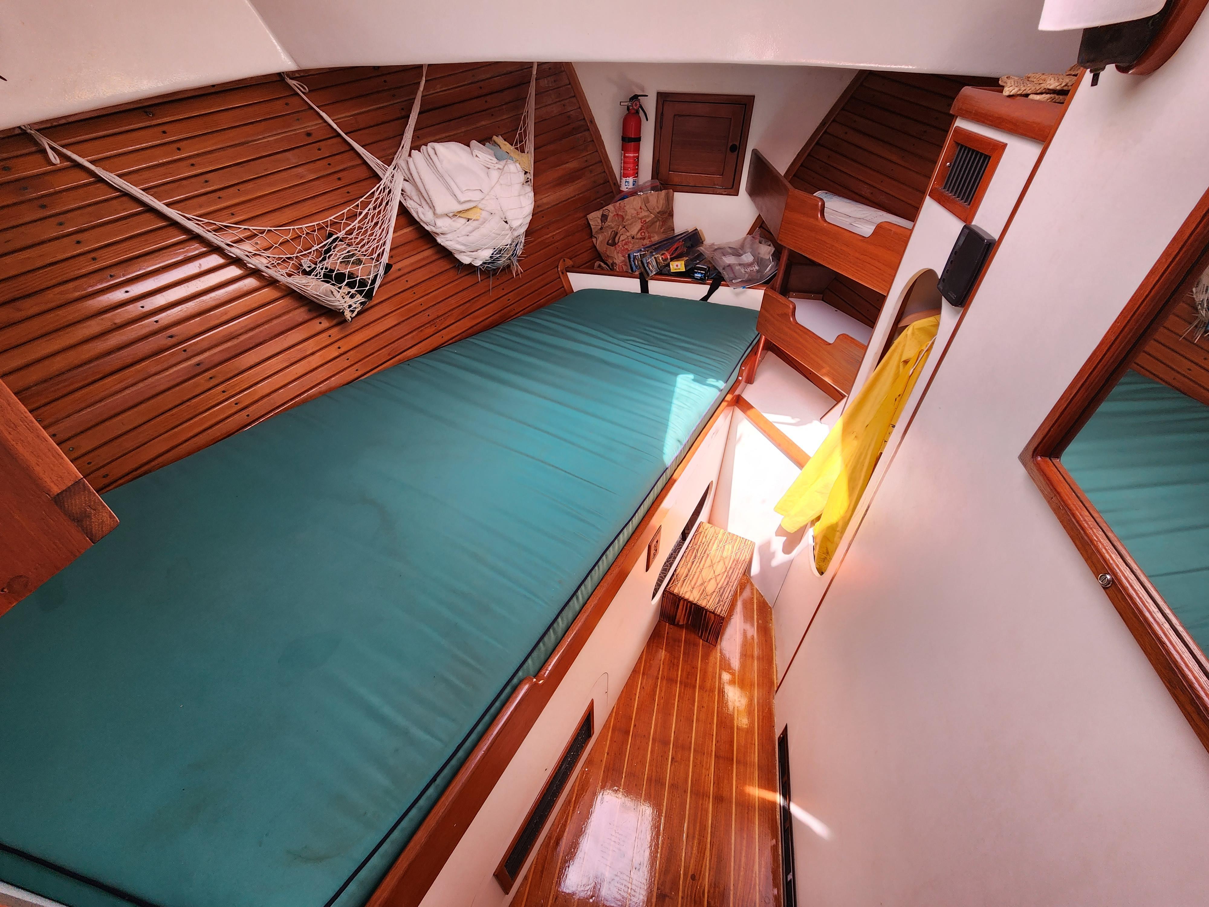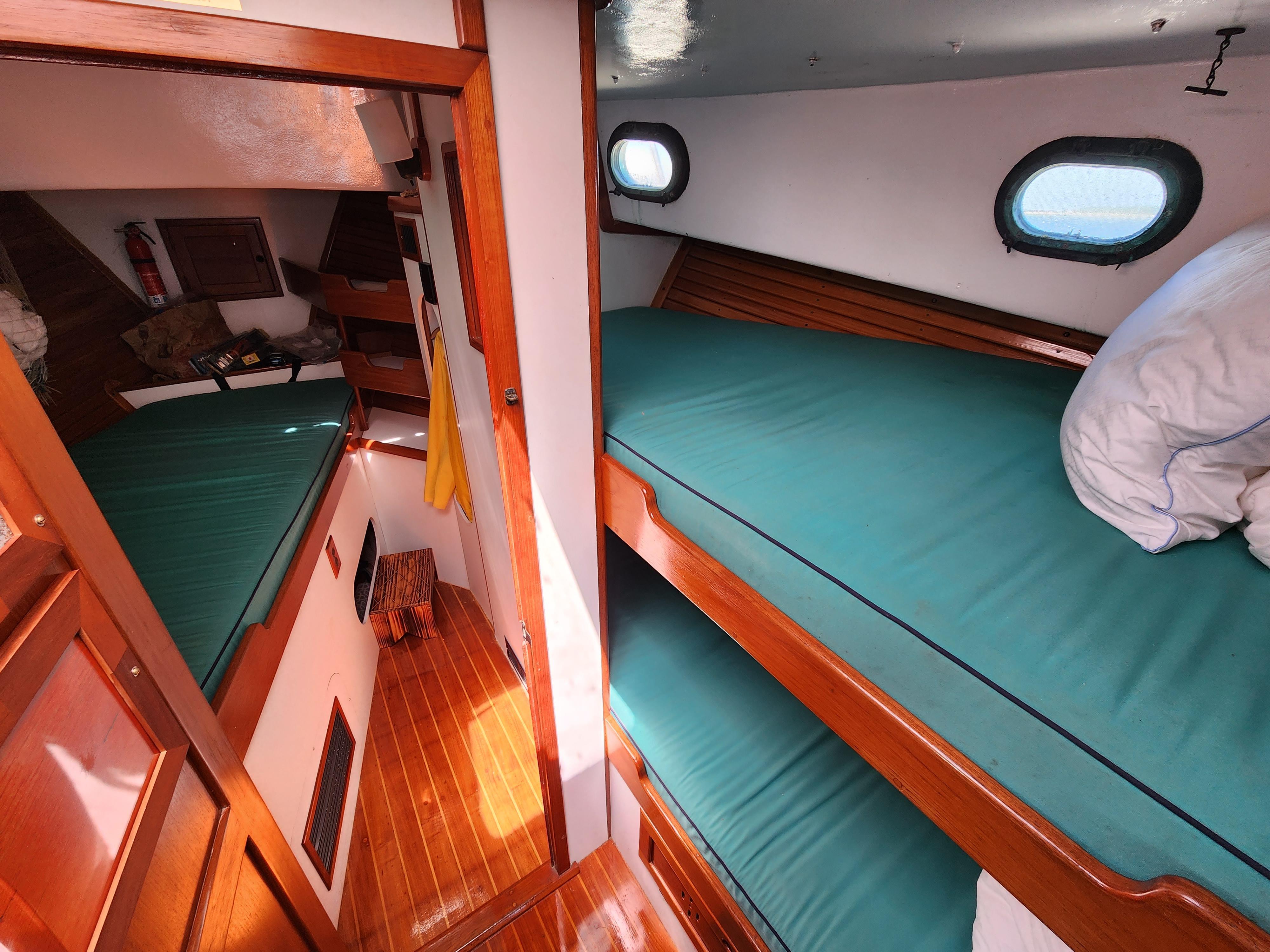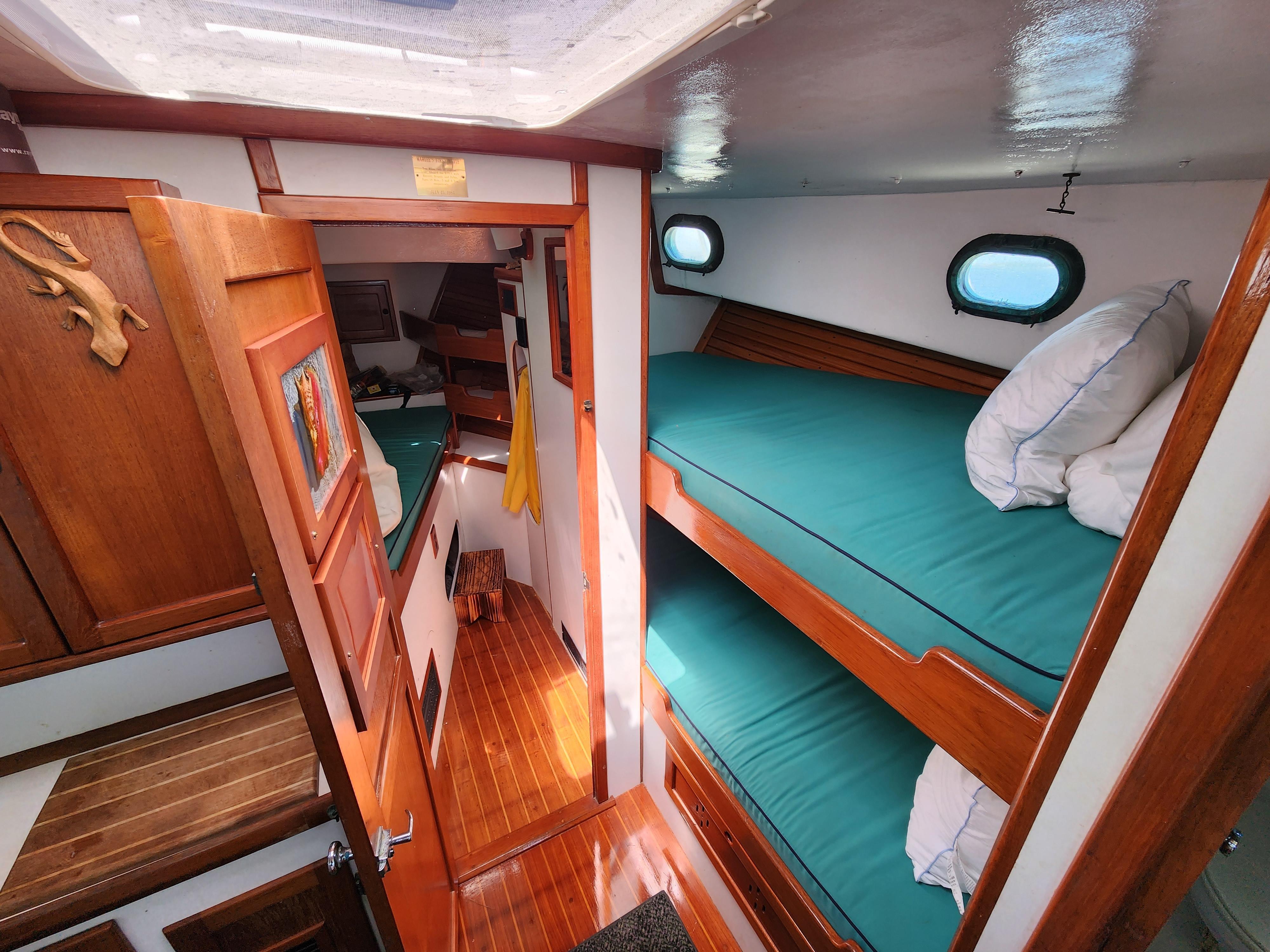 Sleeps 6. Forward cabin has a double berth to port with lockers and storage opposite. Aft to starboard are large upper and lower bunks. Next aft to starboard is the head with wand shower, and manual head. Step up to the main salon with a spacious convertible dinette and drop leaf table and various chairs. To starboard is a helm station. All the interior joiner work is varnished teak and formica with teak and holly soles.