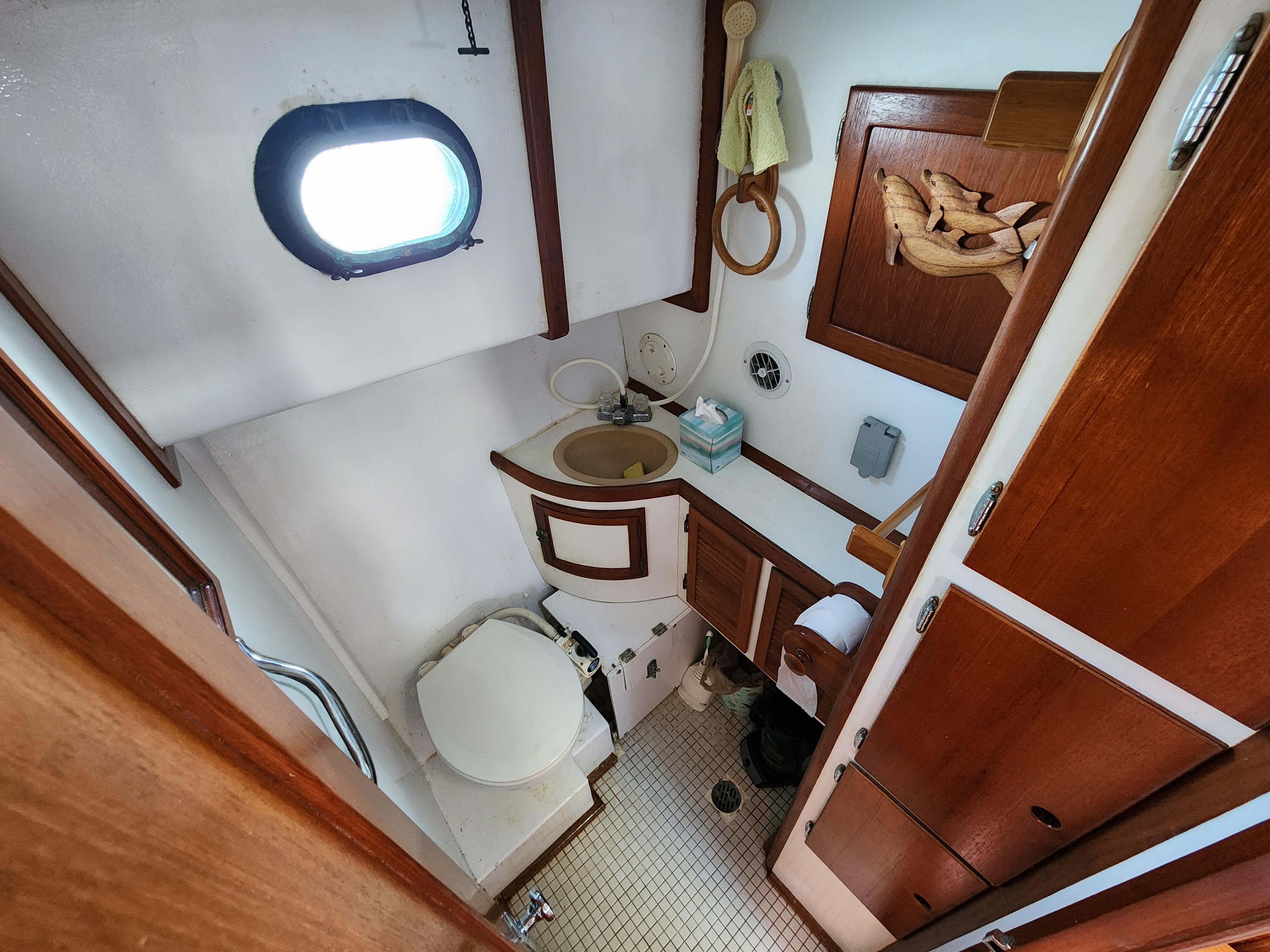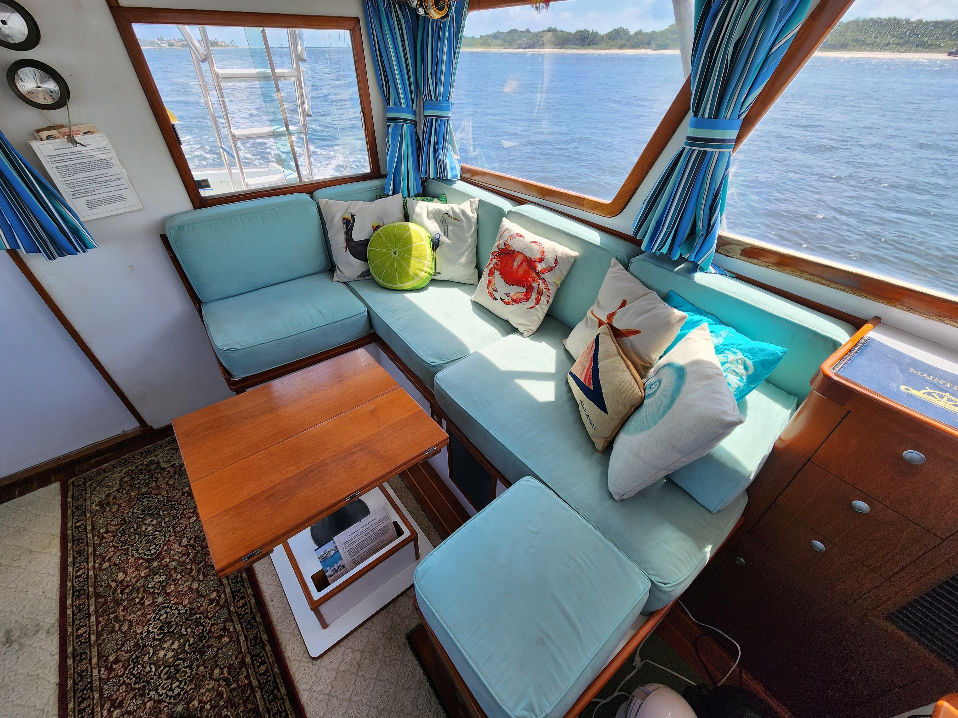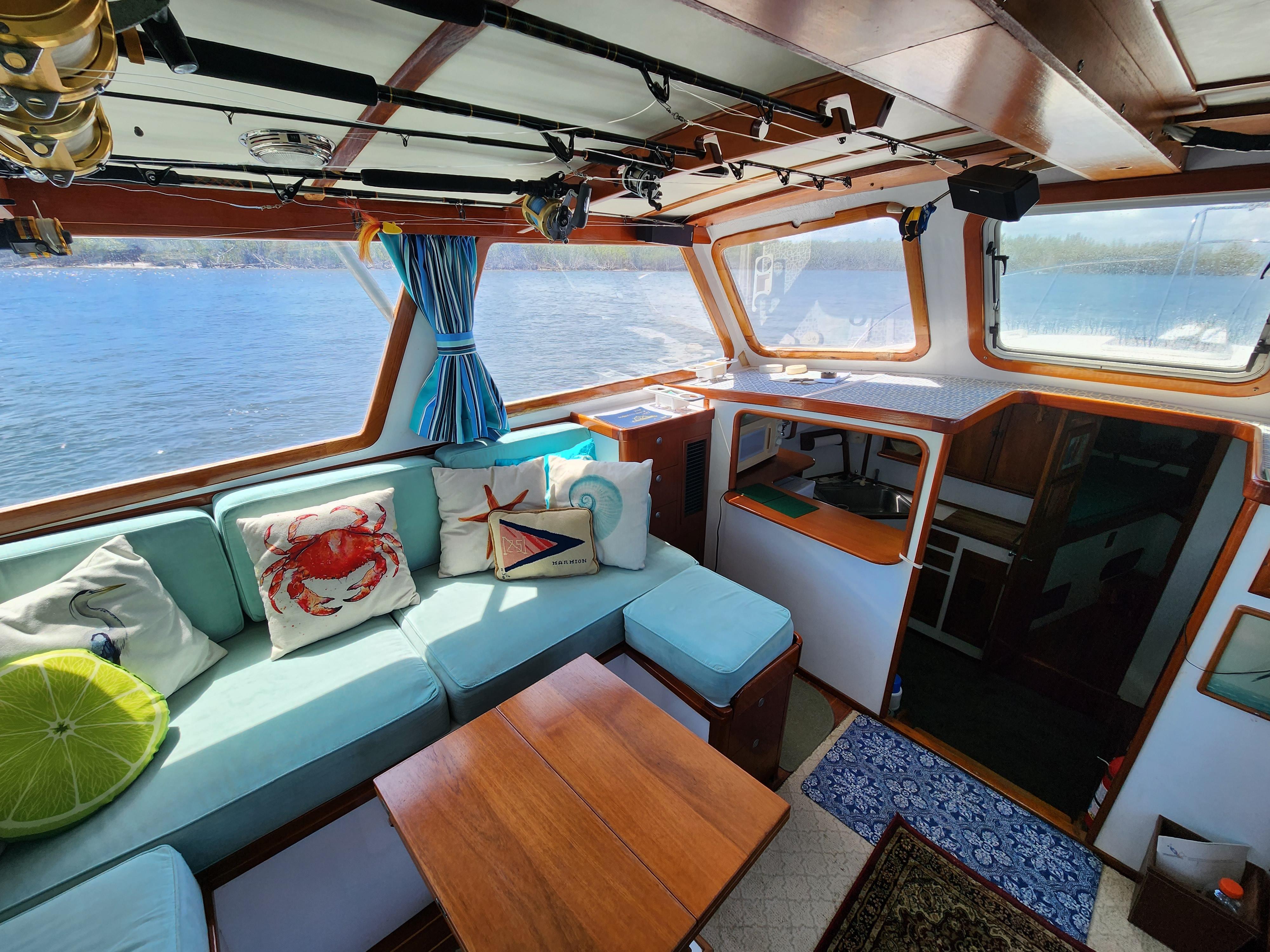 Sleeps 6. Forward cabin has a double berth to port with lockers and storage opposite. Aft to starboard are large upper and lower bunks. Next aft to starboard is the head with wand shower, and manual head. Step up to the main salon with a spacious convertible dinette and drop leaf table and various chairs. To starboard is a helm station. All the interior joiner work is varnished teak and formica with teak and holly soles.