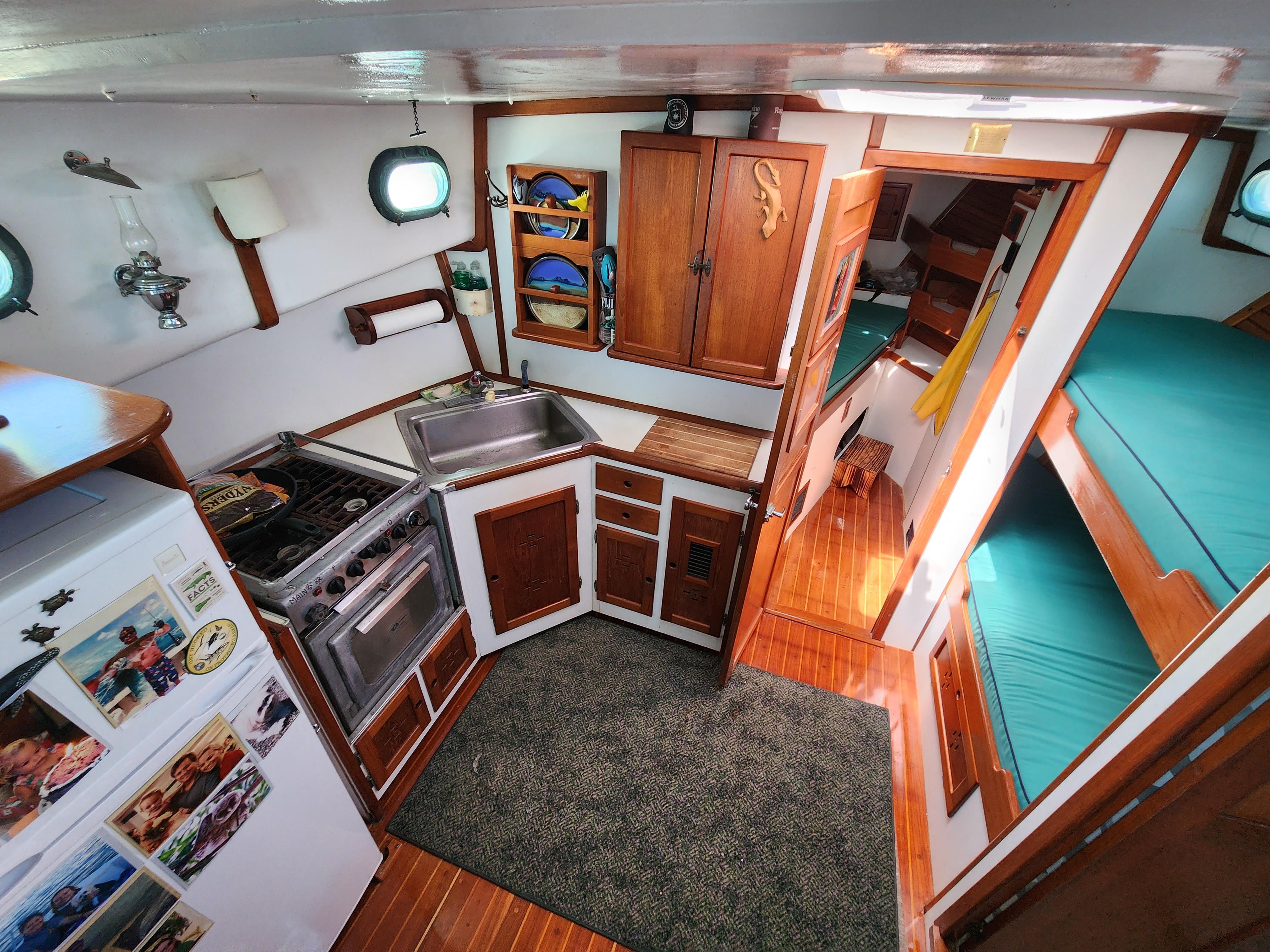 The L-shaped galley consisting of Shipmate propane 4 burner stove. Sunbeam microwave oven. 200 gallons of water in four equal plastic tanks under cockpit, all valved, with filter mounted in engine room. 6-gallon 110v. hot water heater.