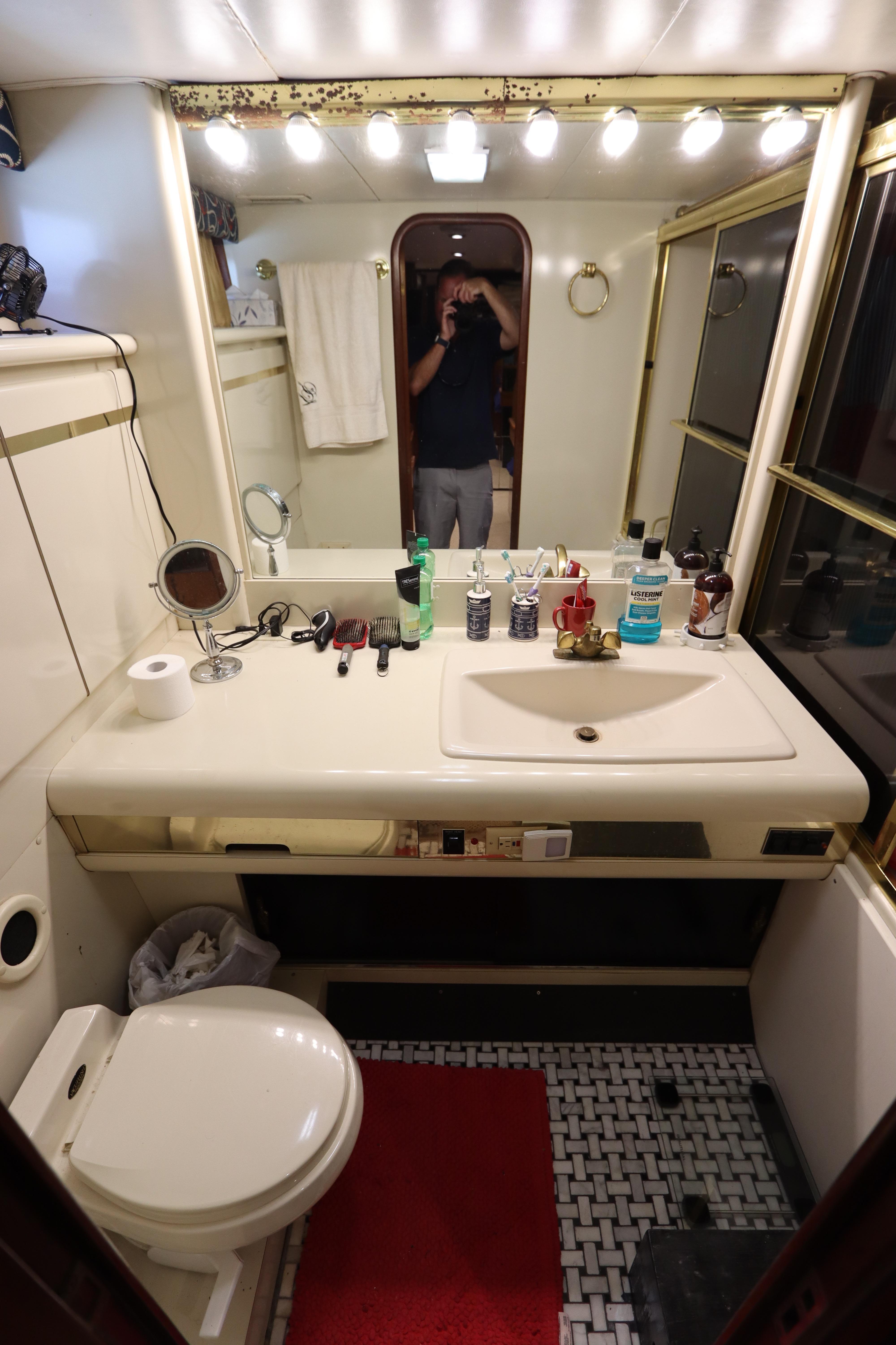 Going aft you will find a jewel of a Master Stateroom. Standing at the door looking back into the room you will see on the Starboard side pull out selves covered by a mirrored doors with a new mini refrigerator at the bottom. An “L” shape Closet is in the corner following aft down the wall with teak built in cabinets with drawers. The cabinets go all the way down the starboard wall to the door to the Starboard Head. To the right of the entry door to the stateroom are more closets all the way over to the Port wall. The Port wall starts out with bench seat that has bed covered in a nautical fabric pattern. More cabinets run down the Port walls as it does to Starboard ending at the Port Head. Yes, there are TWO Heads in the Master Stateroom ….his and hers….with a Large Jacuzzi Tub/Shower separating them that will fit both Him and Her. New black Granite and white Marble tile floors are at you feet. The King size bed has a new mattress that can be turn over for a different firmness. Above the bed is a framed in area that has lights and Mirrors. At the foot of the bed a custom made desk is made to sit on top of two file drawers. Needless to say there is a Stereo and TV for your entertainment.