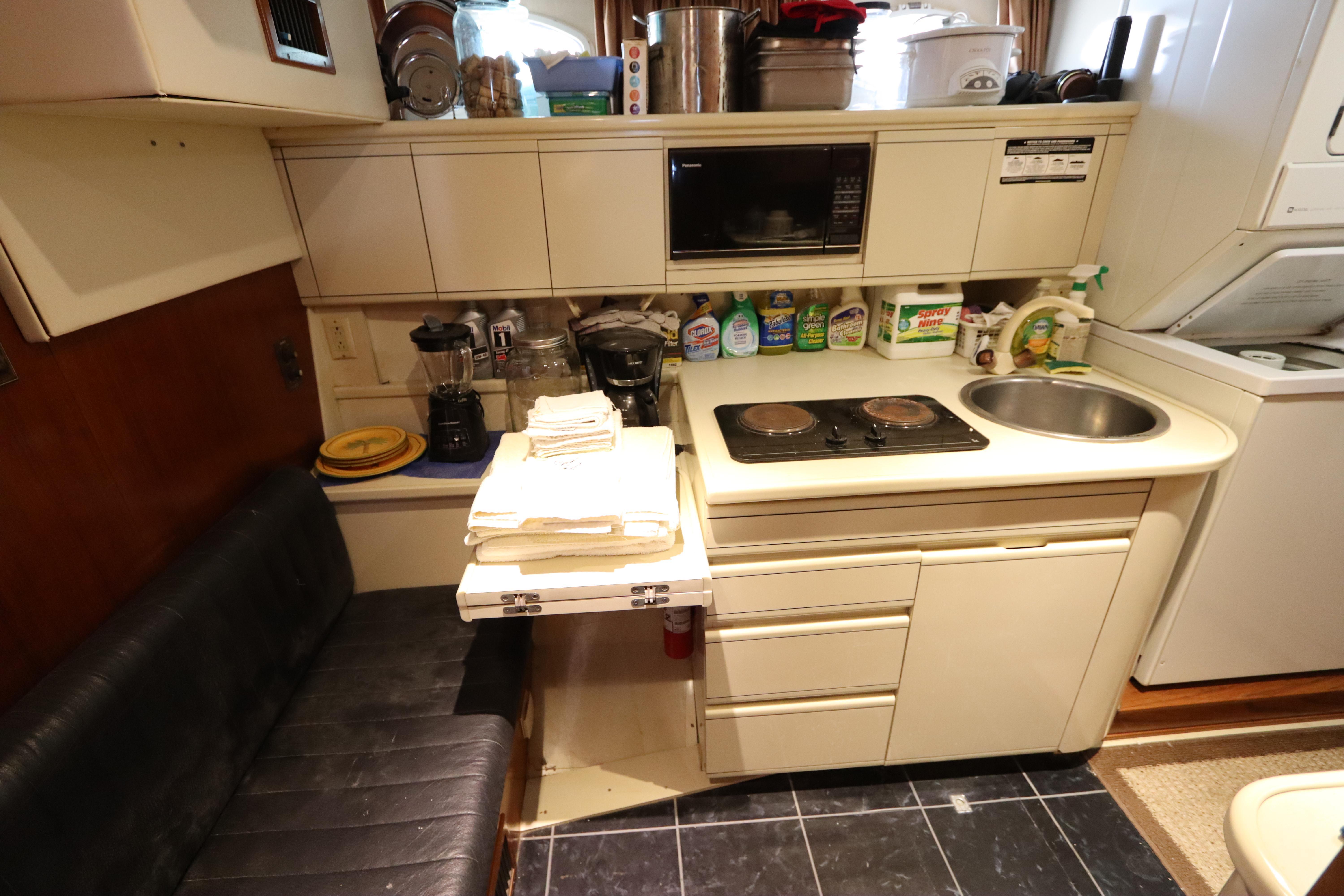 Taking a left from the door you entered into the Pilothouse puts you in the main Galley. The Galley has everything you would expect in a quality yacht with storage on the starboard wall along with Microwave, Oven, Dishwasher, and Refrigerator with ice and water in the door. Corian “U” shape counter top with cabinets on Port wall and Pilothouse wall. The 3 section sink is on the counter under the pass through opening into the Dining room. This opening has a Quartz shelf just above the sink. Looking through the opening looking aft you see the Dining room and Teck built in storage coming from the Port wall. In this cabinet you will find a new Denon Stereo system with Blue Tooth and access to the Satellite TV. There is a Wine rack is also on Port wall.