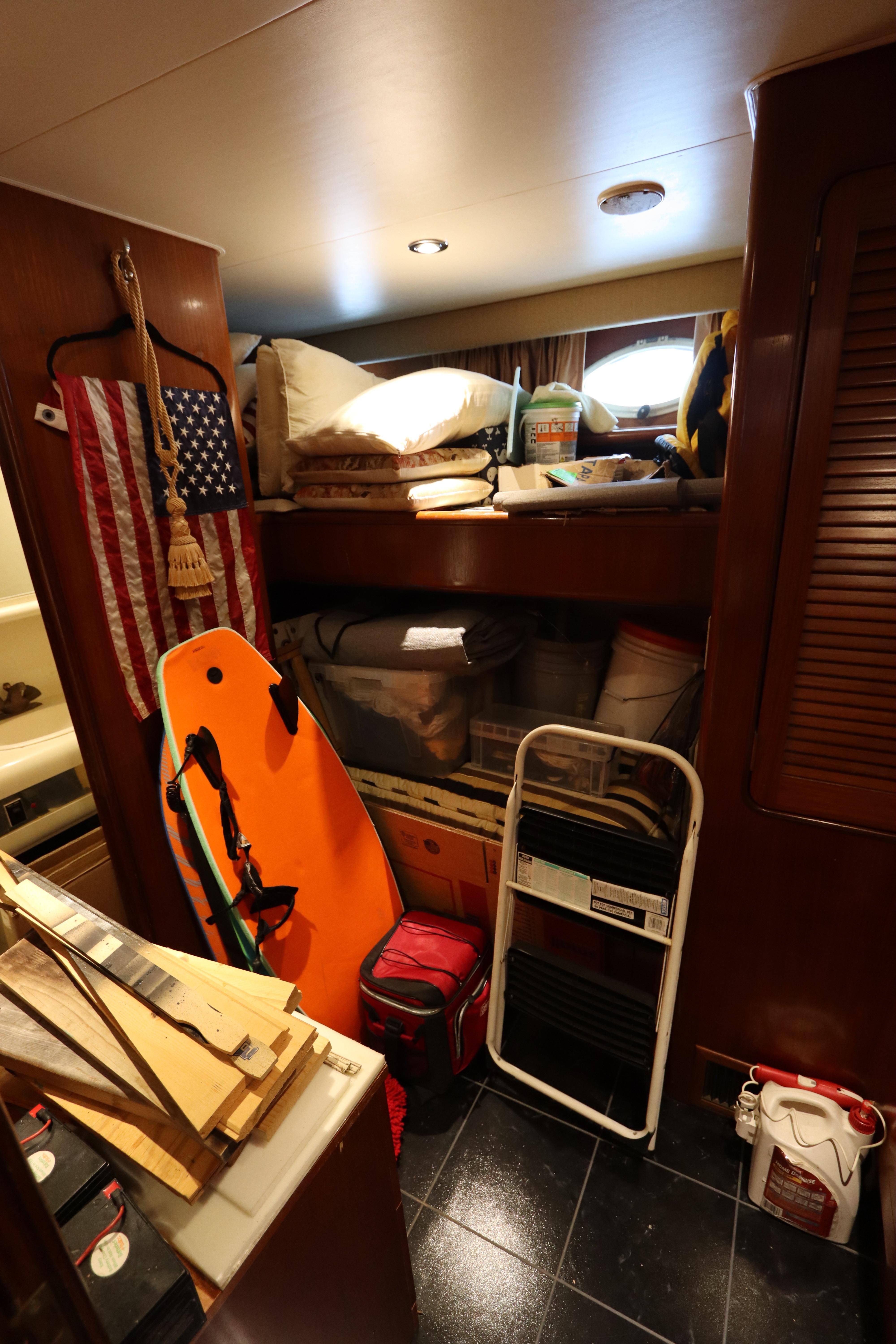 Going back out of the VIP room you go aft through the door into the Second Galley (on Starboard side of Yacht). There is a bench seat with a table as well as two burner Stove and Microwave. Going further on that side there is a SS Sink and stackable Washer and Dryer. Small Refrigerator is across from the sink. At the end of the Galley toward the aft of the boat there is a sound proof door to the Engine room. There is another door to the right as you come into the Galley where you will find the Crews quarters bunk Beds. Lots of storage is in this Stateroom as well a full private Head. Custom shelves have been made to store parts and tools.