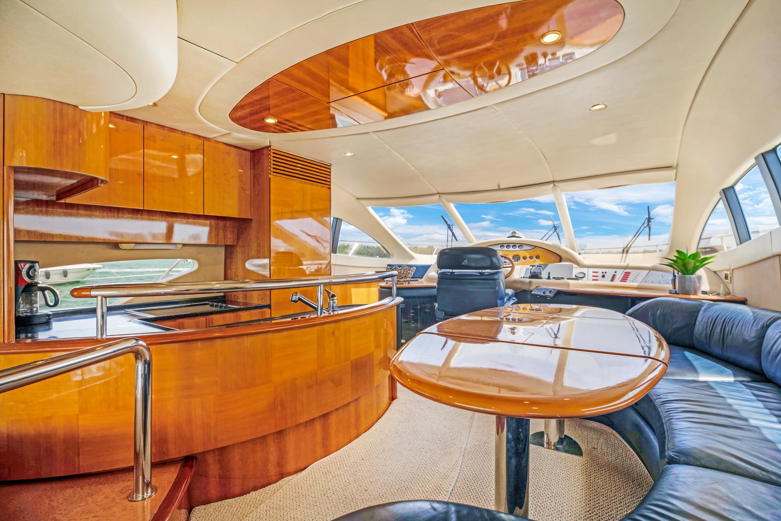 The flybridge has many amenities: stairs from the lower cockpit, wet bar with a sink, grill, refrigerator, storage, large seating area with sun pad, center table with life jacket storage cabinet, upper helm, and radar arch with bimini top.