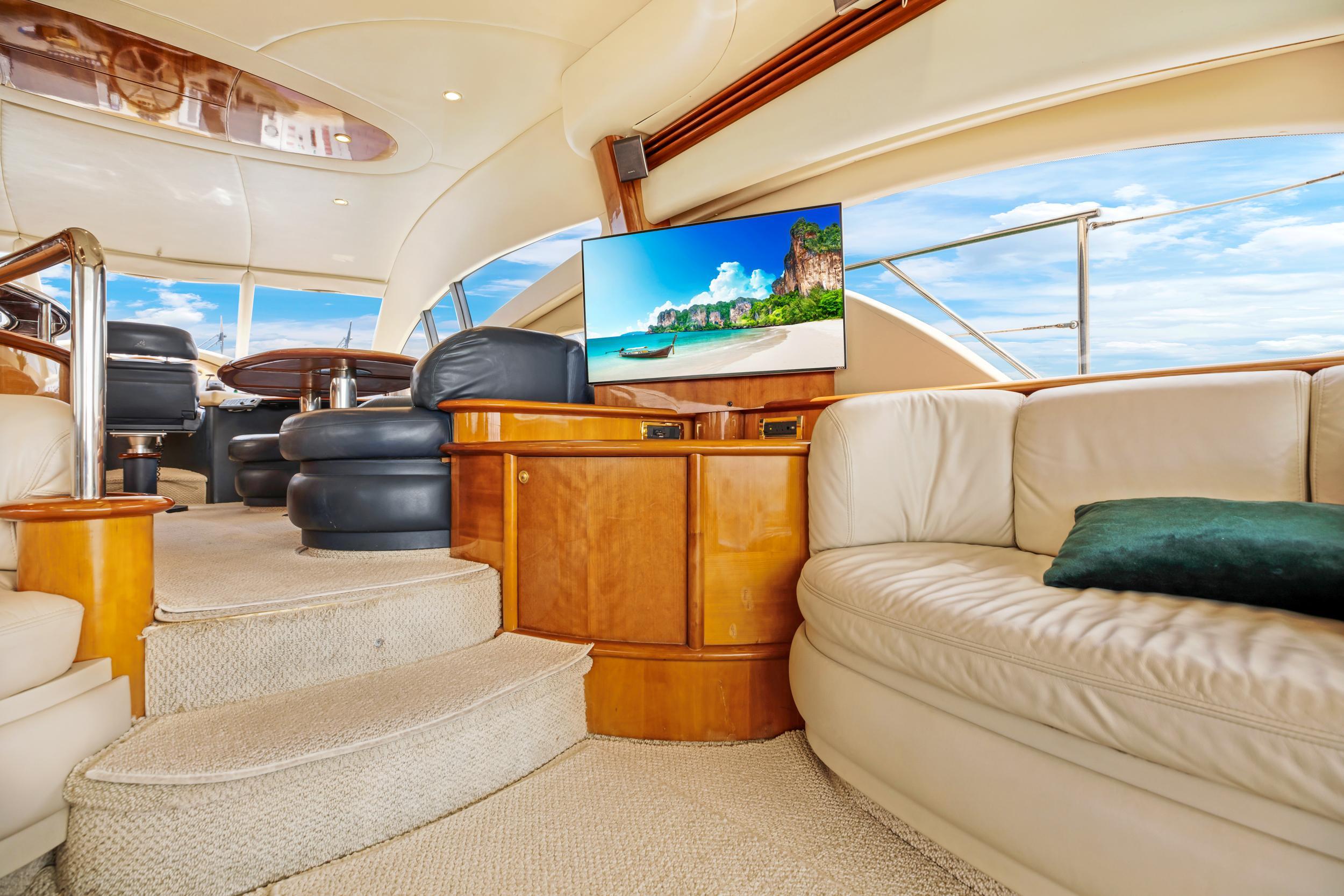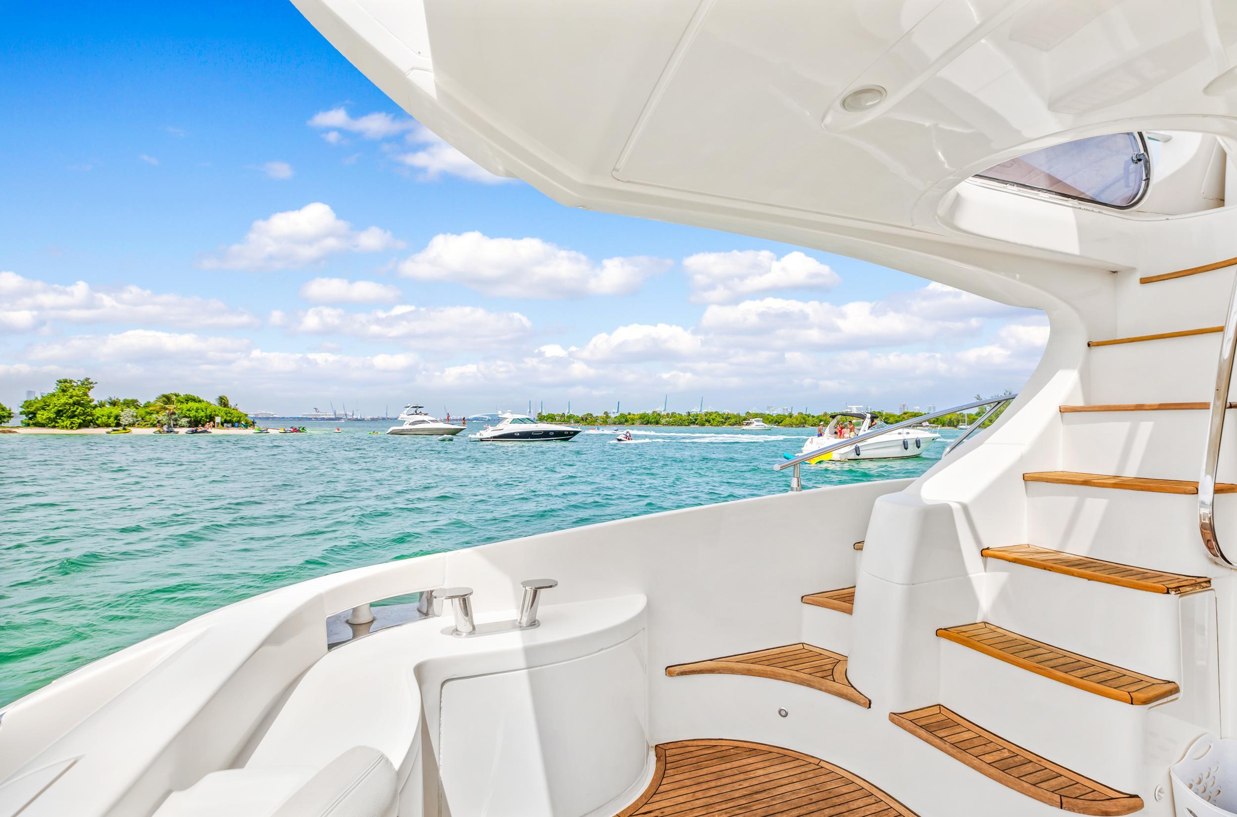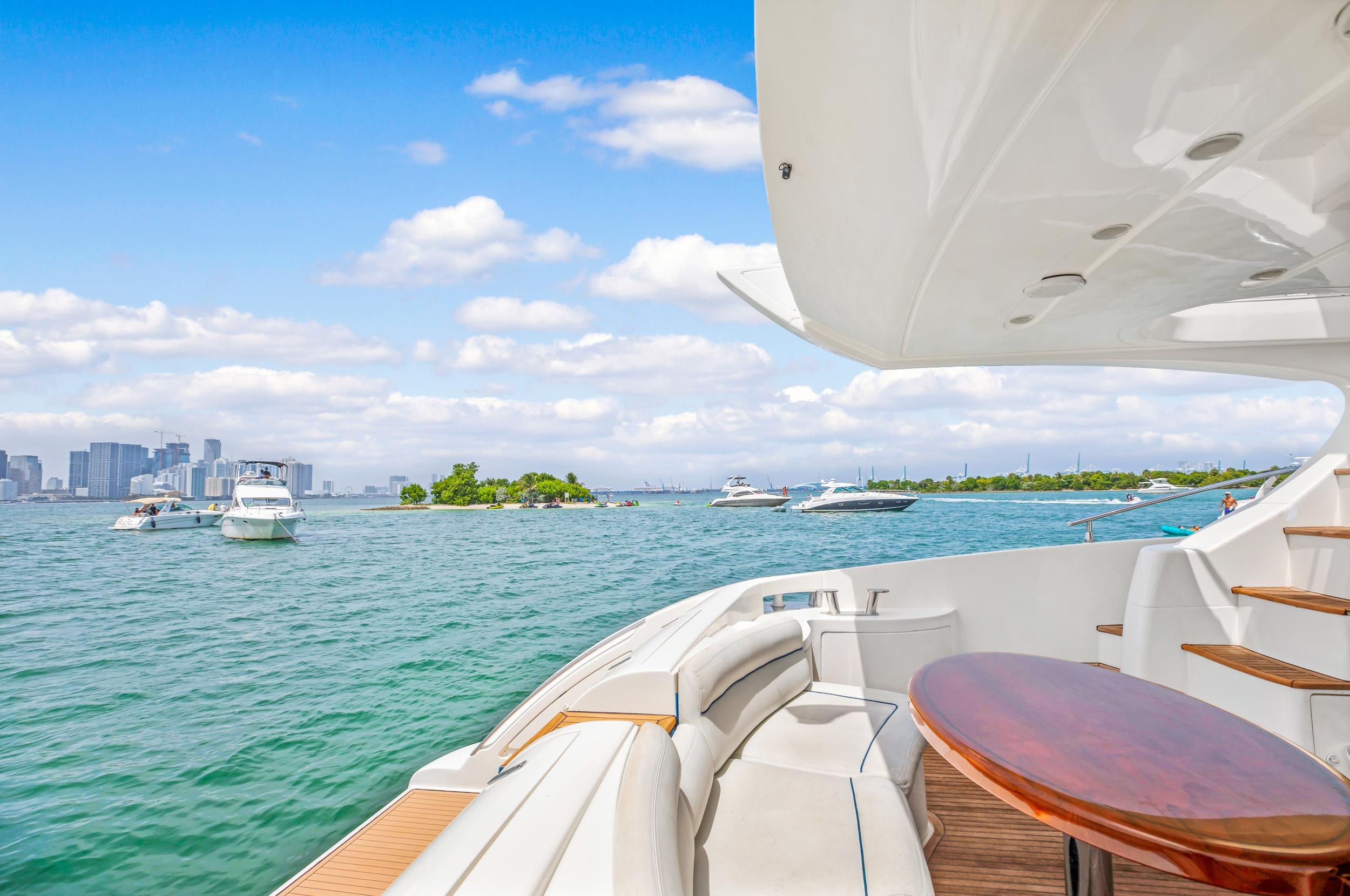 Includes: Teak decking, teak cockpit table, built-in bench seating, storage lockers, stairs to flybridge, port and starboard snubbing winches, overhead lighting, swim platform, and port and starboard boarding gates.