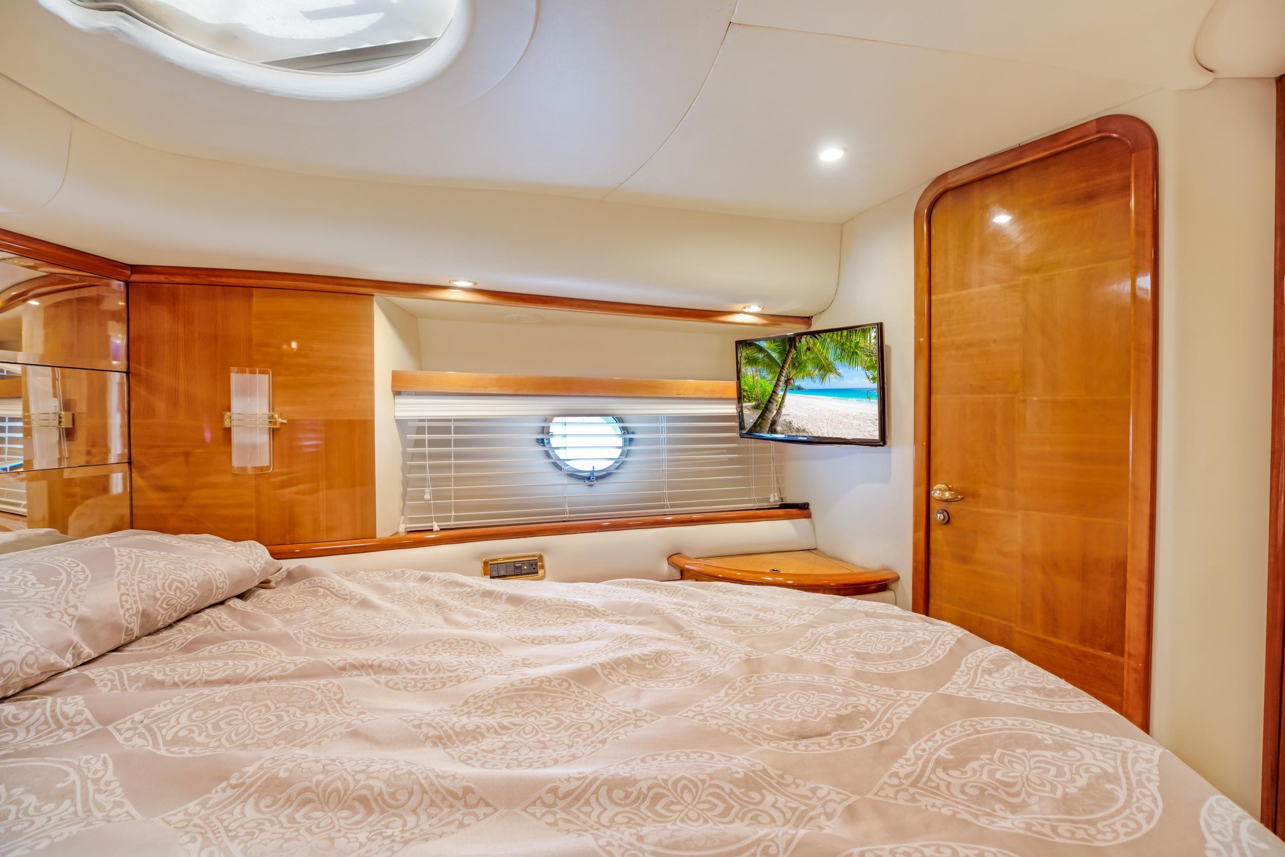 The full-beam Master stateroom in this 62 is outstanding! It is very roomy and has a lot of natural light entering through six large oval-shaped portholes. To starboard is a large makeup area with drawer banks of different sizes, and a large hanging locker with organized shelves for storage. The Master Island bed headboard is beneath three of the oval portholes, giving it a beautiful look. Other features in the master include: carpeted floors, multiple lockers for storage, drawers, overhead lighting, reading lights, indirect lighting, tasteful woodwork, flat screen TV-Satellite receiver, Sony AM/FM/CD, and private entrance to head.