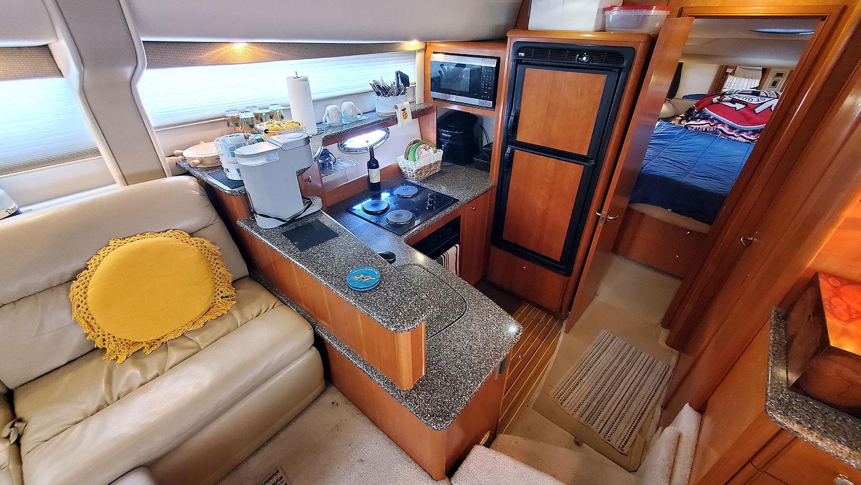 The galley, located forward to port in the main cabin and is fully equipped with an Princess 3-burner electric cook top, Princess Gourmet electric oven, a Frigidaire microwave, a Norcold AC/DC refrigerator/freezer and a stainless steel sink. The Corian style counter tops provide ample workspace, while the vinyl wood plank sole adds a touch of elegance. Additional features include a Keurig coffee maker, toaster, storage cabinets, and in-floor storage space.