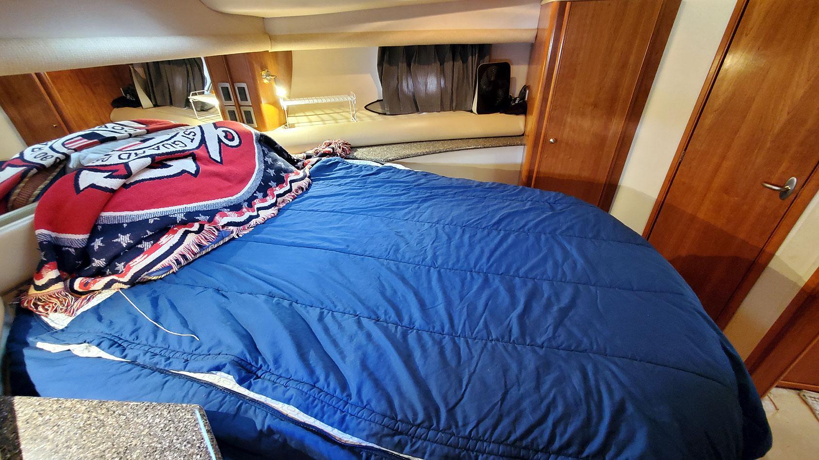 The guest stateroom is forward and offers a centered queen size berth, 2 port lights, overhead hatch, hanging locker, storage cabinets, carpeted sole and direct access to the guest head starboard aft.