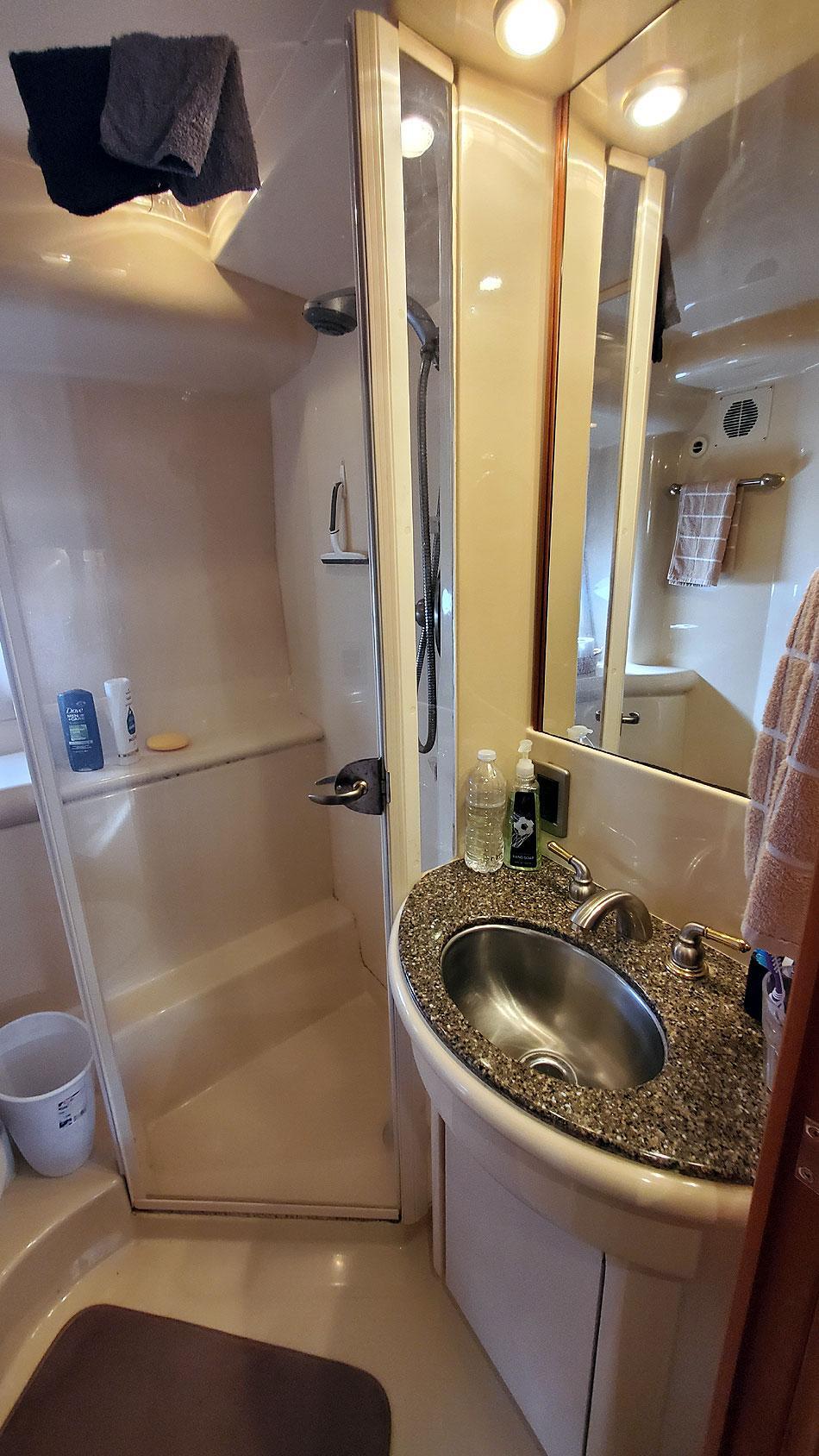 As you step aboard this yacht from the swim platform you ascend the molded staircase and enter the spacious, enclosed sundeck which is perfect for entertaining, dining or relaxation. From the sundeck, you can access the bow through the port and starboard side deck walkways, the salon through the companionway, or ascend to the flybridge. The flybridge is roomy and features a helm station with complete instrumentation and electronics. Additionally, there is a large L-shaped seating area with a refrigerator for entertaining guests. Retreating to the sundeck, you can enter the full-beam, well-lit salon through the sliding companionway door. On the port side, a comfortable sofa with three built in recliners provides plenty of space to relax. To starboard, a built-in entertainment center with a TV and a large L-shaped sofa with a hi-lo coffee/dining table. Moving forward and down a few steps, you will find the fully equipped galley, boasting a refrigerator/freezer, three-burner stove and oven, convection/microwave oven, stainless steel sink, and ample counter and storage space. Further forward from the galley, you can enter the guest stateroom, which features a centered queen berth, a hanging locker, and plenty of storage space. There is also a private entrance to the guest head, with a separate shower stall. Heading back to the salon and down to port, you can enter the full-beam master stateroom, with its queen-sized island berth, two hanging lockers, and abundant storage space. The ensuite master head features a separate shower stall and toilet. The engine room access is located in the sole of the salon, ensuring easy maintenance access.