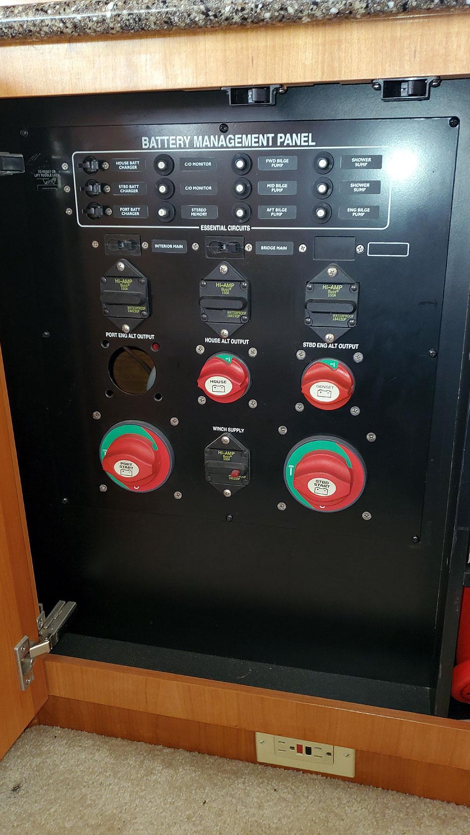 The salon welcomes you with a plush carpeted sole, surrounded by a double row of windows on both port and starboard sides, equipped with blinds for privacy. On the port side, a large sofa with three built in recliners is accompanied by two storage ottomans. On the starboard side, an L-shaped sofa with a hi-lo coffee/dining table creates a perfect space for dining or entertaining. The entertainment center and electrical panel are located on the starboard aft wall, while engine room access is located in the sole.