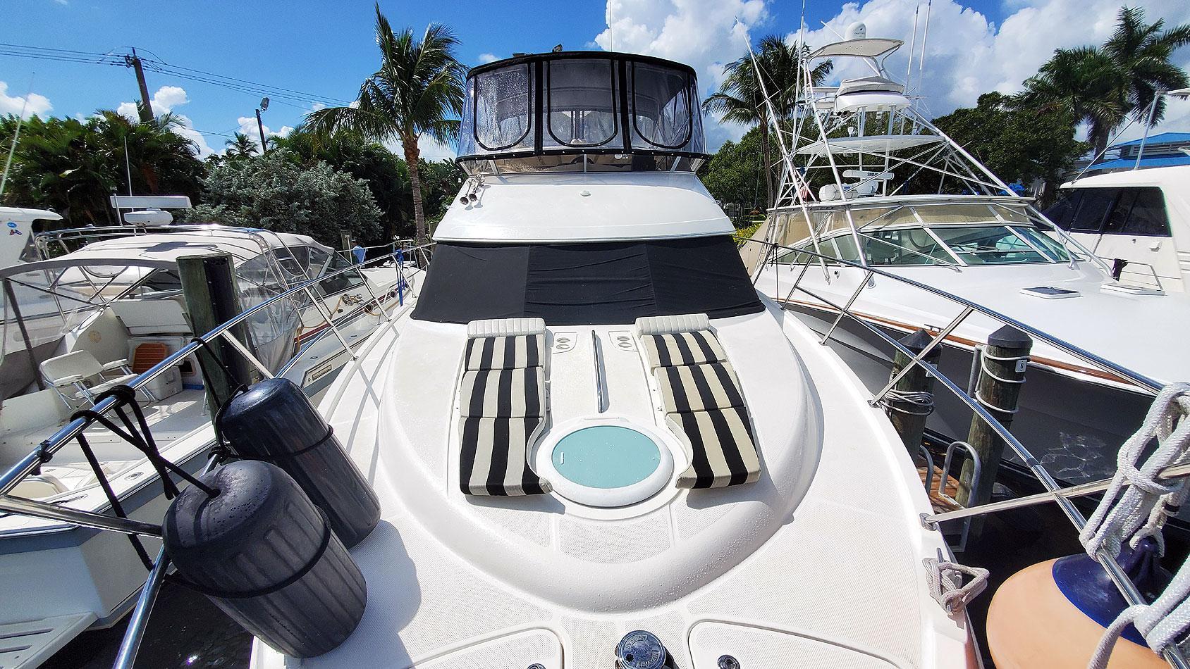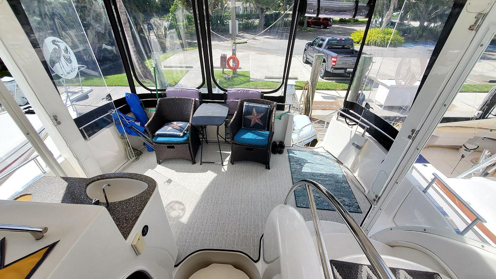 The sundeck offers a hardtop with Strataglass enclosure, two wicker chairs with cushions, small folding table, wing door to each side deck, storage cabinet, carpet over non-skid deck and molded-in steps to the flybridge, cockpit and main cabin. A wet bar starboard forward on the sundeck features a sink, ice maker and storage cabinets.