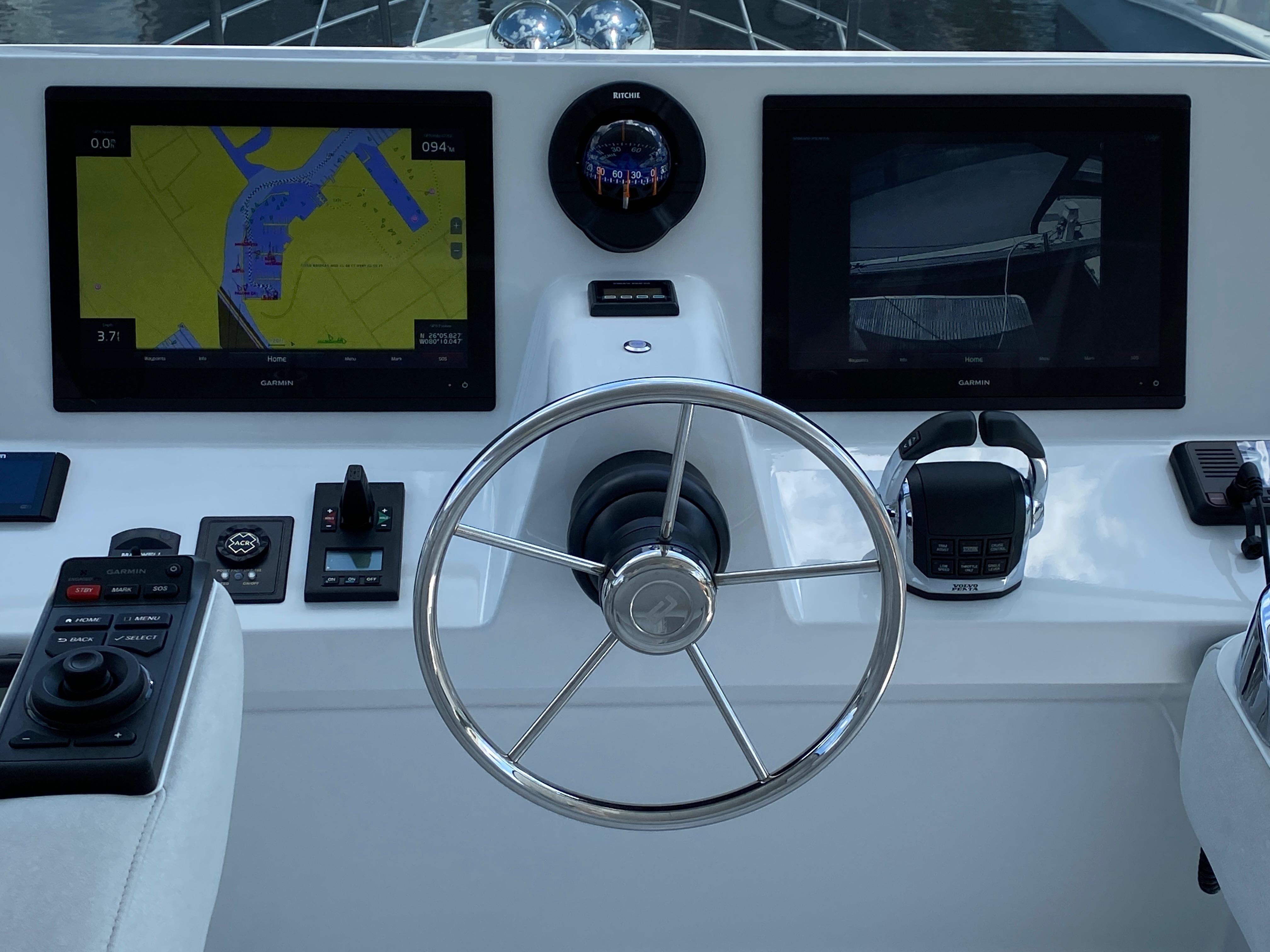 Lower helmFull navigational electronics on lower and upper helm stations. Additional port side and starboard side joystick docking stations on the aft deck for easy docking. Pantographic door right next to the lower helm station for easy access to the side deck.