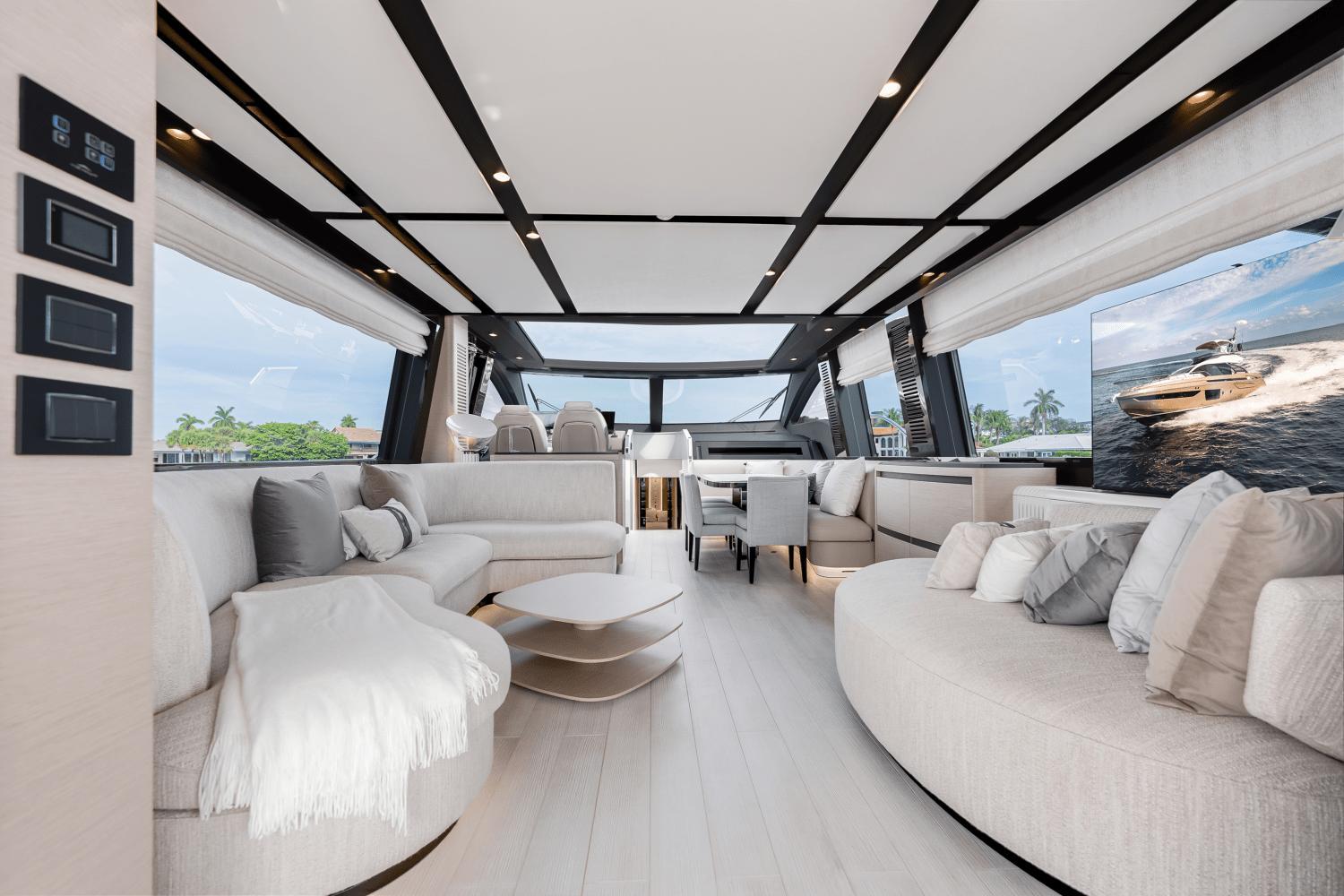 This bright and spacious yacht salon features expansive panoramic windows and a retractable sunroof, creating an airy and inviting atmosphere. The elegant dining area comfortably accommodates guests with plush seating and sophisticated finishes.