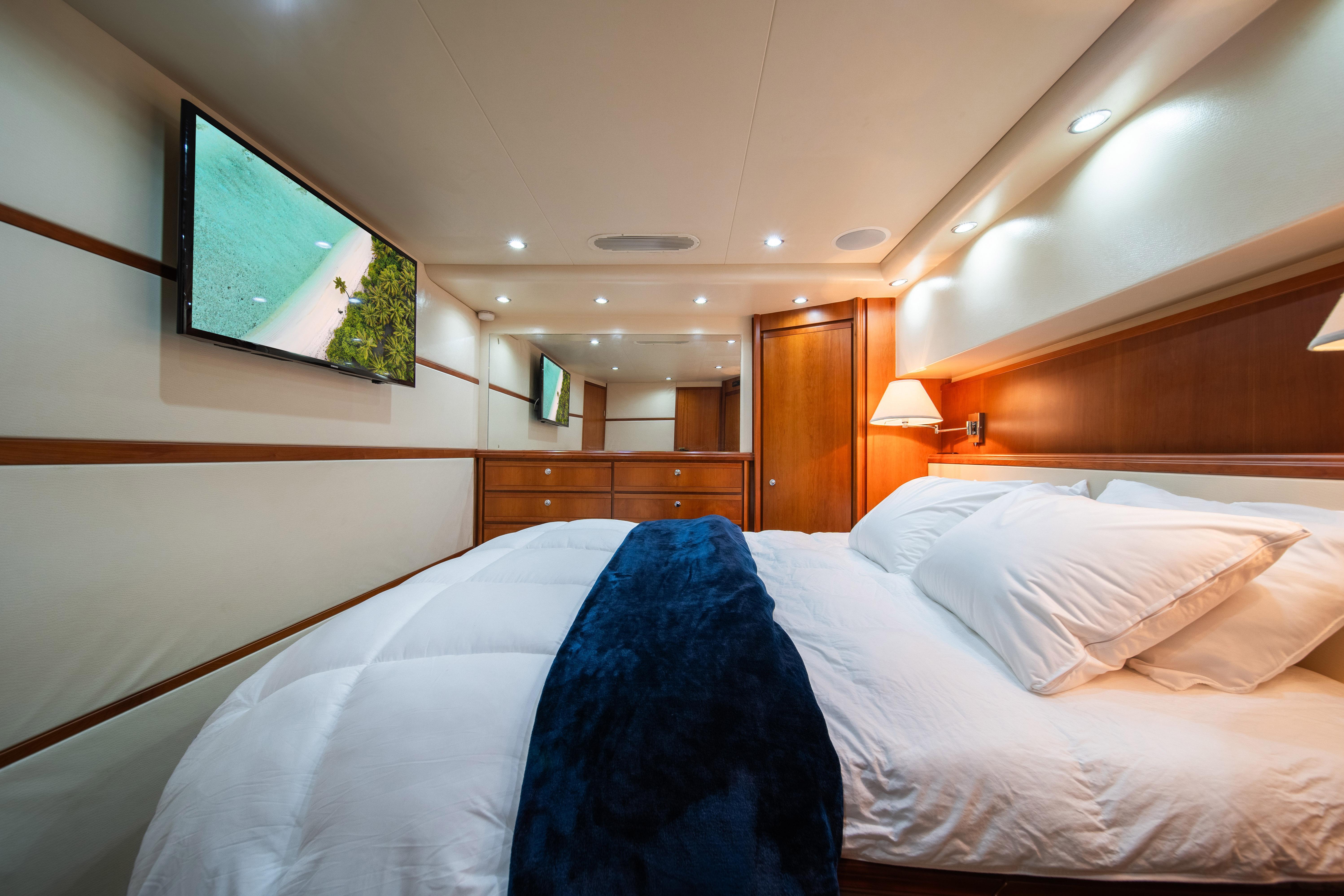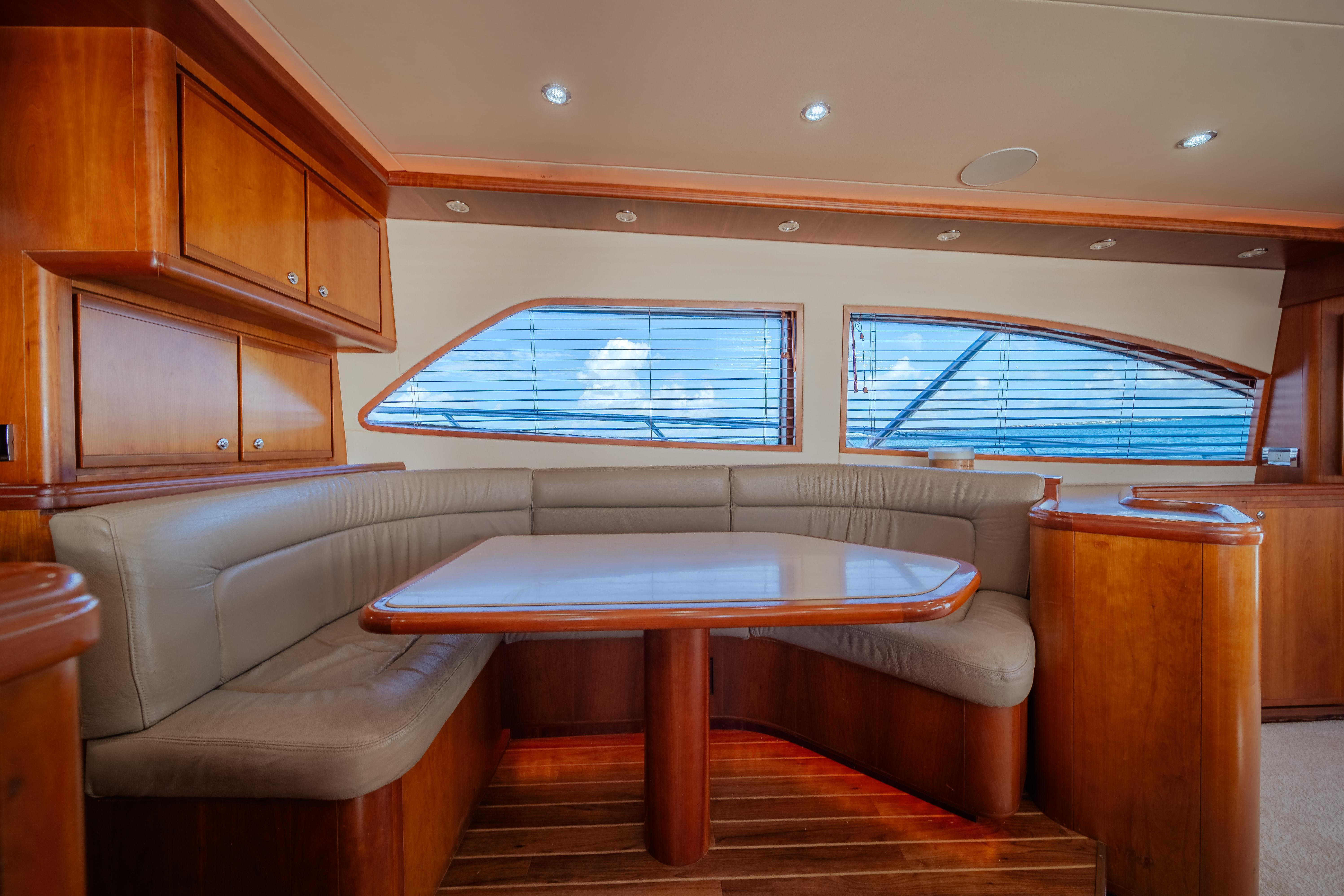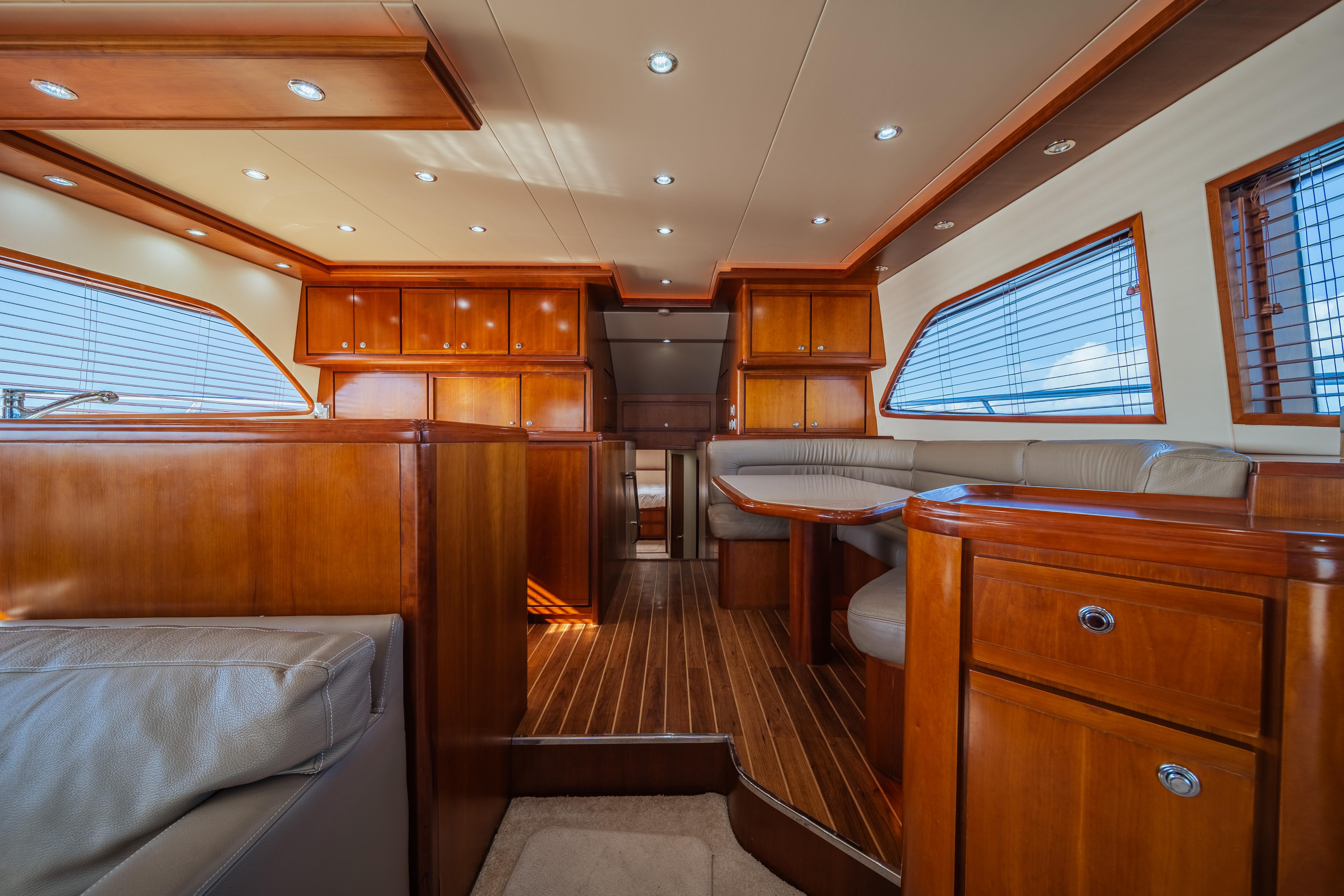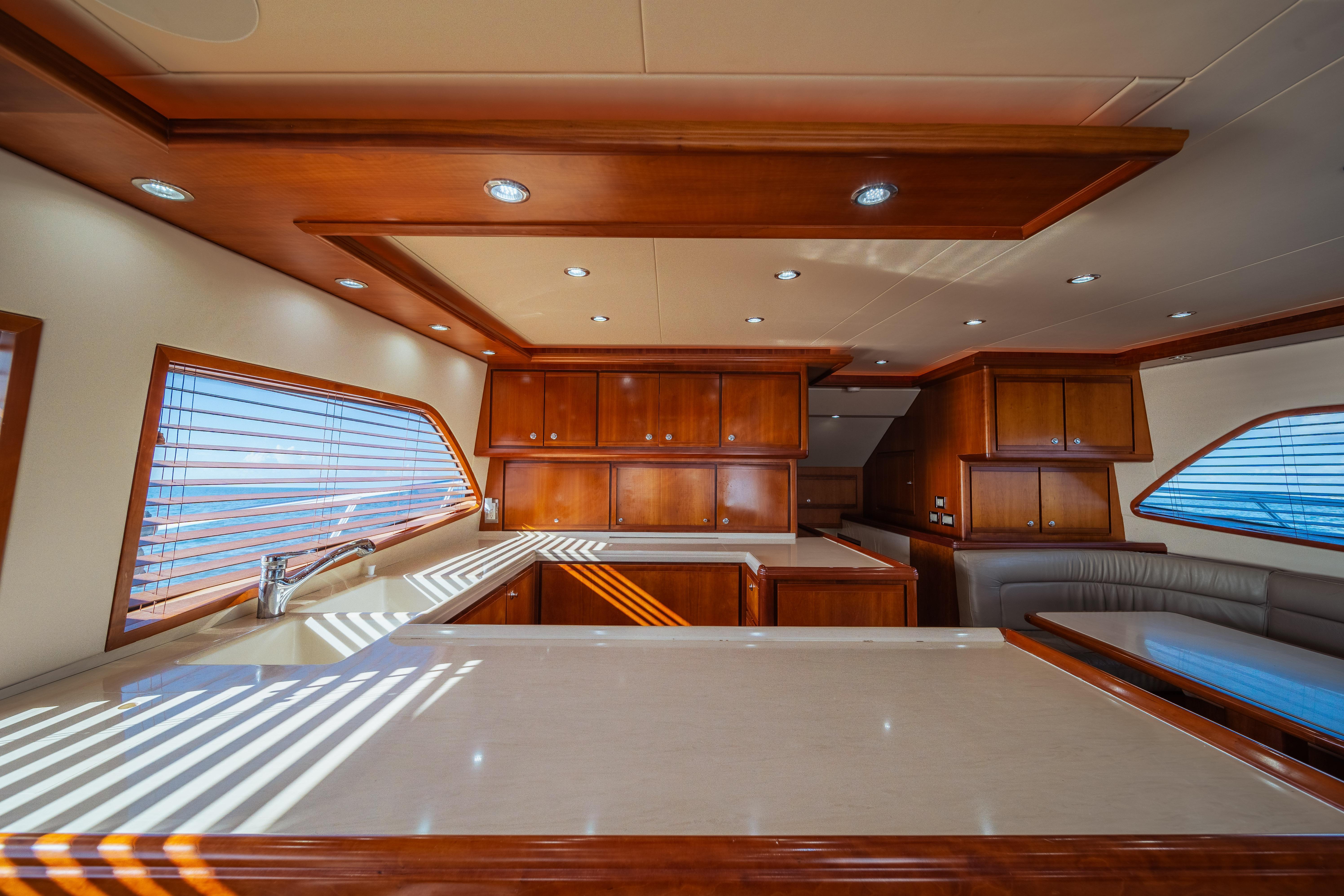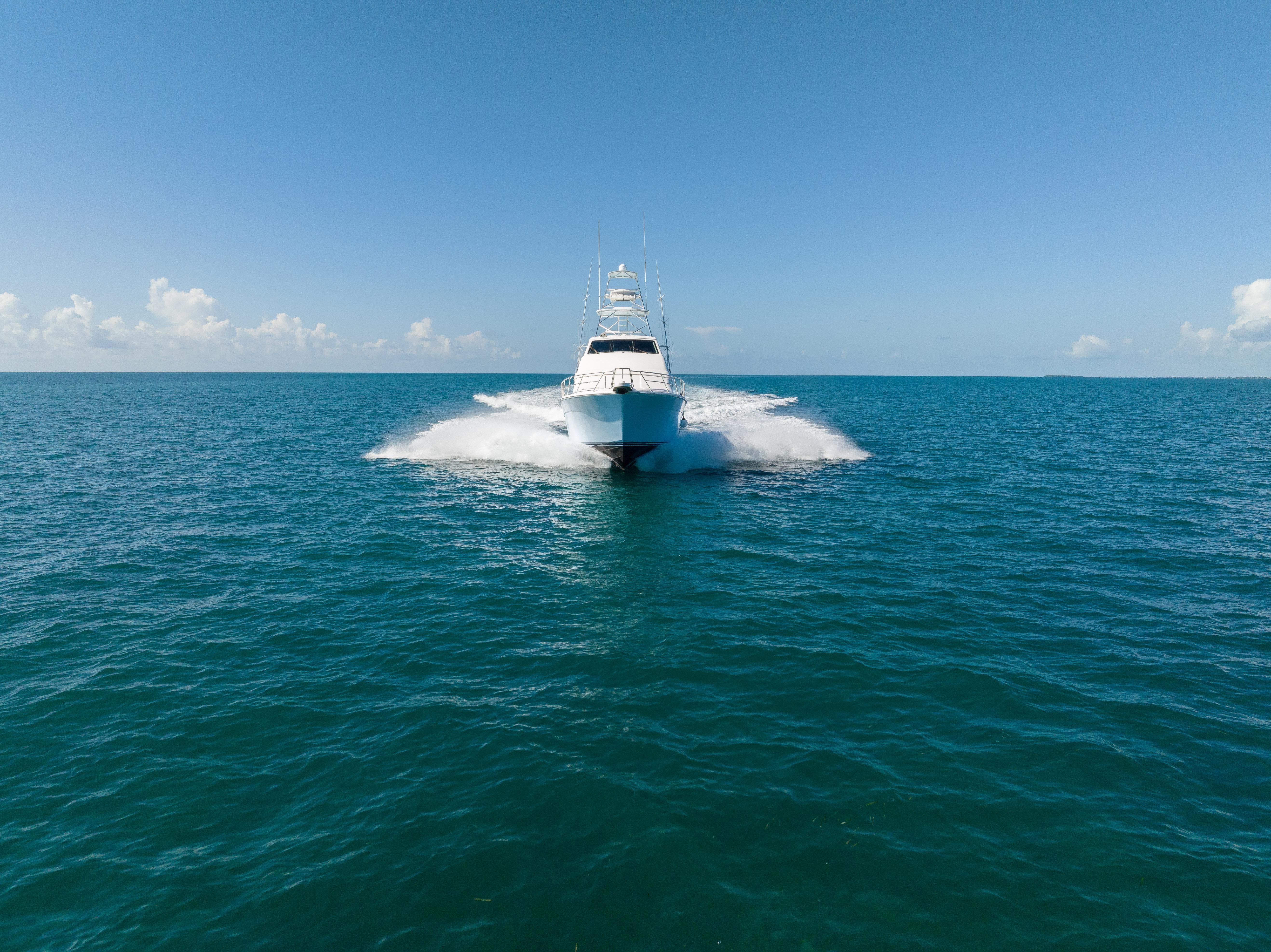 Classic convertible styling, near 40-knot speed, and the only stairway bridge access in her class characterize the 630 Convertible, Bertram's replacement for the hugely popular Bertram 60 Convertible built from 1990 through 2005. To boost her top-end speed, Bertram engineers gave the 630 less transom deadrise than her deep-V predecessor in addition to adding prop pockets to level the engines. The bottom is solid fiberglass, and a long keel provides directional stability. Inside, the high-gloss cherry interior of the Bertram 630 rivals a small motor yacht for comfort and luxury. A vast U-shaped leather sofa to port dominates the salon with storage cabinets opposite and galley and dinette forward. There are four staterooms and three heads below including an amidships master with walkaround queen bed and an equally spacious VIP stateroom with queen berth. A mezzanine deck overlooks the cockpit with its transom fish box and livewell, bait freezer, and transom door with lift-up gate. MTU 2,000hp engines cruise at 33-34 knots (high 30s top).
