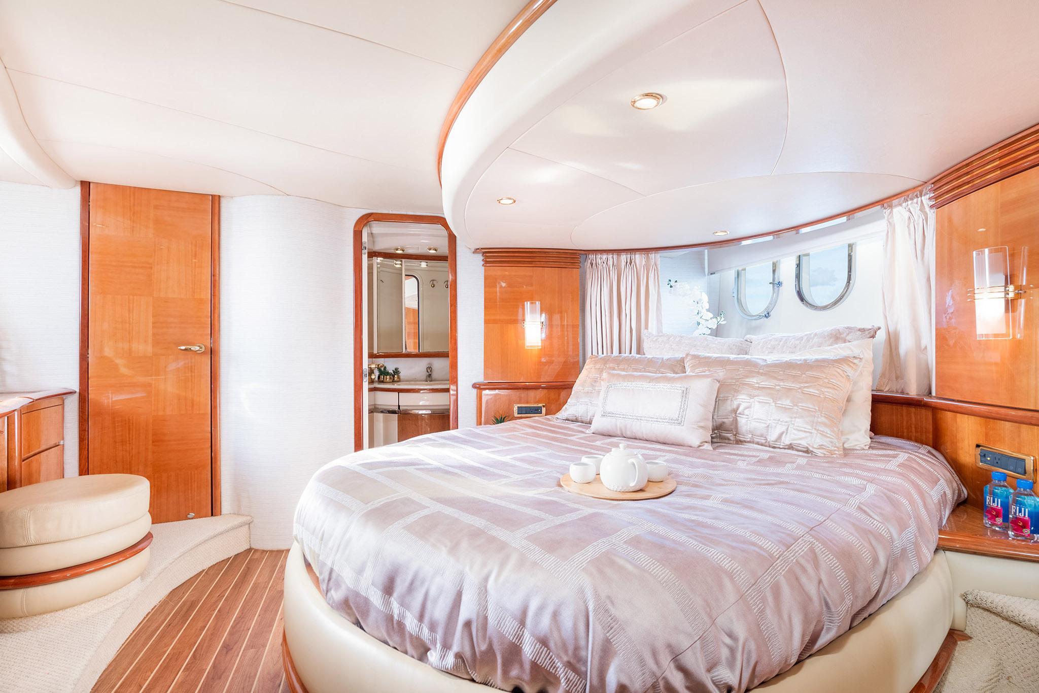 Additional DescriptionOWNERS CABIN (MIDSHIP) Double bed with drawer unit Double-door mirrored wardrobe on foreside Column unit with drawers Built-in vanity unit with drawers Large-sized oval portholes (300 x 600 mm) Emergency exit via ceiling above vanity unit Cherry wood doors and frames Direct access to owners bathroom Walk-in wardrobe with drawers and hanging rail Curtains, upholstery and carpet Azimut reading lights Diffused lighting under bed and behind pelmets Provision to fit TV VIP CABIN Double bed Mirrored headboard Shelves above portholes Walk-in wardrobe with hanging rail and shelves Two round portholes Deck hatch with shade and mosquito screen Curtains, upholstery and carpet Azimut reading lights GUEST CABIN Twin beds Bedside table and switches Azimut reading lights Wardrobe with drawers and shelves Curtains, carpet and upholstery Round porthole
