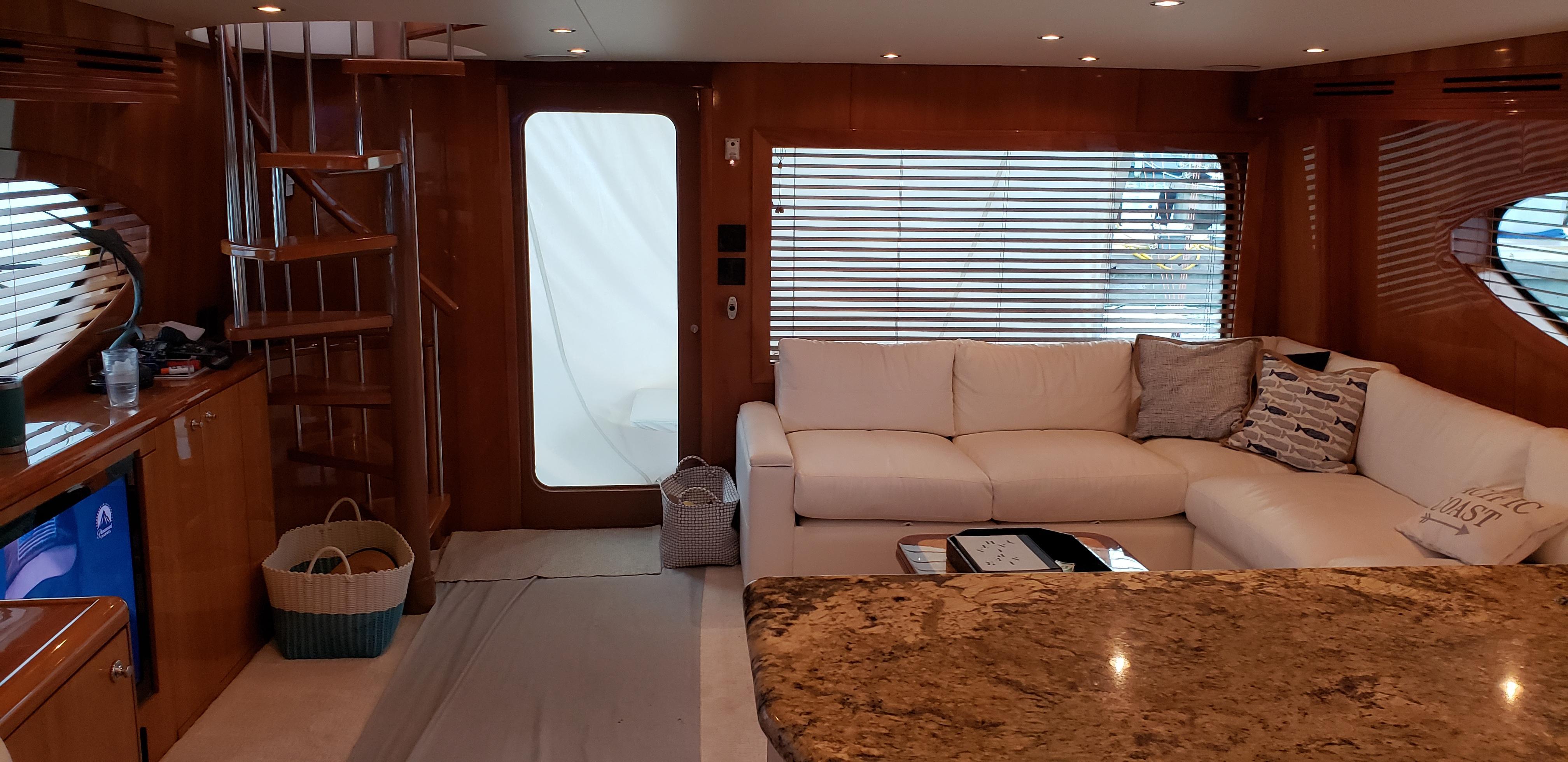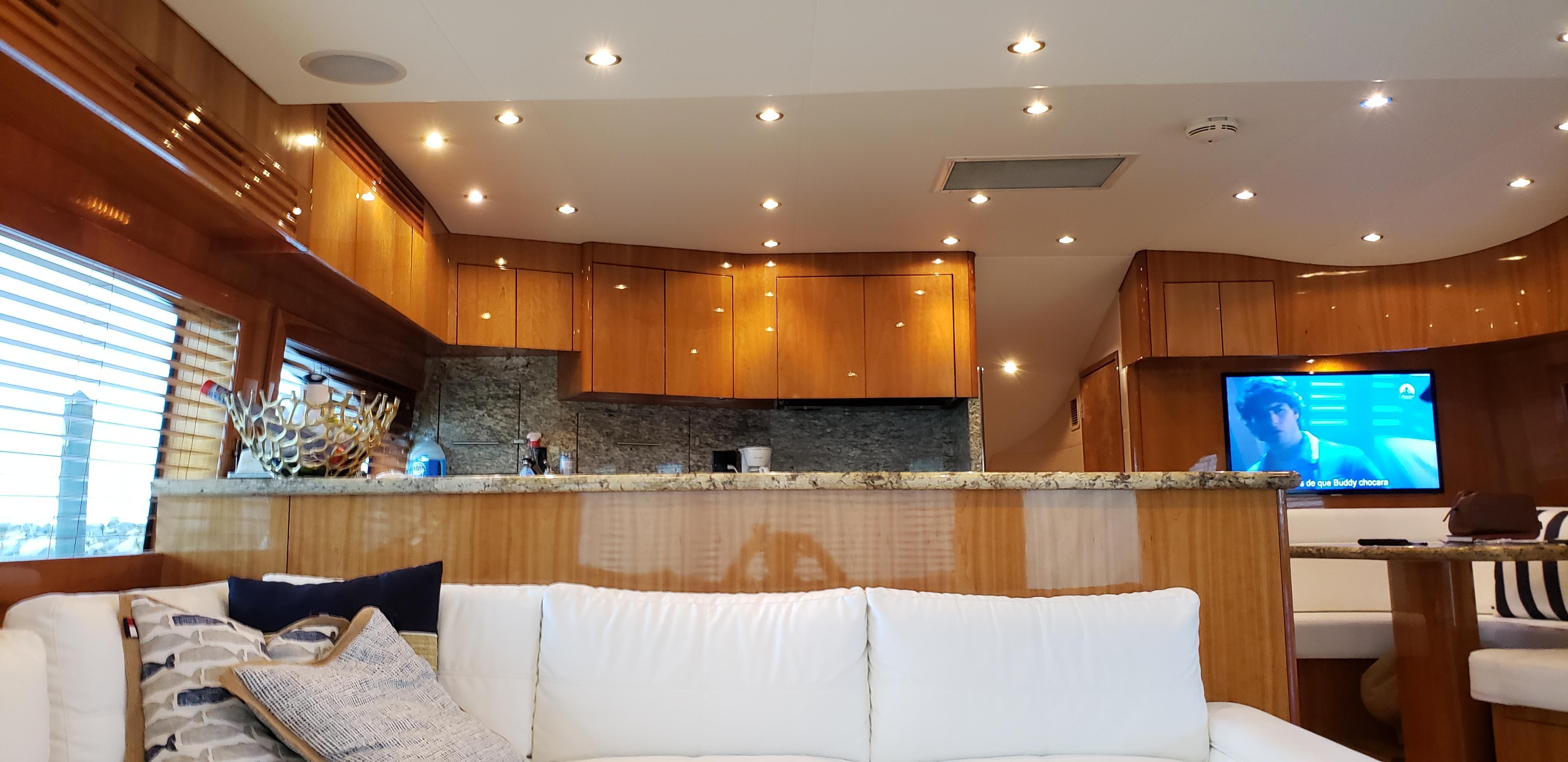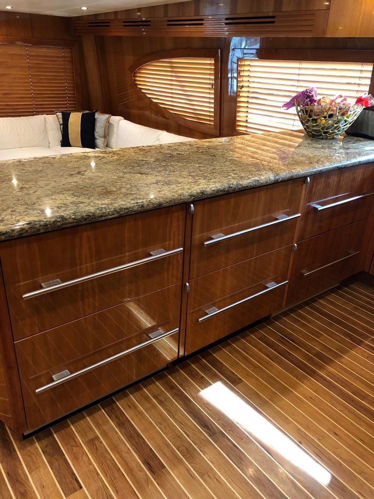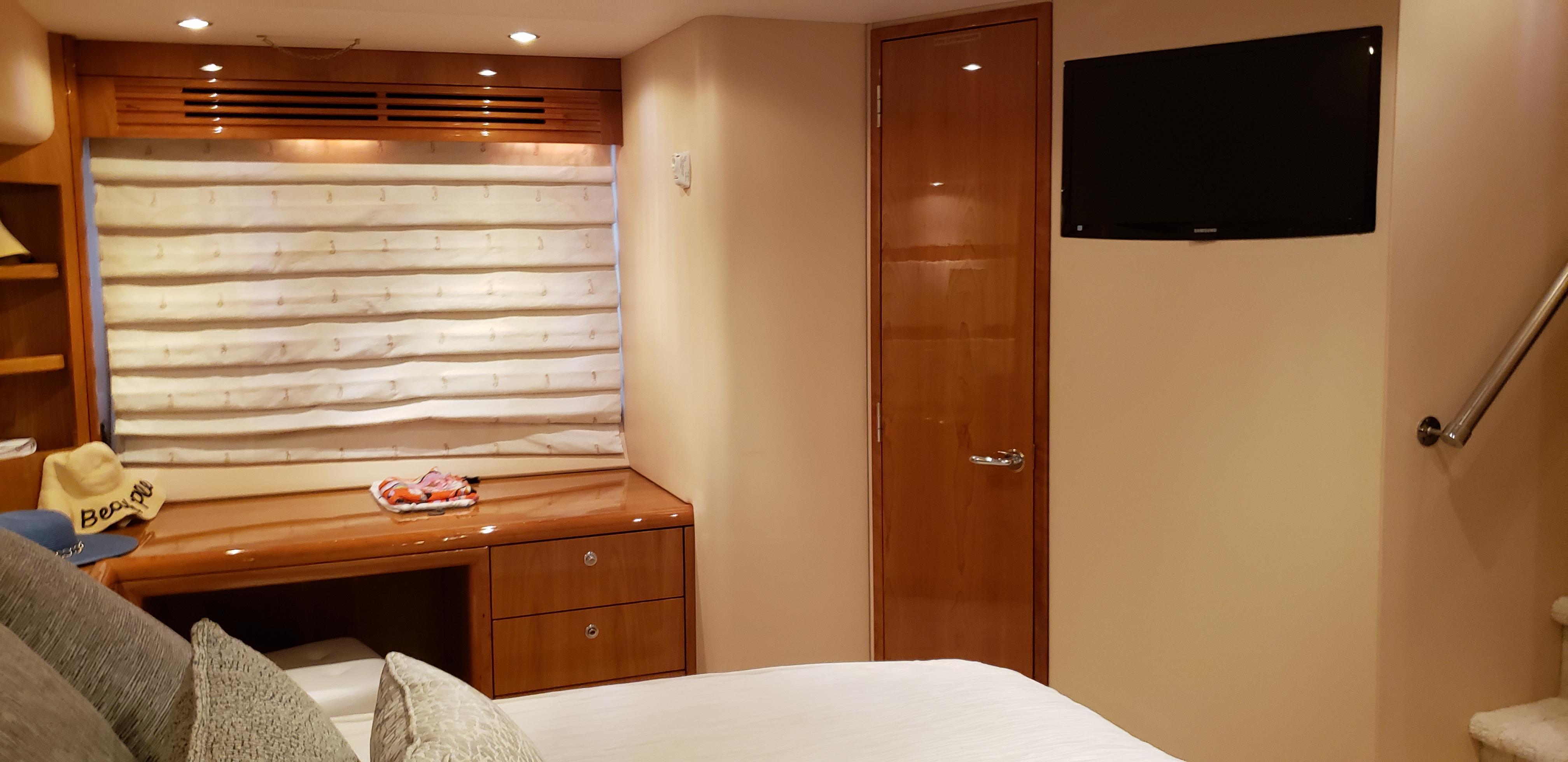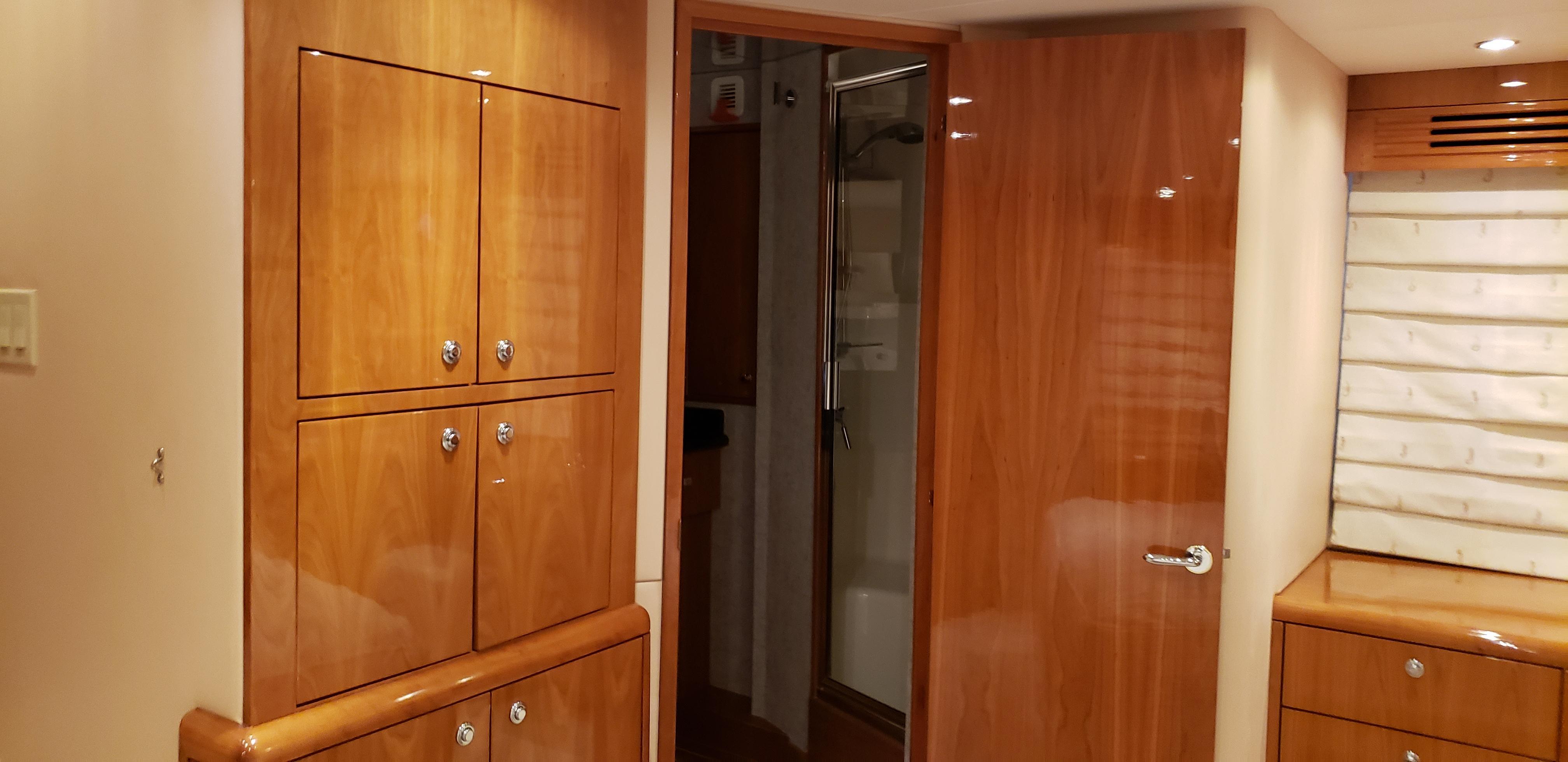 If you want to be awed, press button for the pneumatic entrance door, and the spacious salon with recently replaced carpet, new re-upholstered sofa, and dinnette, with the granite counter top, and cherry high gloss, will make you understand the success of the Hatteras 68c. Show Time, has an upgraded Scotsman Ice maker, the big TV in the stbd side, with a second TV forward of the dinnette, making sure everyone is entertained.