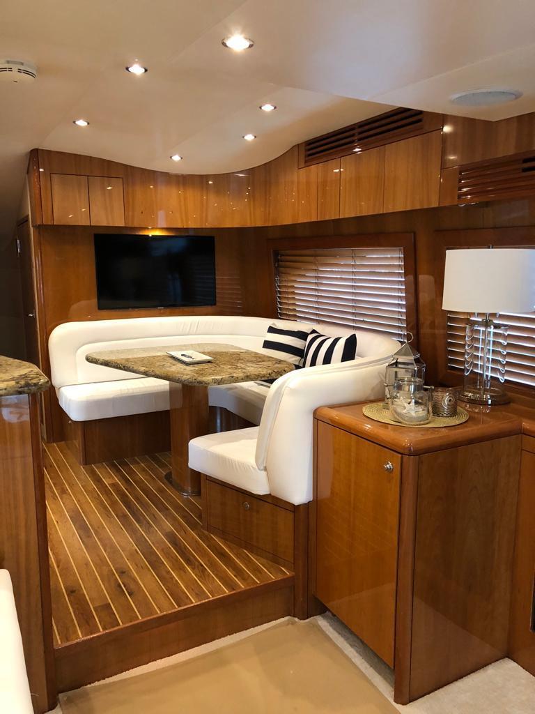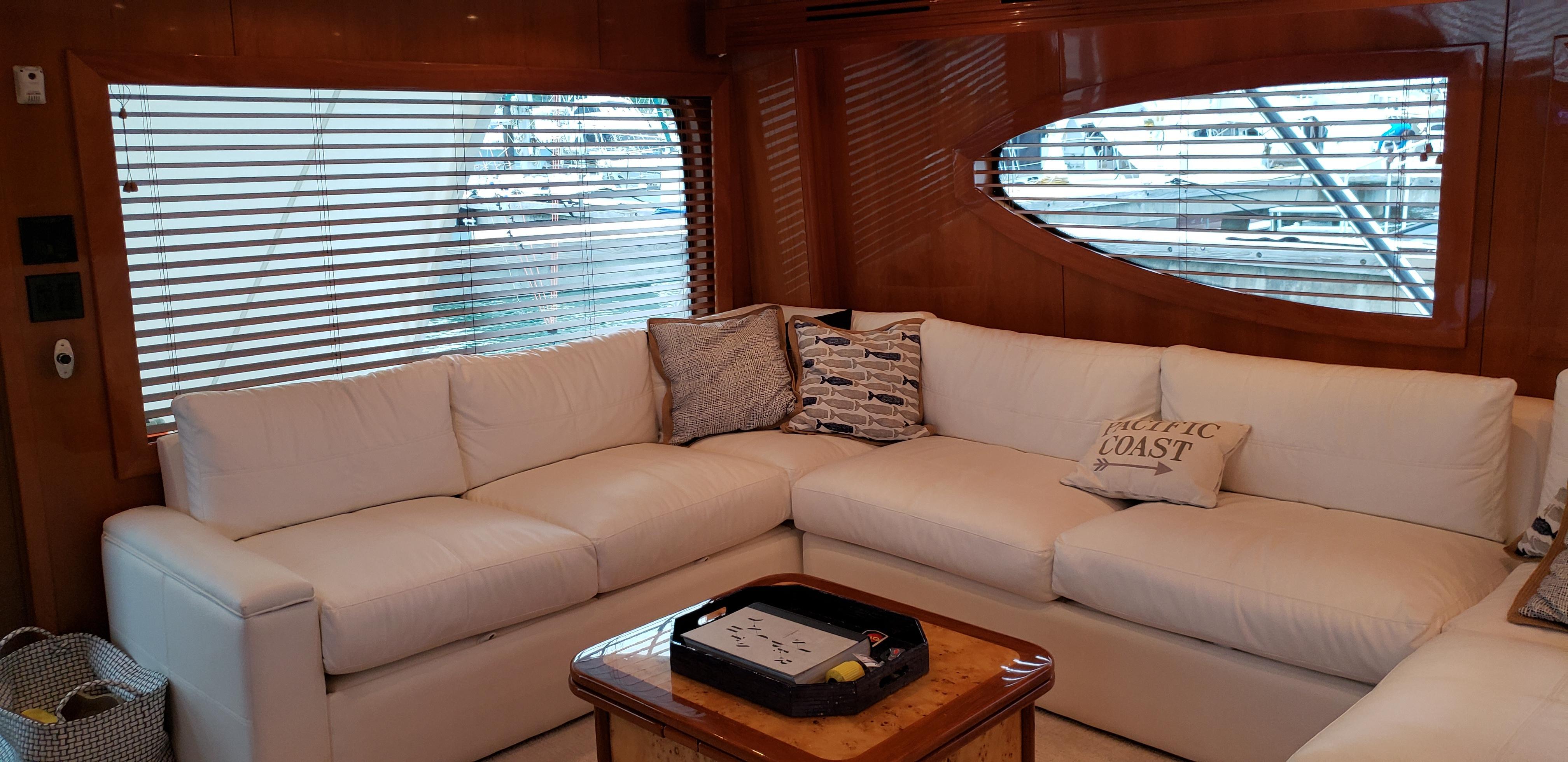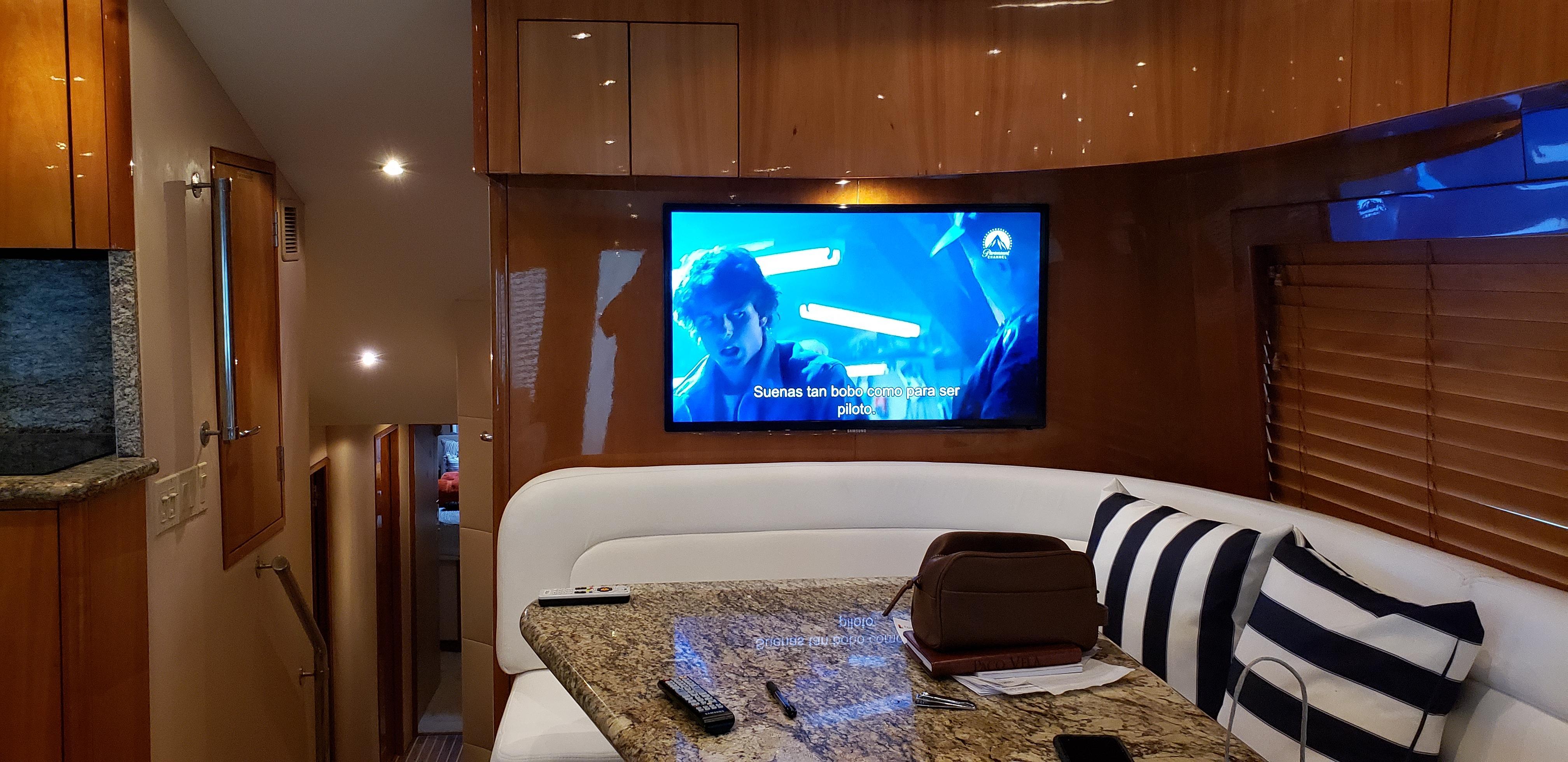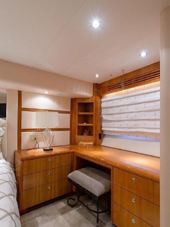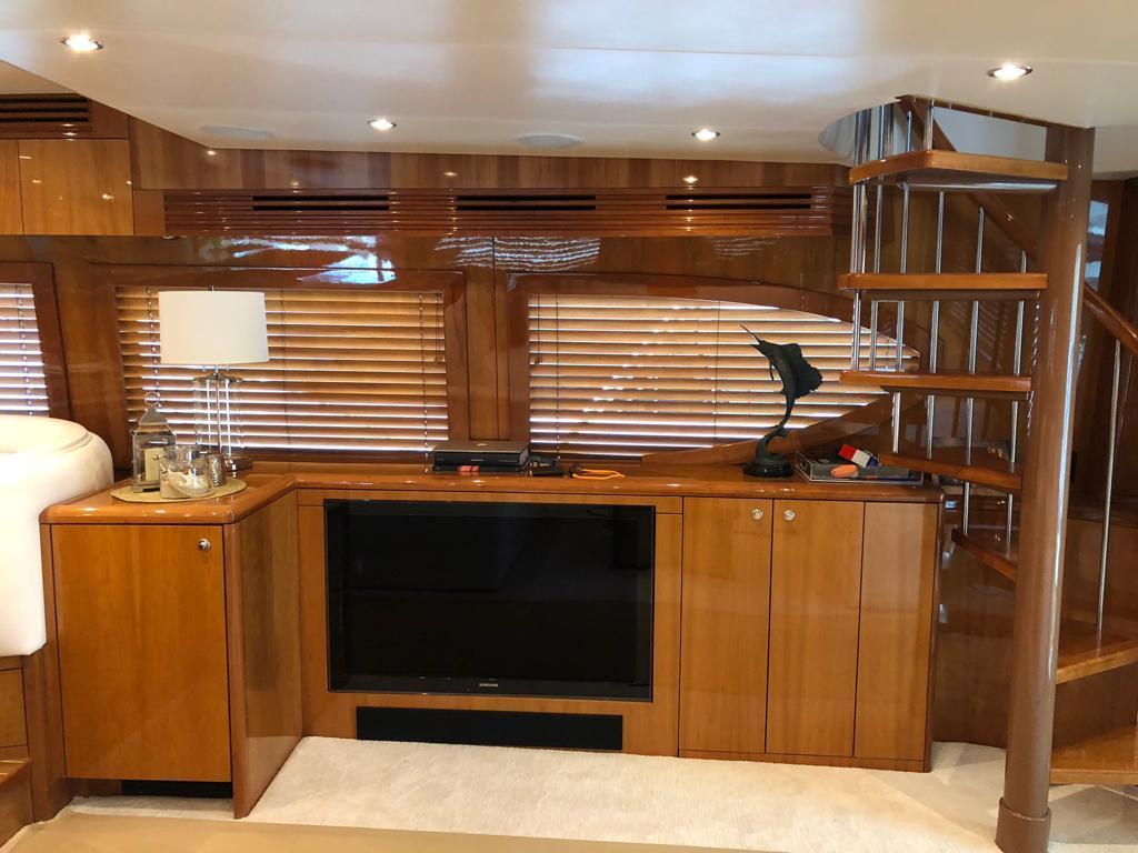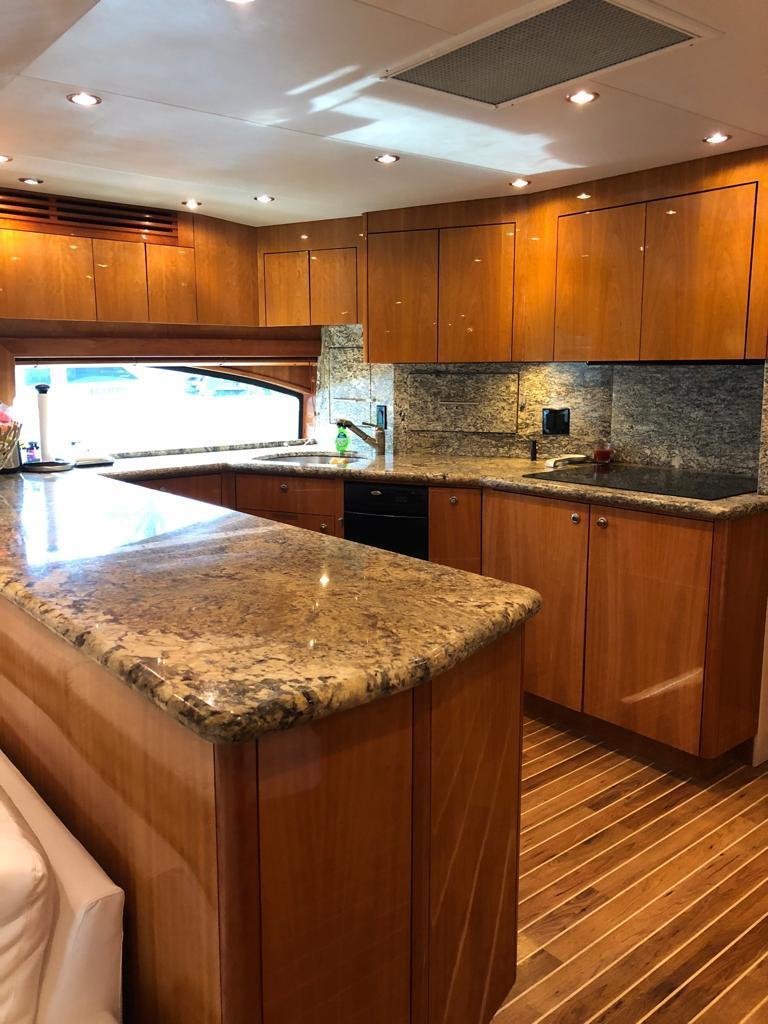 If you want to be awed, press button for the pneumatic entrance door, and the spacious salon with recently replaced carpet, new re-upholstered sofa, and dinnette, with the granite counter top, and cherry high gloss, will make you understand the success of the Hatteras 68c. Show Time, has an upgraded Scotsman Ice maker, the big TV in the stbd side, with a second TV forward of the dinnette, making sure everyone is entertained.