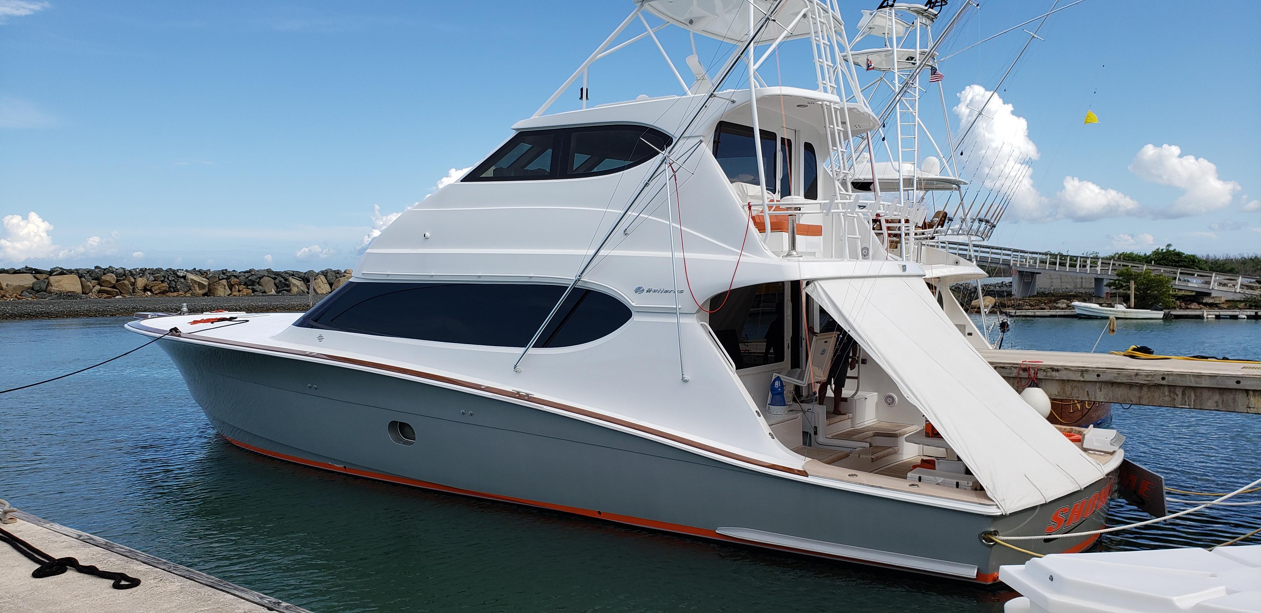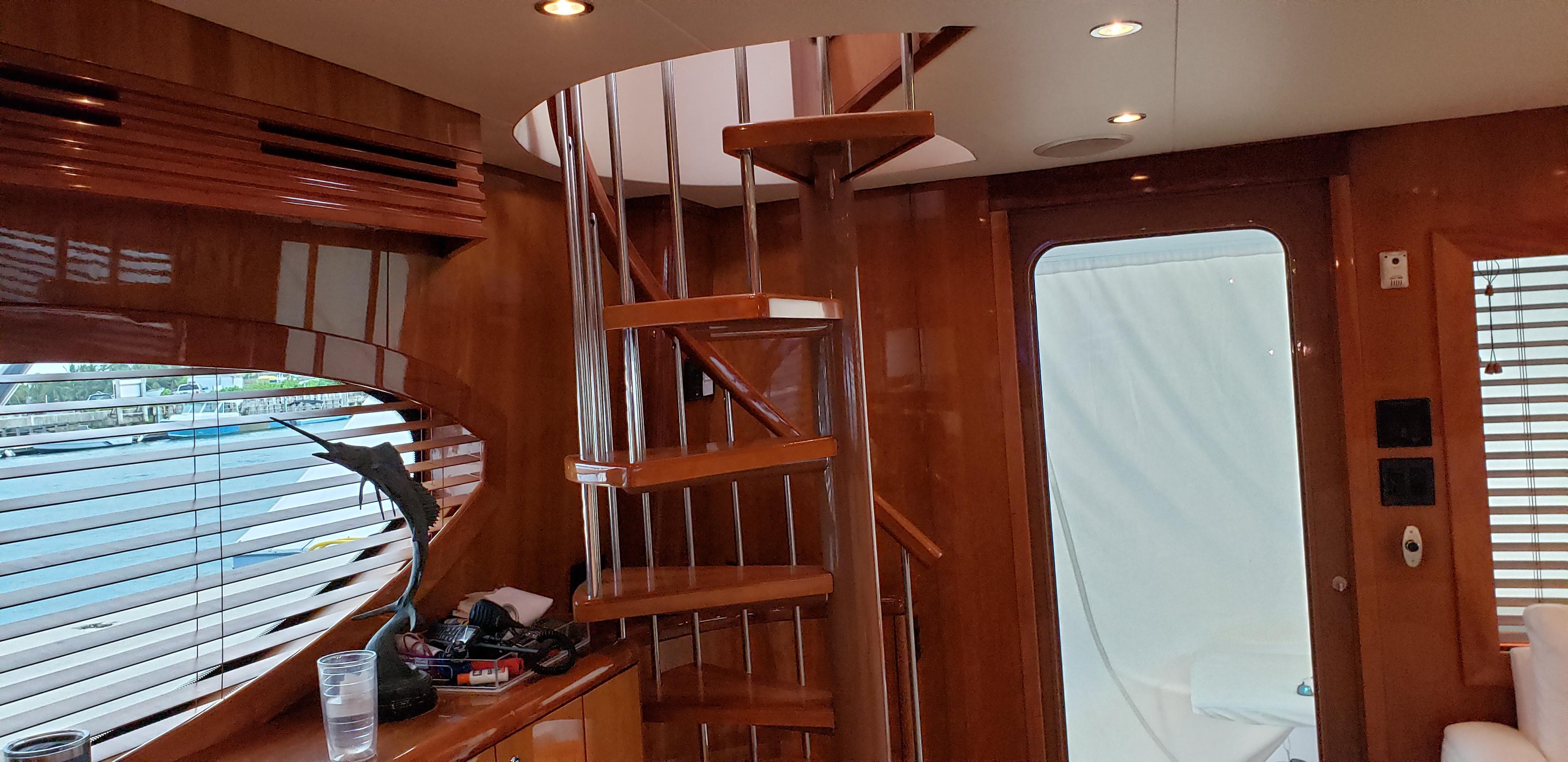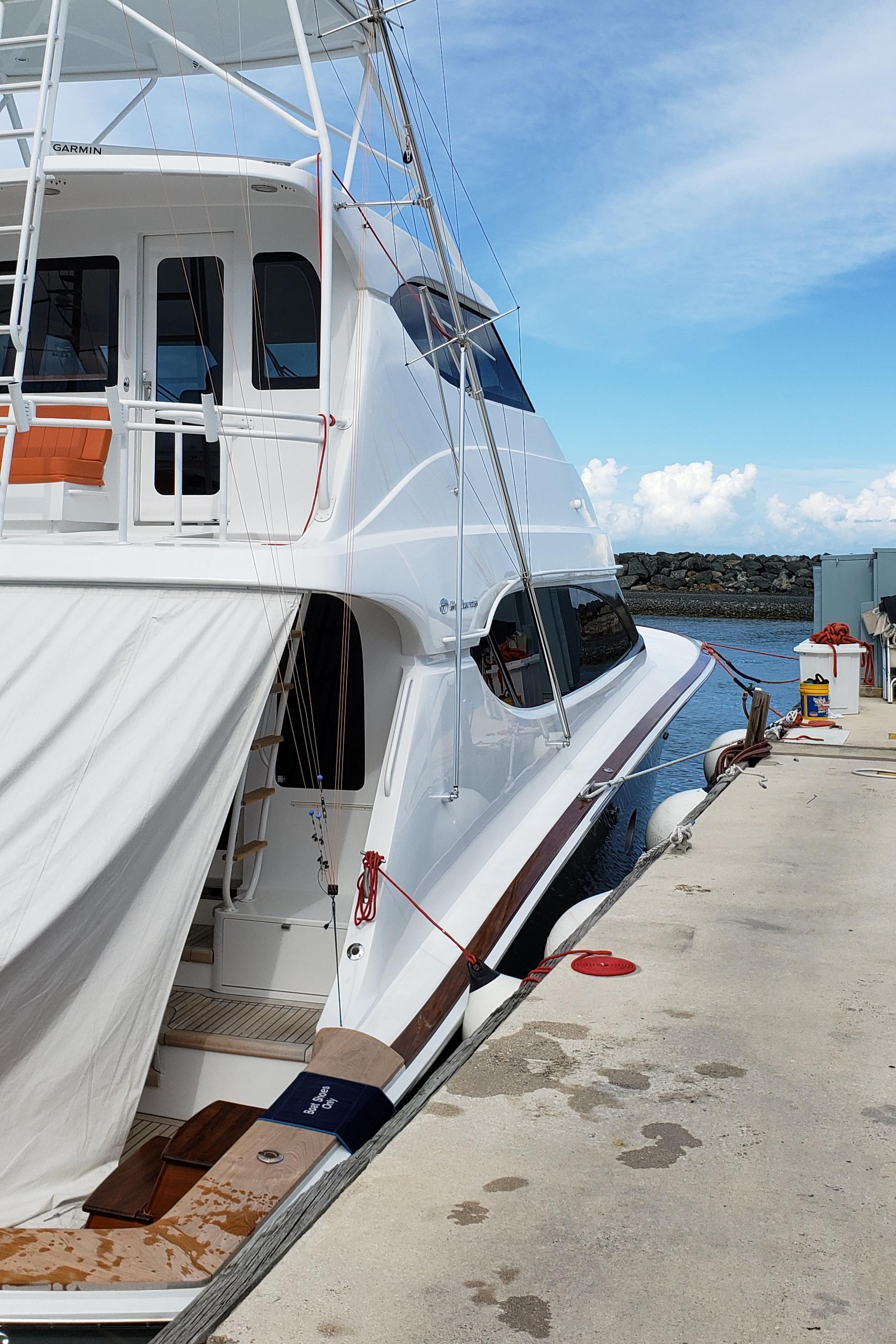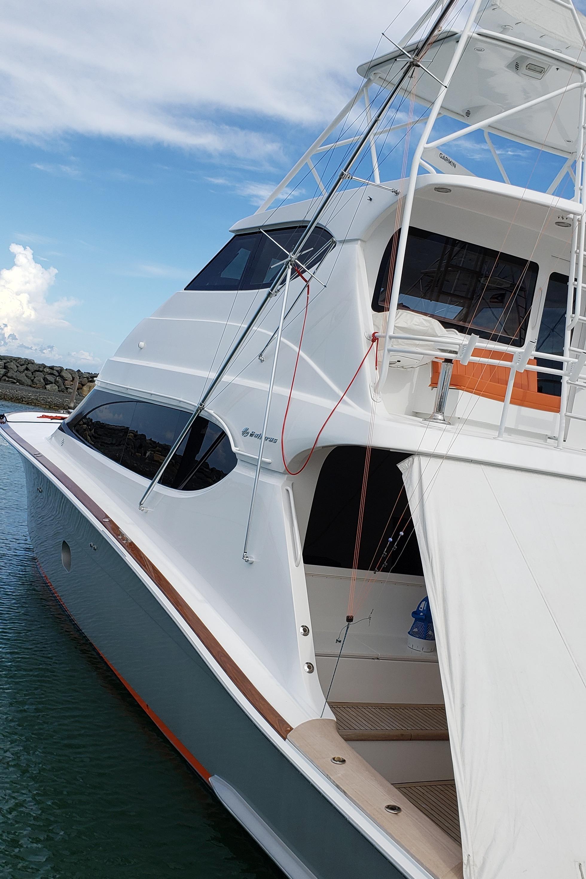 As you approach the vessel from the dock it will be love at first sight. You will be able to appreciate why Hatteras paint their boats, as you see from the distance the shinning of the massive structure. The powder coated PipeWelders tower, blends perfectly with the Hatteras white paint of the enclosed bridge, making it appealing and with the new orange stripe and cushions, it sure stands out from the rest. Once you step aboard the 192 square feet cockpit, you will find a RELEASE TEAK table with RELEASE TEAK Chairs for eight (8) people, that blends perfectly with the full TEAK Cockpit, in which the sole has been recently replaced. Under the gunwale has a 12v connection for the electric reel on each side, also glendening cable on each side. SHOW TIME, has gone through recent upgrades that includes more refrigeration in the Mezzanine foot steps. As you keep heading to the entrance, the last step is a refrigerated drink box.