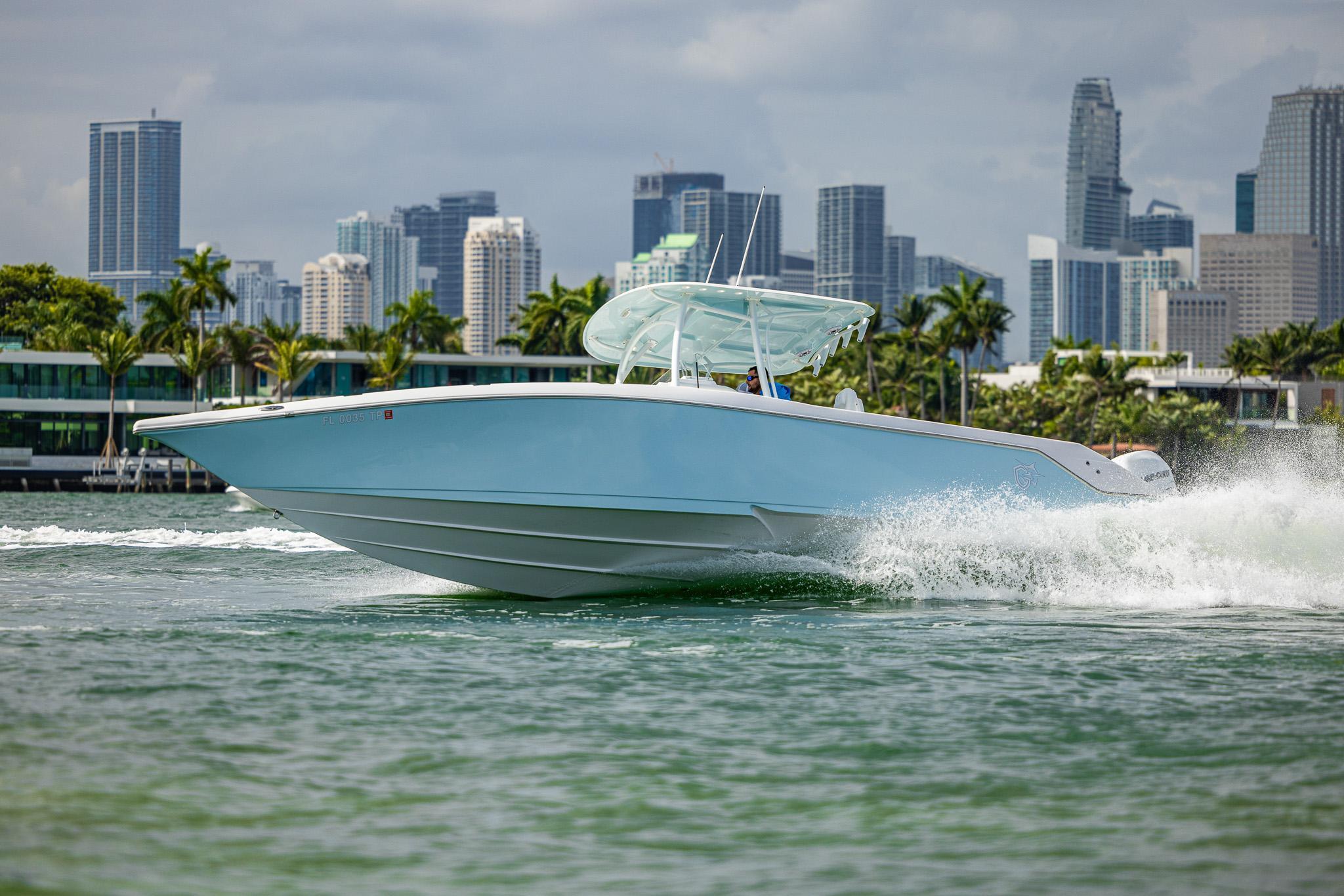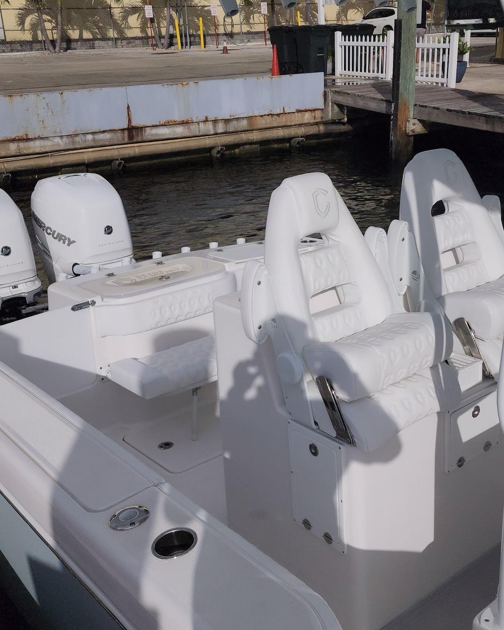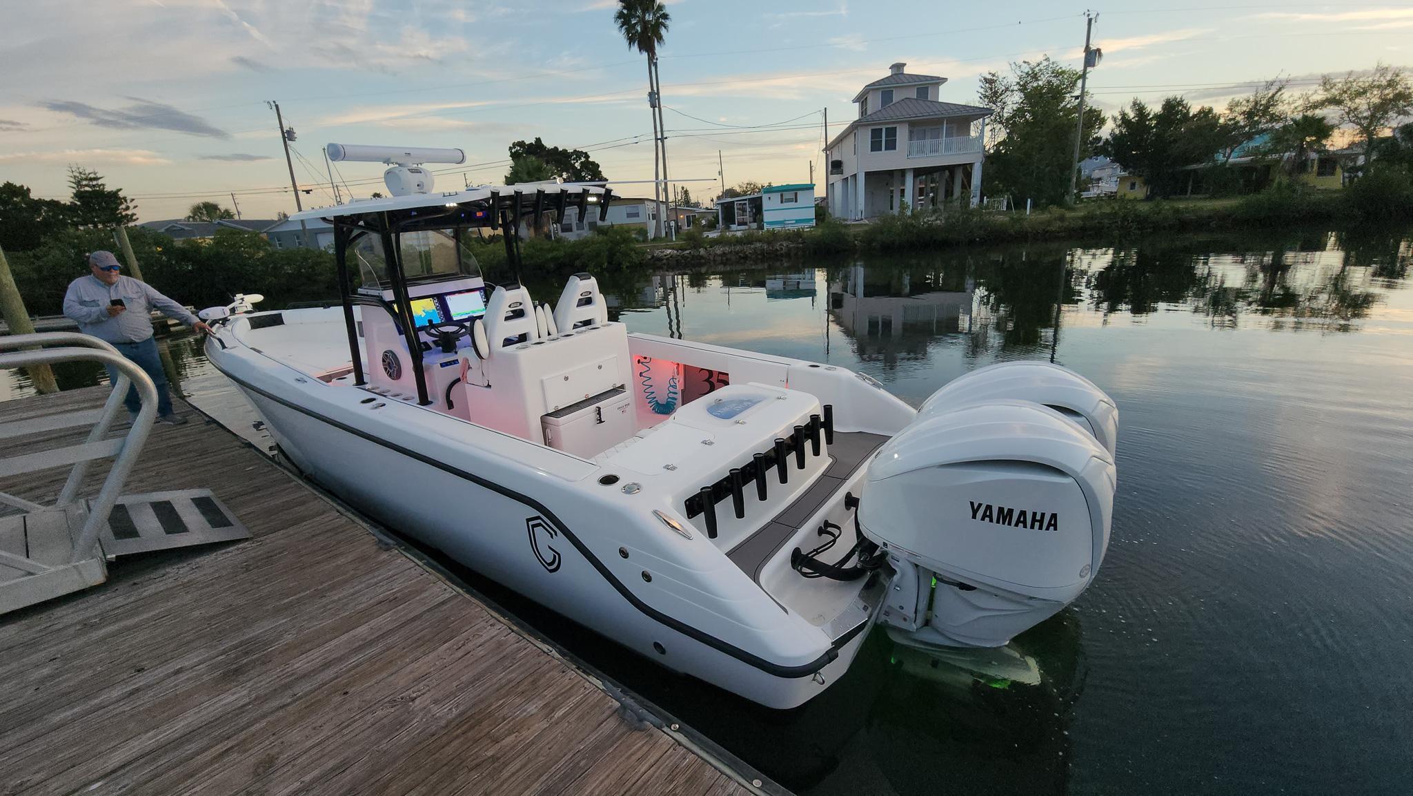 The CG Boatworks 35 M-Series is a proven stepped-hull center console for anglers who want to get where they're going fast. The 35 M-Series has a 9'4" beam, which allows for more room on deck for Family/Anglers. Built on a proven high-performance, 2-stepped, deep-V hull with an open bow with a large casting platform. The helm has a spacious dash layout with (2) 12" Garmin's. Standard features include an integrated dive platform, fiberglass T-Top with rod holders, 35-gallon transom livewell, 12-gallon small livewell, insulated in-deck fish boxes two 250 quart and a bow fish box 350 quart, leaning post with rod holders, cockpit fresh water shower, raw-water washdown, slide out removable cooler, transom rear folding bench seating, console tackle box, cockpit bolsters, dive ladder, rod holders, large center console storage for tackle, safety equipment, and room for a head, spacious Llebroc helm seats with drop down bolsters covered in Silicone Upholstry. Lenco heavy-duty electric trim tabs, pop-up cleats, and transom door. Twin Mercury Verado Supercharged outboards deliver a Top speed of 73 mph with a cruising speed of 38 mph 2.1 mpg. CG Boat Works 2 engine design results:VALUE - Lower Initial Cost, Less Maintenance, and Lower Insurance Costs than 3 enginesEfficient - Less Maintenance and lower Fuel Costs than 3 enginesSustainable - Less Engine Emissions and less Fuel Burn than 3 enginesRELIABLE - 10 year Hull WarrantyThe best value/performance and fuel consumption center consoles on the market.