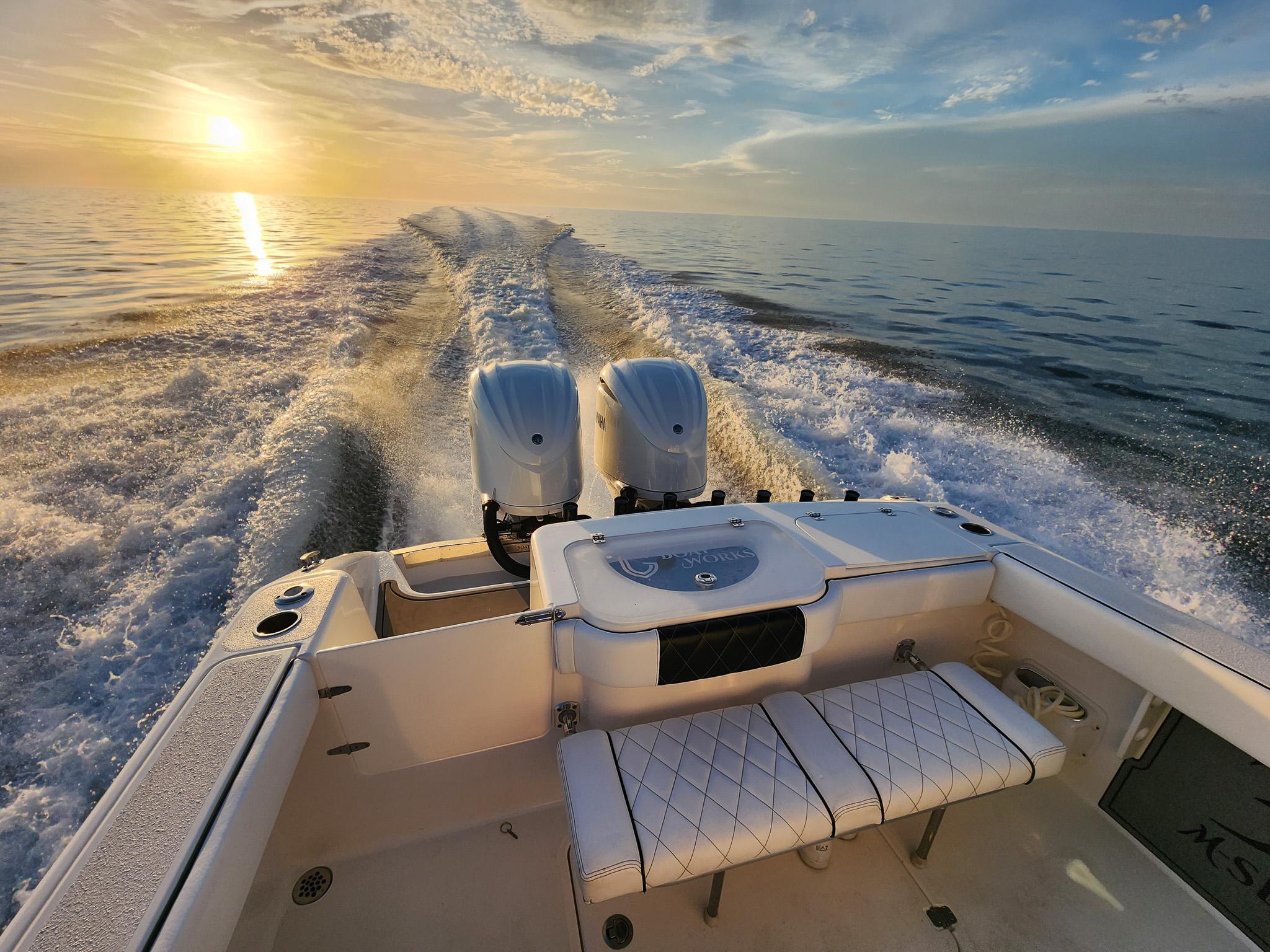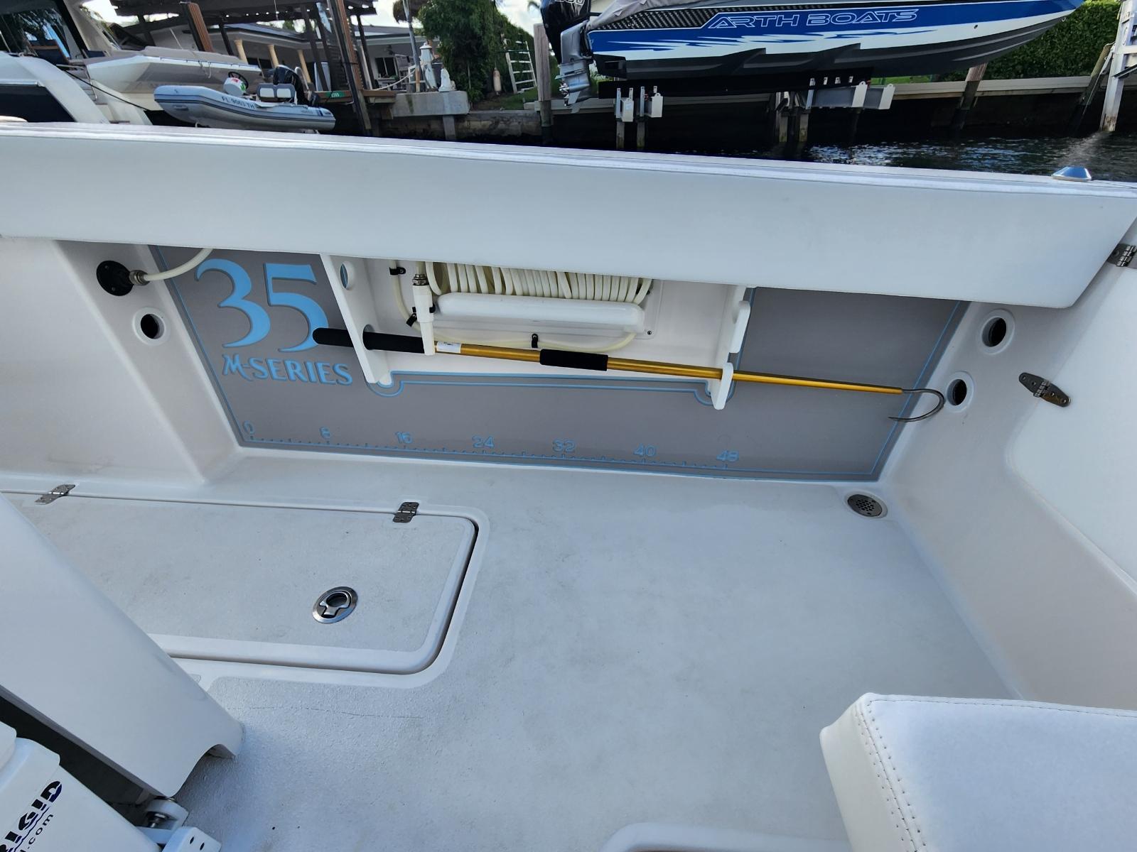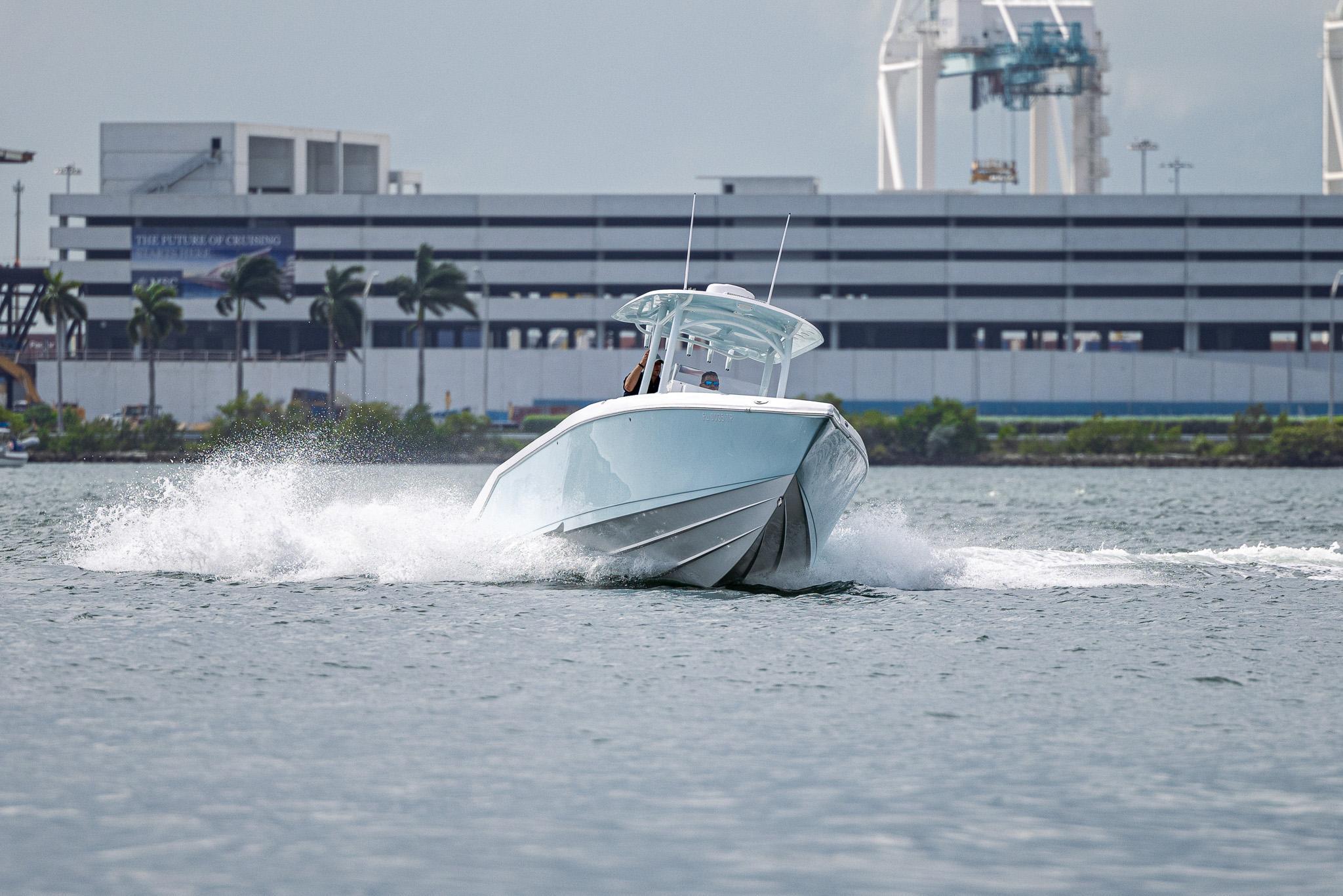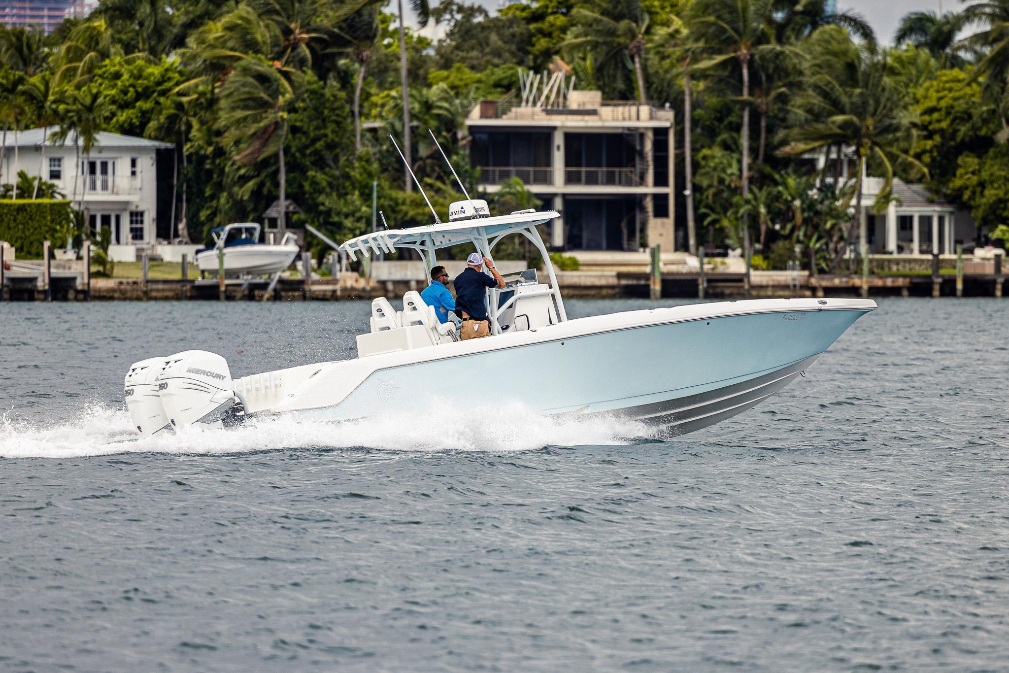 The CG Boatworks 35 M-Series is a proven stepped-hull center console for anglers who want to get where they're going fast. The 35 M-Series has a 9'4" beam, which allows for more room on deck for Family/Anglers. Built on a proven high-performance, 2-stepped, deep-V hull with an open bow with a large casting platform. The helm has a spacious dash layout with (2) 12" Garmin's. Standard features include an integrated dive platform, fiberglass T-Top with rod holders, 35-gallon transom livewell, 12-gallon small livewell, insulated in-deck fish boxes two 250 quart and a bow fish box 350 quart, leaning post with rod holders, cockpit fresh water shower, raw-water washdown, slide out removable cooler, transom rear folding bench seating, console tackle box, cockpit bolsters, dive ladder, rod holders, large center console storage for tackle, safety equipment, and room for a head, spacious Llebroc helm seats with drop down bolsters covered in Silicone Upholstry. Lenco heavy-duty electric trim tabs, pop-up cleats, and transom door. Twin Mercury Verado Supercharged outboards deliver a Top speed of 73 mph with a cruising speed of 38 mph 2.1 mpg. CG Boat Works 2 engine design results:VALUE - Lower Initial Cost, Less Maintenance, and Lower Insurance Costs than 3 enginesEfficient - Less Maintenance and lower Fuel Costs than 3 enginesSustainable - Less Engine Emissions and less Fuel Burn than 3 enginesRELIABLE - 10 year Hull WarrantyThe best value/performance and fuel consumption center consoles on the market.