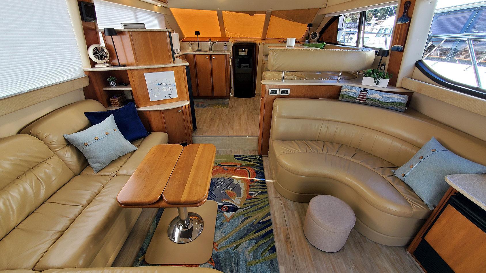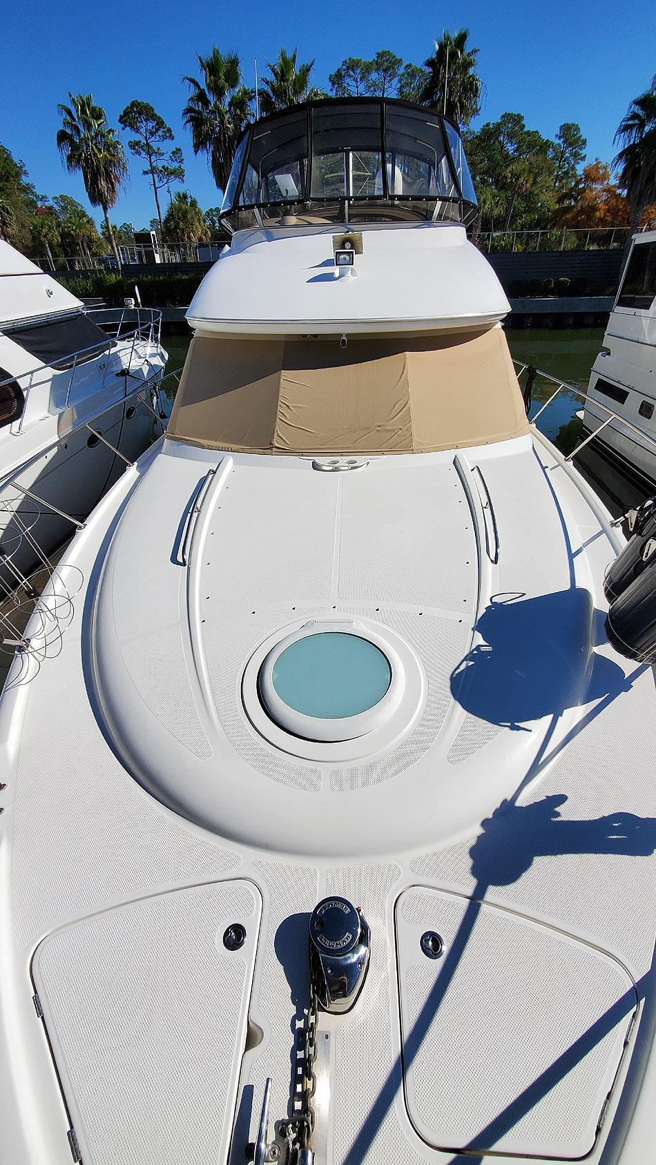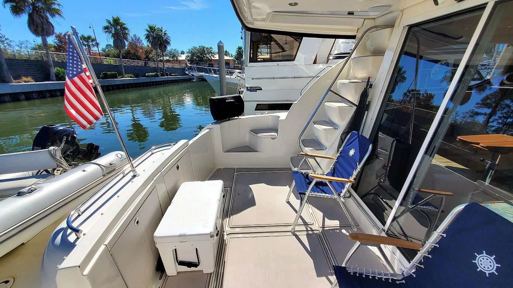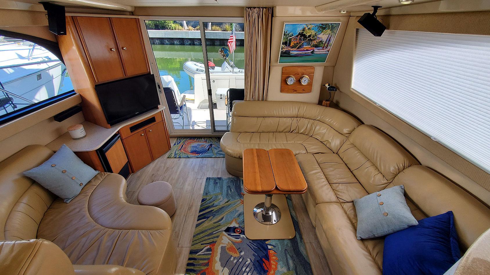 Boarding Into the Mystic is convenient and easy to do with only one step via the swim platform, into the spacious cockpit and leading you directly into the salon. Upon entering the salon, you'll find a spacious and inviting layout. Immediately to starboard is the electrical panel and entertainment center built into a hardwood corner cabinet. Further forward to starboard is a curved loveseat with storage underneath. To port is a large L-shaped sofa with two built in recliners along the port bulkhead and a hi-lo, fold out hardwood table. Forward of the salon and up one step is the fully equipped, large L-shaped galley to port. Adjacent to the galley to starboard is a 5-6 person U-shaped dinette is with large Corian style table. Forward of the galley and dinette is the berthing spaces companionway. Stepping down two steps is the landing outside the VIP stateroom. Down two more steps you enter the VIP stateroom to starboard. Along the starboard bulkhead is several cabinets and a large built in chair. The centered queen berth of the VIP stateroom is located to port under the dinette. Access to the VIP wet head can be made directly from inside the VIP stateroom or from the berthing companionway. The master stateroom is forward in the bow and offers a centered queen berth and a private master head with separate shower. Back in the cockpit you can access the flybridge via the port side molded stairway. The flybridge is fully enclosed and very spacious. The fully equipped helm is located on the starboard side of the flybridge and has a two person bench seat. Aft of the bench seat is a small wet bar and a another large bench seat. To port is another curved bench seat from the stair to the helm. Behind the aft bench seat is a large storage area. From the cockpit the flybridge stairway lifts up to provide access to the engine room. The engine room can also be accessed via sole hatches in the salon. Port and starboard side walkways lead from the cockpit to the bow.