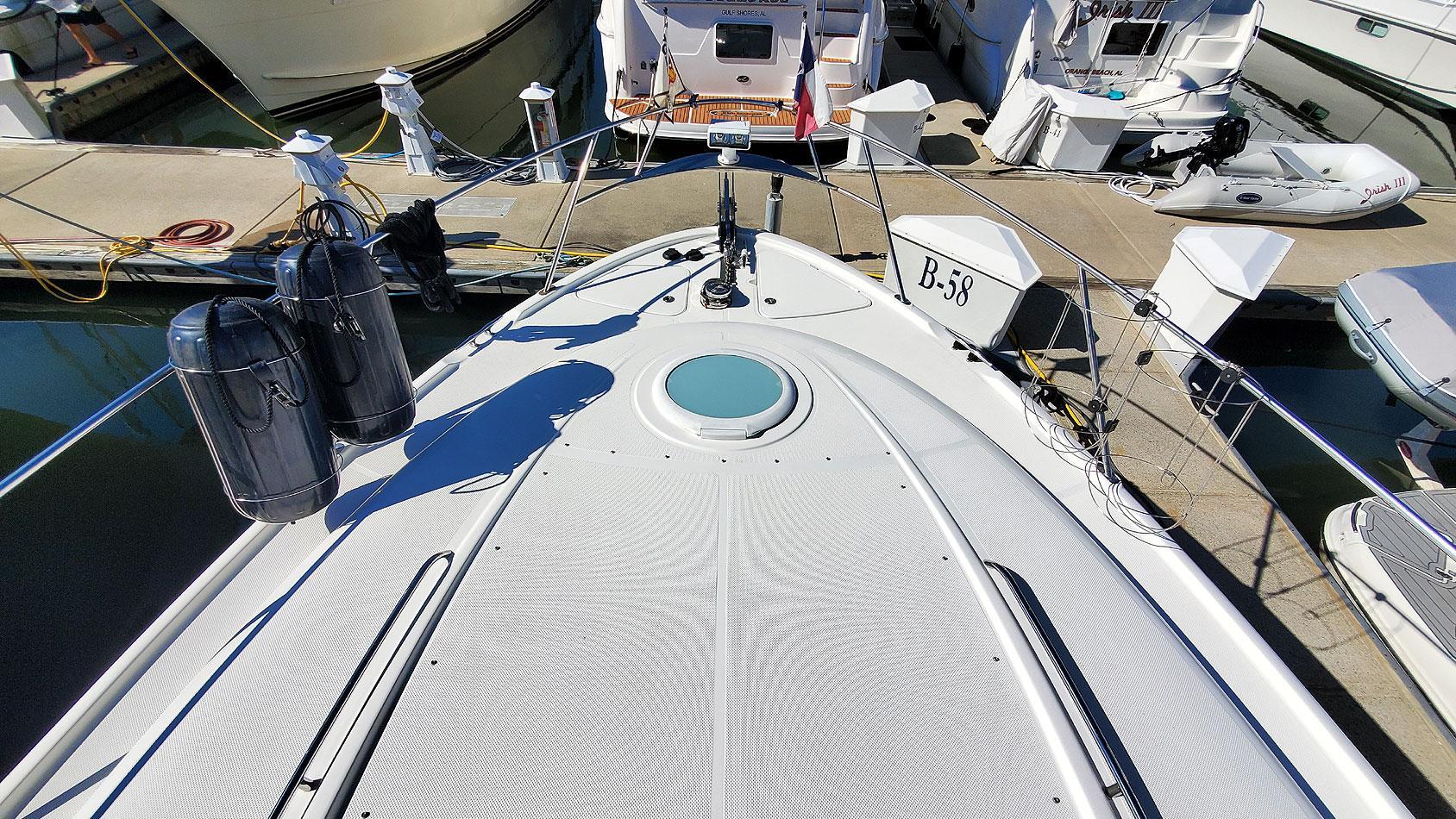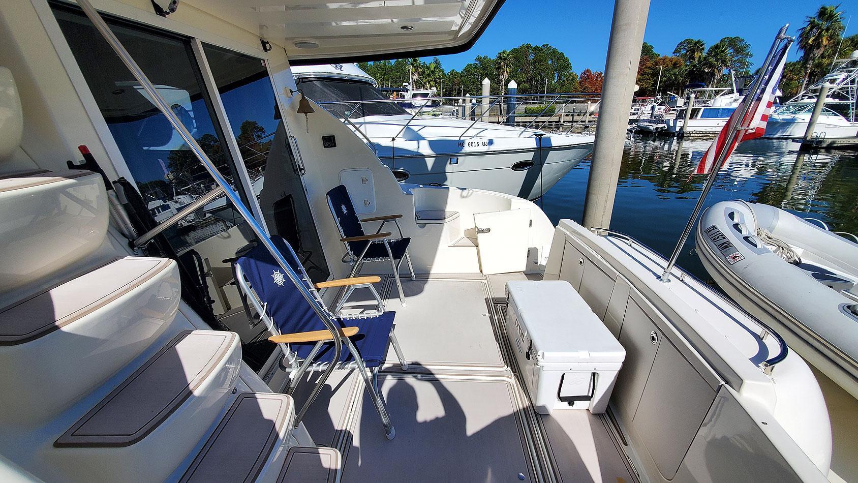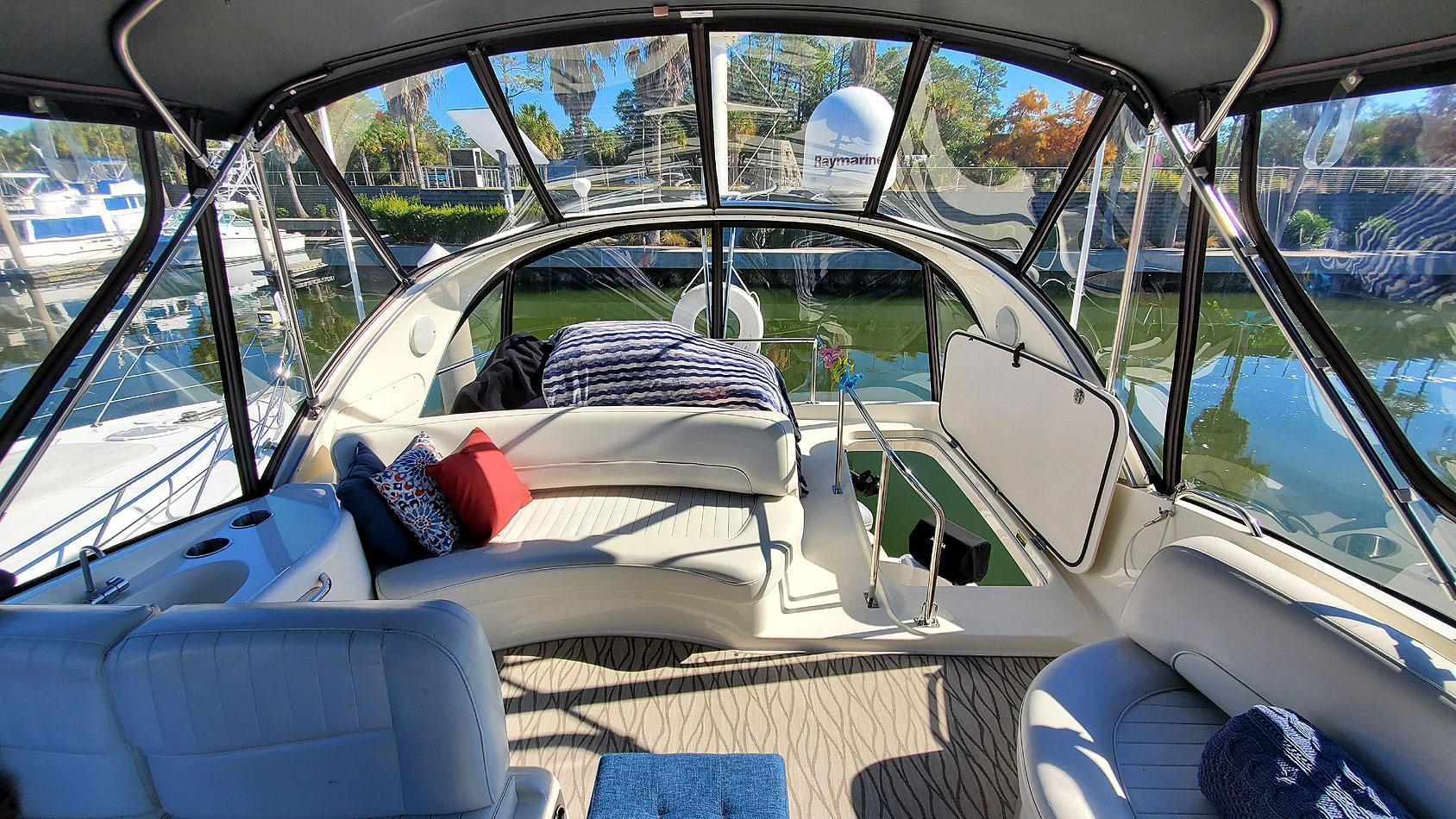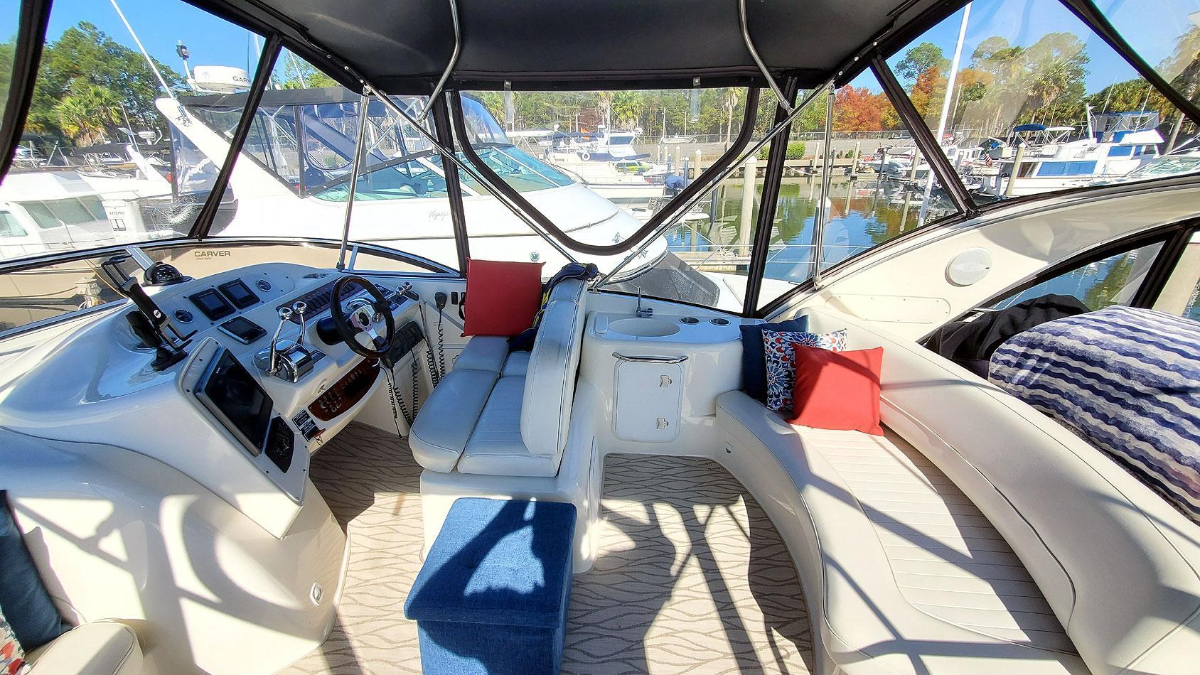 Boarding Into the Mystic is convenient and easy to do with only one step via the swim platform, into the spacious cockpit and leading you directly into the salon. Upon entering the salon, you'll find a spacious and inviting layout. Immediately to starboard is the electrical panel and entertainment center built into a hardwood corner cabinet. Further forward to starboard is a curved loveseat with storage underneath. To port is a large L-shaped sofa with two built in recliners along the port bulkhead and a hi-lo, fold out hardwood table. Forward of the salon and up one step is the fully equipped, large L-shaped galley to port. Adjacent to the galley to starboard is a 5-6 person U-shaped dinette is with large Corian style table. Forward of the galley and dinette is the berthing spaces companionway. Stepping down two steps is the landing outside the VIP stateroom. Down two more steps you enter the VIP stateroom to starboard. Along the starboard bulkhead is several cabinets and a large built in chair. The centered queen berth of the VIP stateroom is located to port under the dinette. Access to the VIP wet head can be made directly from inside the VIP stateroom or from the berthing companionway. The master stateroom is forward in the bow and offers a centered queen berth and a private master head with separate shower. Back in the cockpit you can access the flybridge via the port side molded stairway. The flybridge is fully enclosed and very spacious. The fully equipped helm is located on the starboard side of the flybridge and has a two person bench seat. Aft of the bench seat is a small wet bar and a another large bench seat. To port is another curved bench seat from the stair to the helm. Behind the aft bench seat is a large storage area. From the cockpit the flybridge stairway lifts up to provide access to the engine room. The engine room can also be accessed via sole hatches in the salon. Port and starboard side walkways lead from the cockpit to the bow.