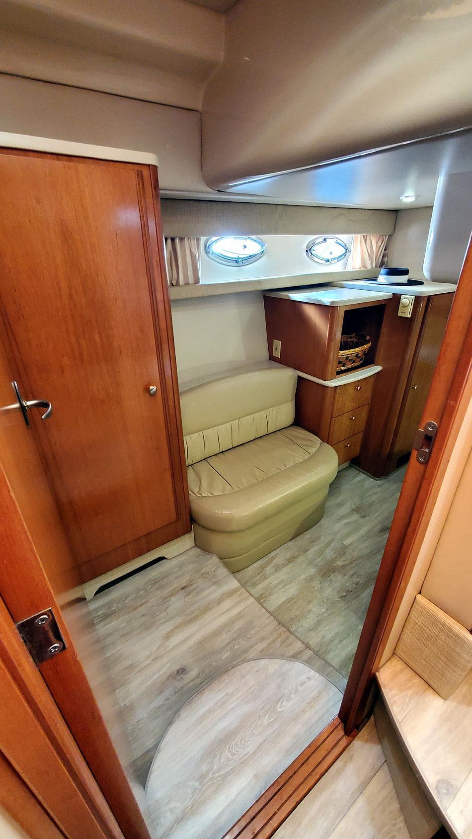 The VIP stateroom is located aft to starboard of the master stateroom and features a centered queen berth with mirrored headboard, large mirror along the aft bulkhead, side tables and reading lights on each side. The queen berth not only provides a comfortable sleeping arrangement but also offers large under-berth storage to stow personal belongings. For added convenience along the port bulkhead there is a large hanging locker, a built in cushioned chair, a three drawer cabinet and another large hanging locker. Forward in the VIP stateroom, a private door leads to the VIP\guest wet head, enhancing the privacy and convenience of this space. Natural light and ventilation is provided by two portlights on the port side. The sole of the VIP stateroom is hardwood vinyl planking. The VIP\guest wet head is thoughtfully designed and equipped with a stainless steel under-counter mounted sink, a stylish Corian countertop, and dual mirrors above the vanity. The Vacuflush toilet is to the right of the vanity and has a double sliding door storage compartment above it with a hardwood shelf and single portlight above that. The sole is molded fiberglass and a shower curtain rail in the overhead surrounds the entire space and the pull out shower head\sink faucet provides showering capabilities. This thoughtful design ensures that guests have all the amenities they need for a pleasant and enjoyable stay on the yacht.