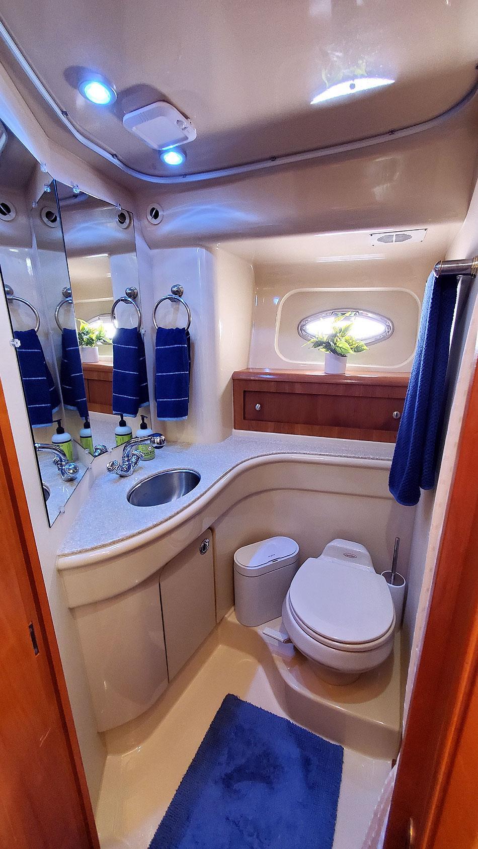 The master stateroom is a spacious and inviting space located in the bow of this yacht. The centered queen-sized berth takes prominence and featured a mirrored headboard, a side shelf on both sides and reading lights. The queen berth not only provides a comfortable sleeping arrangement but also offers large under-berth storage to stow personal belongings. There are two portlights, one port and one starboard and an overhead hatch that lets in natural light and provide ventilation, enhancing the comfort of the space. Along the port bulkhead of the stateroom, you'll find a generously sized storage and hanging locker, a Clarion stereo system with speakers, an LG 22" flat screen TV and a Dish satellite TV box. The sole is hardwood vinyl planking and in nice condition. The ensuite head is situated to port aft in the space It features a vanity with a stainless steel sink mounted under a Corian style countertop, a large, mirrored medicine cabinet for storage and grooming needs and under-counter storage. A large fully enclosed shower stall with bench seat is next to the vanity and a VacuFlush toilet is next to the shower. The sole is molded fiberglass.
