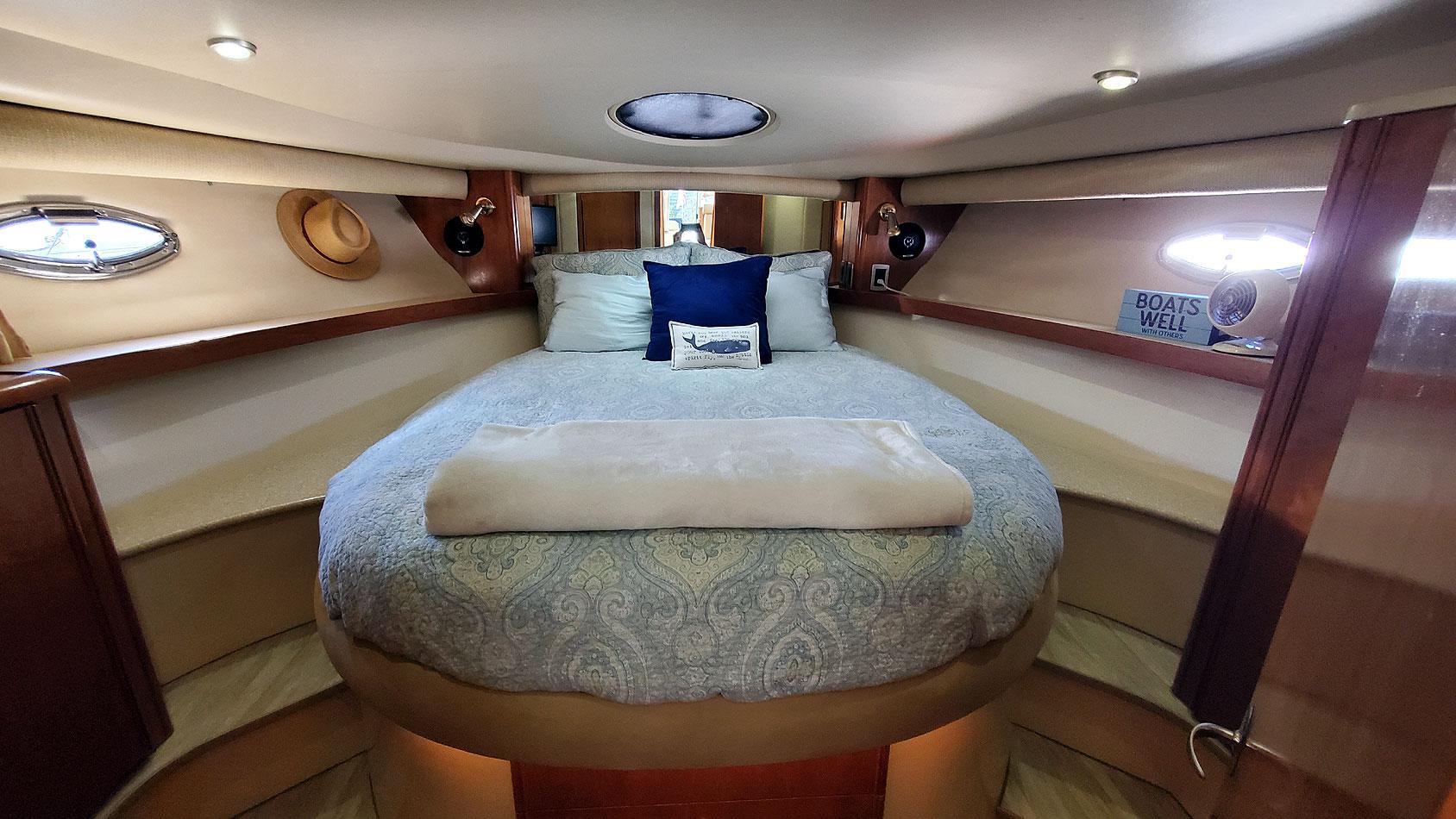 The accommodations on this motor yacht offer a comfortable sleeping arrangement for four people. The starboard VIP stateroom features an centered queen bed that can sleep two. The master stateroom forward in the bow also features a centered queen berth that can also sleep two. The dinette can also convert to an additional double berth with a cushion that is included.