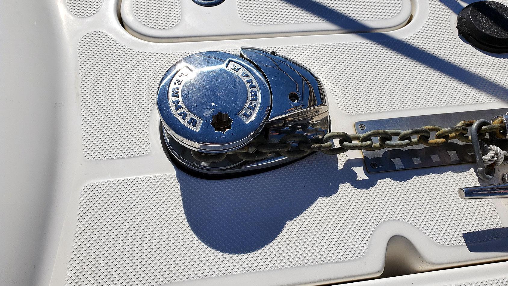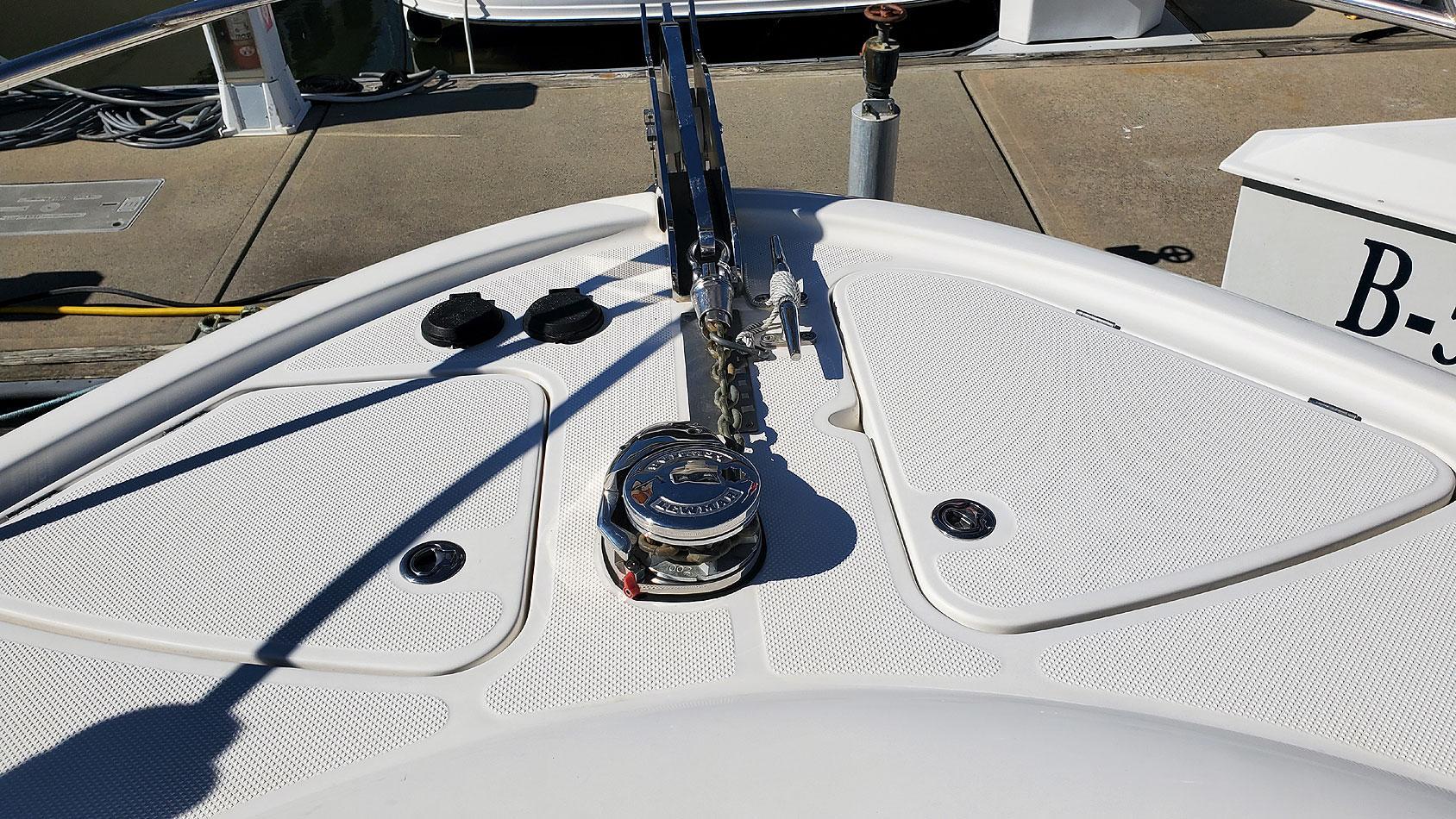 The spacious cockpit, as well as the swim platform on this motor yacht, offer a delightful outdoor area for various activities, such as line handling, tender operations and entertaining. Engine room access is conveniently located under the flybridge stairway, ensuring easy maintenance and inspection of the yacht's machinery. Additionally, deck hatches provide access to the lazarette, which houses essential equipment, including many of the batteries and provides additional storage. The cockpit sole, side walkway steps and stairs to the flybridge as all covered in Sea Deck synthetic flooring. On the swim platform you will find a Glendinning Cordmaster, offering efficient management of the shore power cord, along with dockside water and cable hookup for seamless connectivity. A freshwater hot and cold shower is also located on the swim platform provides added convenience, allowing you to refresh after a swim or outdoor activities. The foredeck can be accessed from the cockpit via walkways on both the port and starboard sides, enhancing mobility around the yacht. The large swim platform is not only a great place for water access but also offers a large storage compartment for stowing various items in the cockpit. Furthermore, it features a fold-and-stow swim ladder, making it easy to enter and exit the water safely and conveniently. A Hurley Marine H3O davit is mounted on the swim platform and hold the Zodiac 11' center console RIB tender and 15 HP Tohatsu outboard motor.