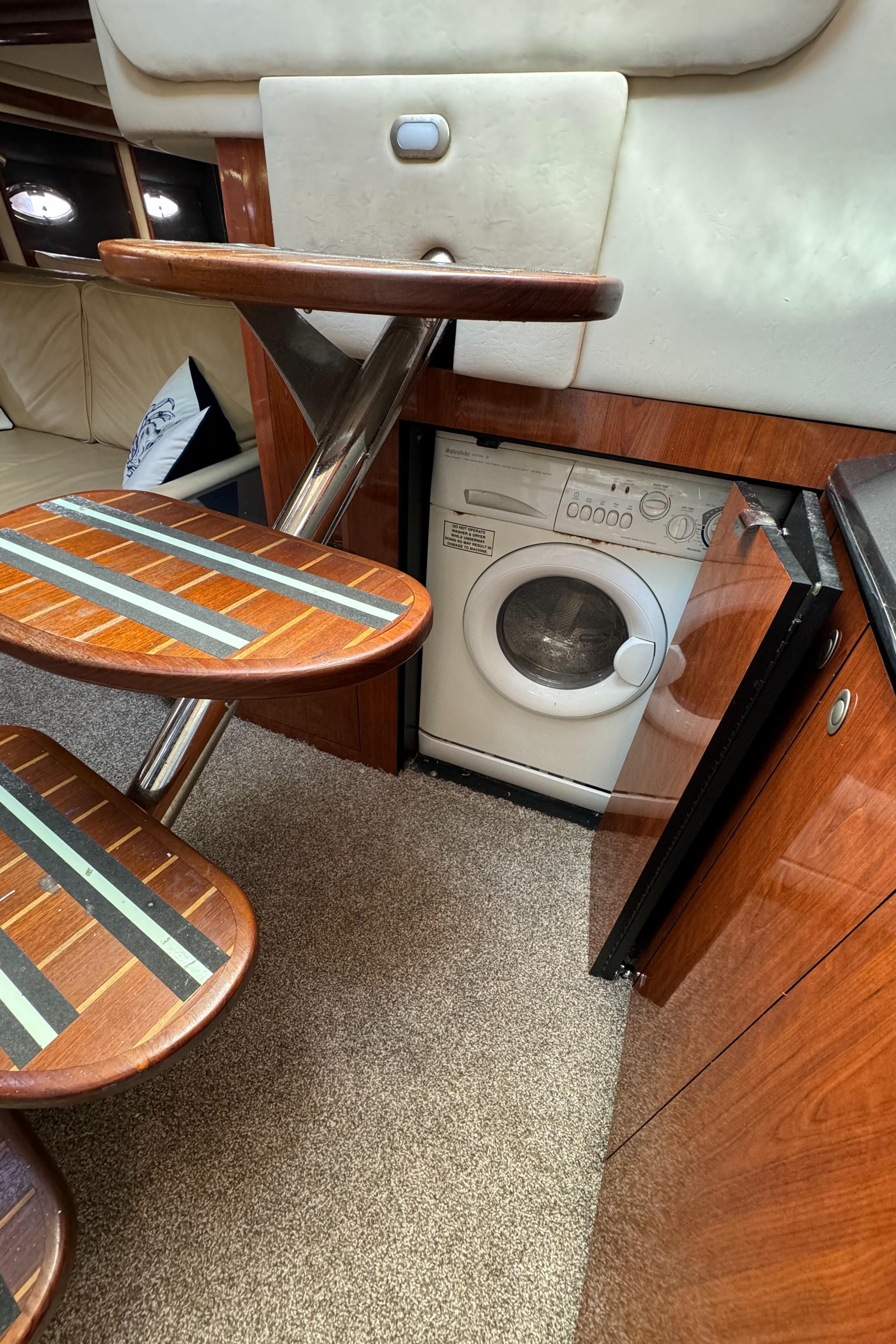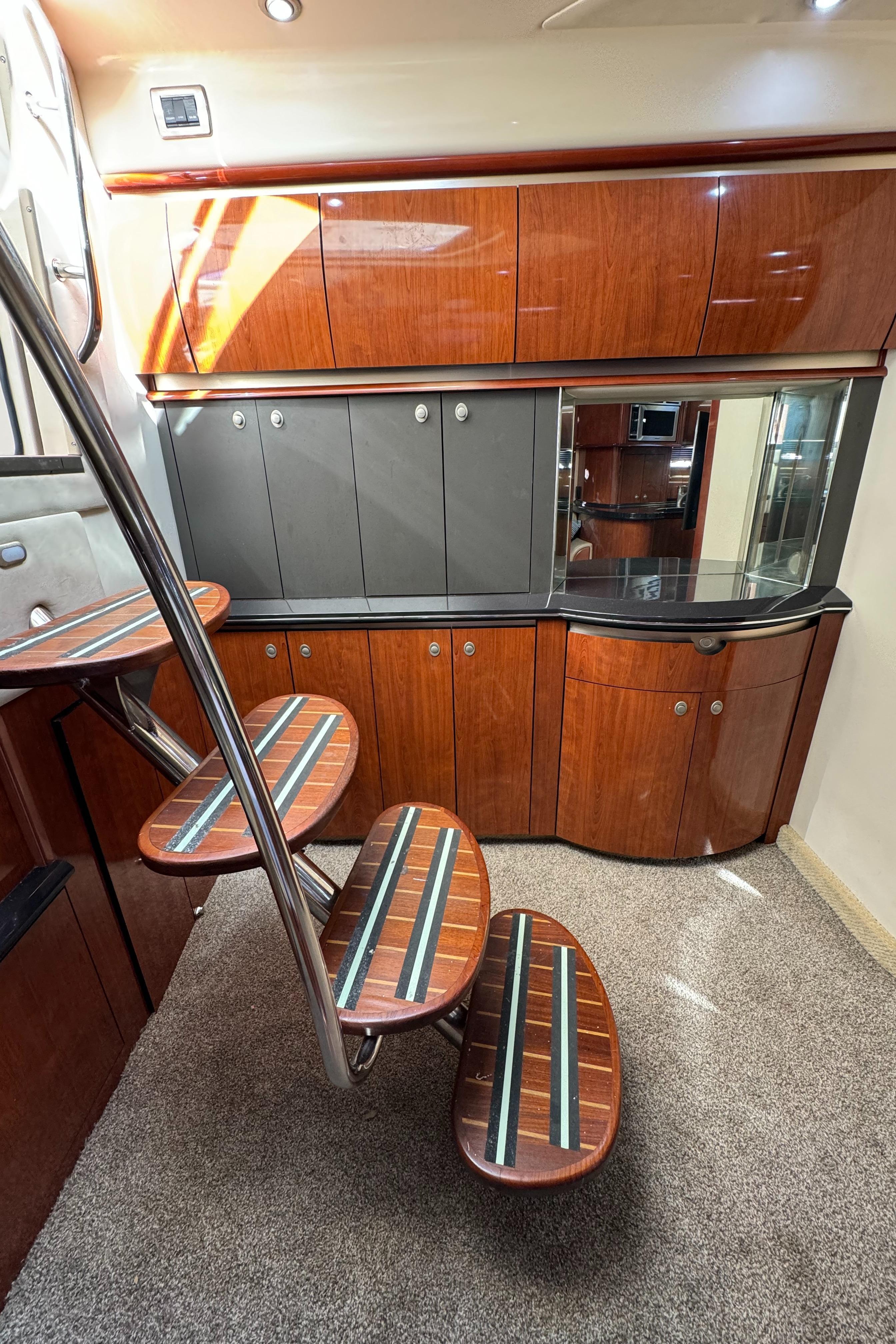- Elevated and oversized helm for enhanced visibility with swivel captains chair and front and rear-facing bench Cockpit wet bar and removable table