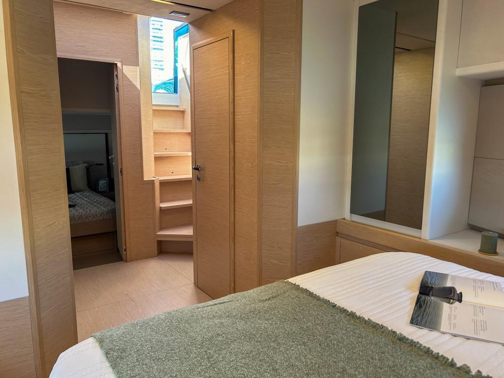 - Standard version: Owner's midship cabin with private bathroom and separate shower, Vip bow cabin with private bathroom and separate shower, Storage compartment, Dormast color interiors, 2 Volvo Penta IPS 650 (440H) engines, Outdoor upholstery Silvertex Ice Cream Color, 4x Service batteries 180Ah, 2x 12" Multi-Function Volvo Display, 9Kw generator, Deck layout with L-shaped galley, Linear sofa, Sunpad, Fixed stern platform, Stainless steel rub rails in stern area, Gunwale on natural wood walkaround.