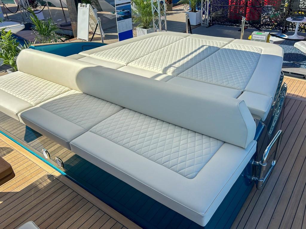 - Deck layout with linear galley, U-shaped sofa facing aft and sunpad, folding cockpit table with stainless steel supports