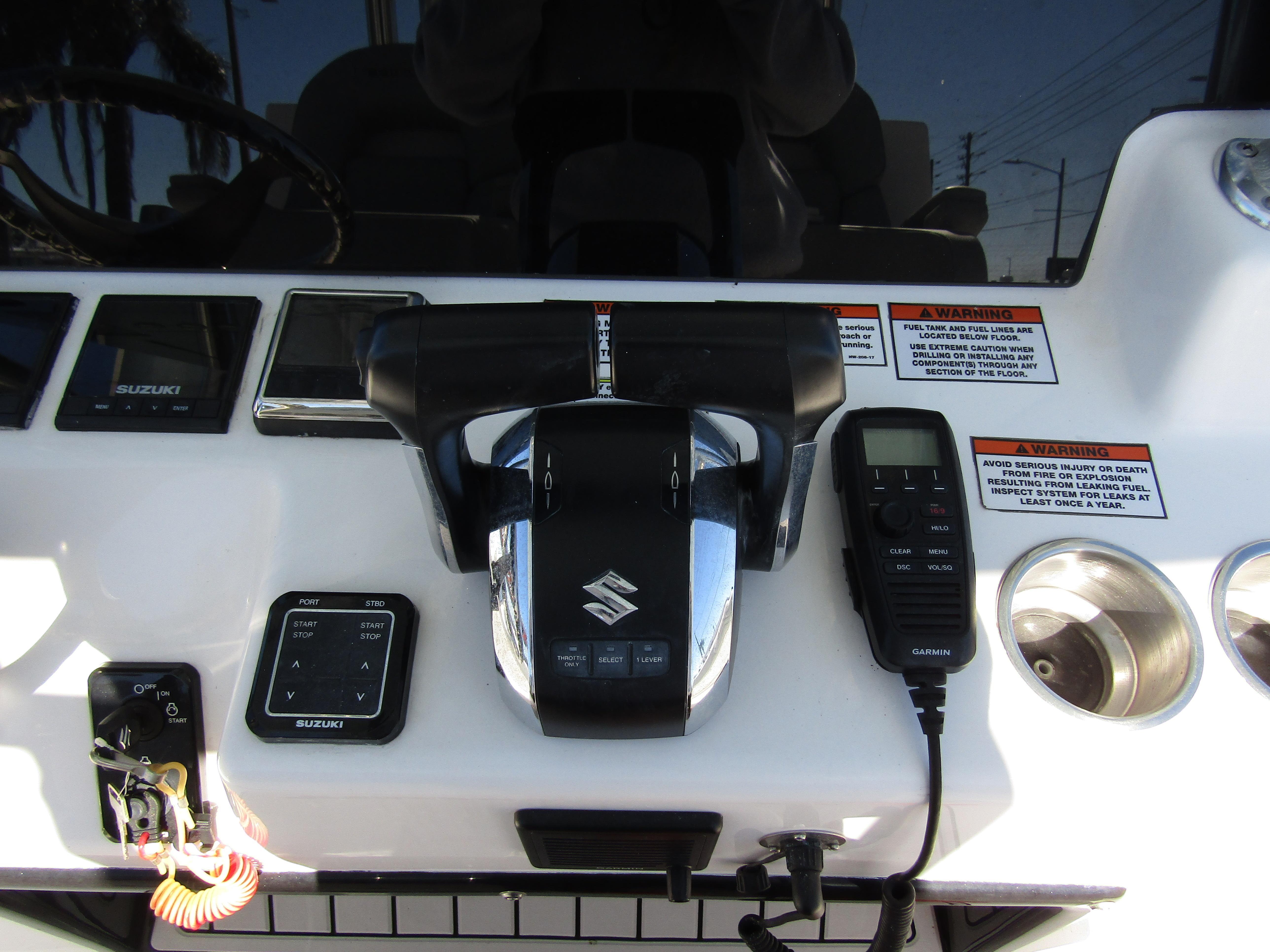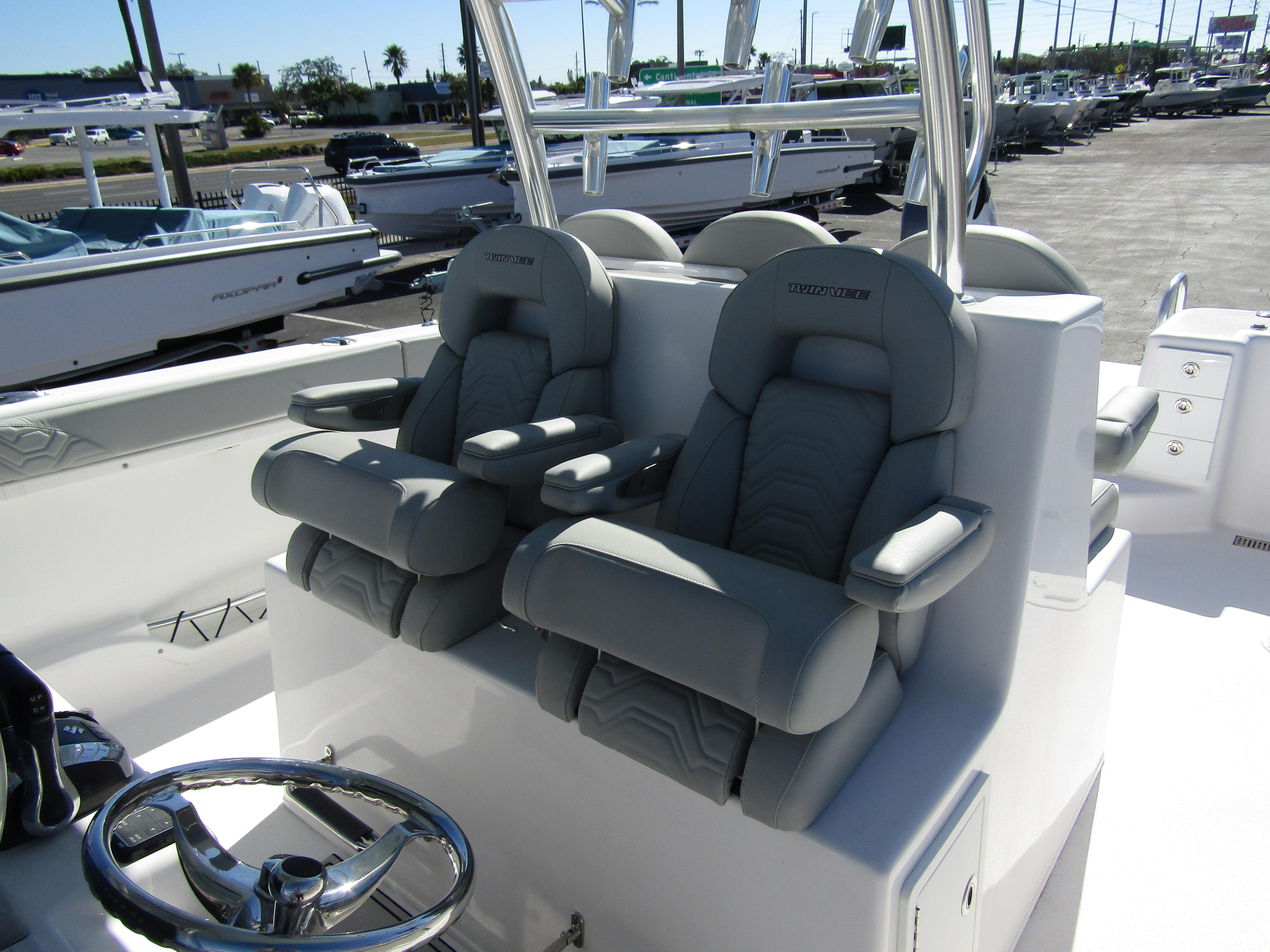 - Premium helm seating w/ arm rests upholstered with marine grade material