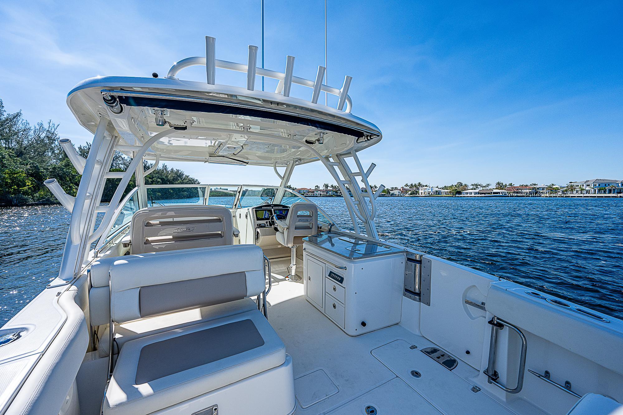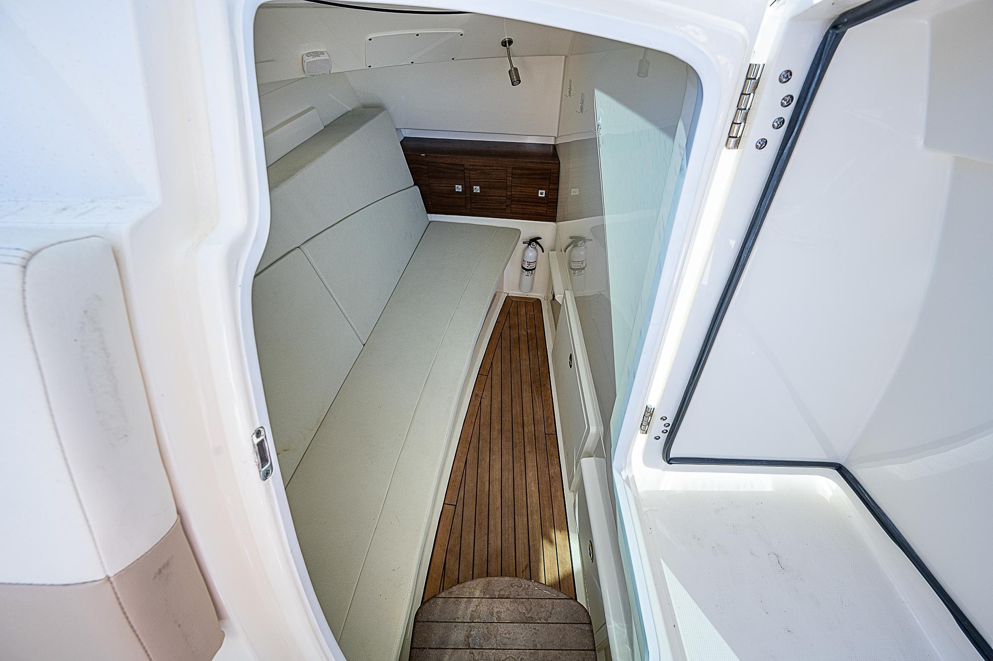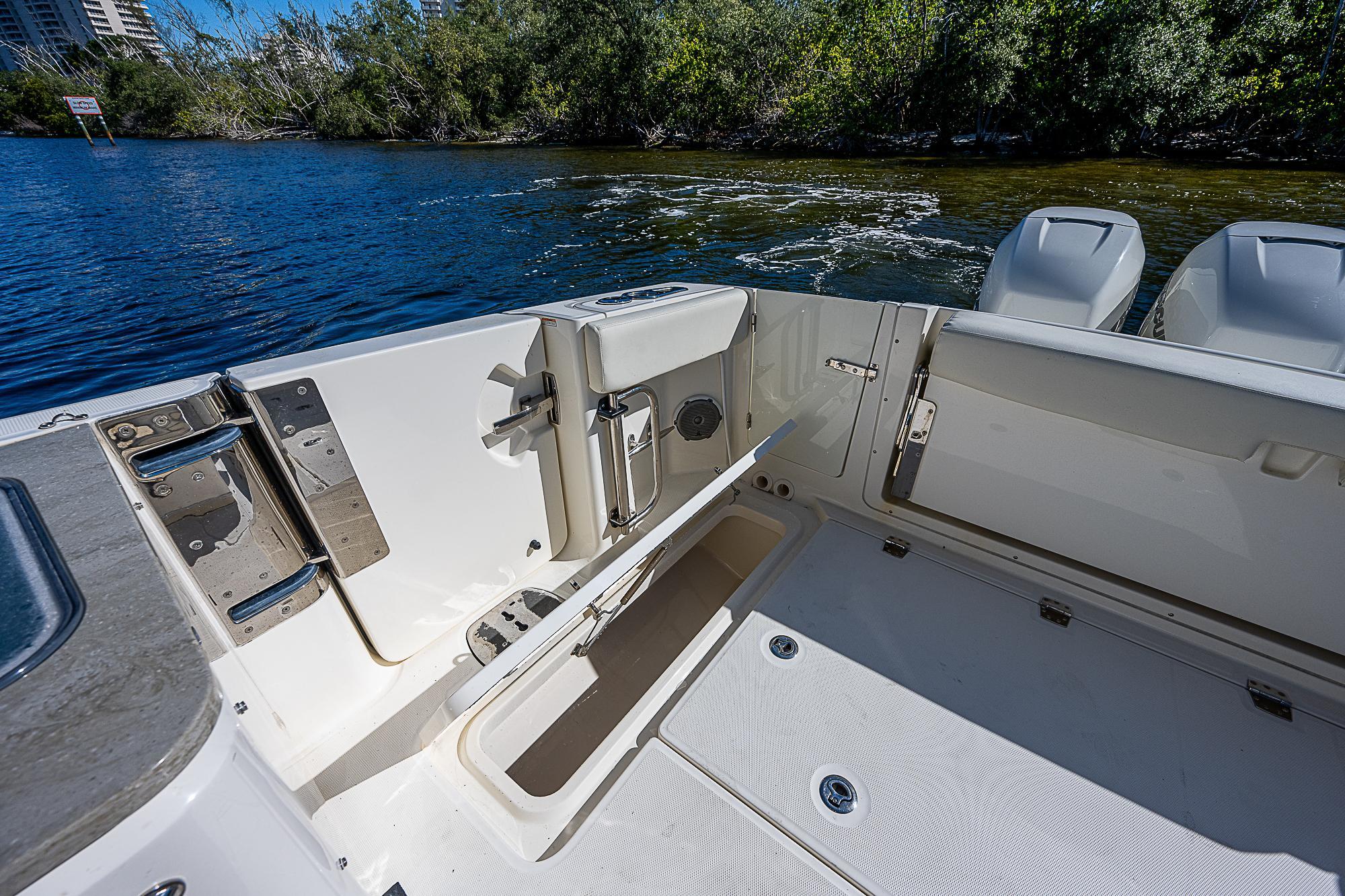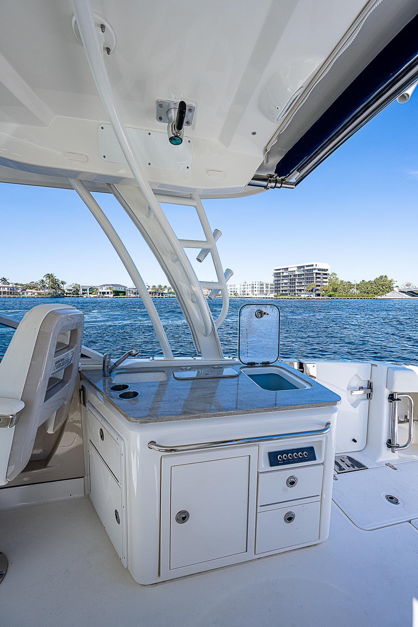 - A cockpit utility center includes a sink, 18-gallon cooler and prep surface, plus optional grill and fridge.