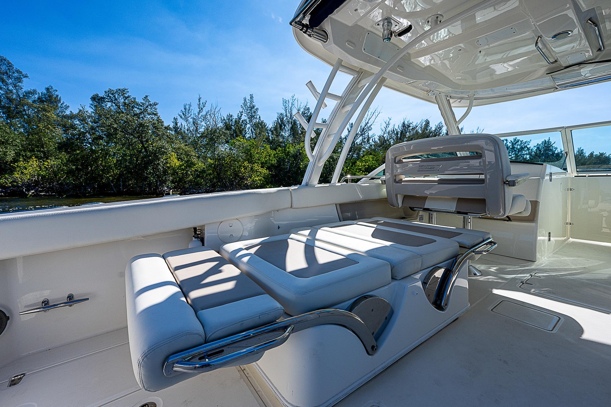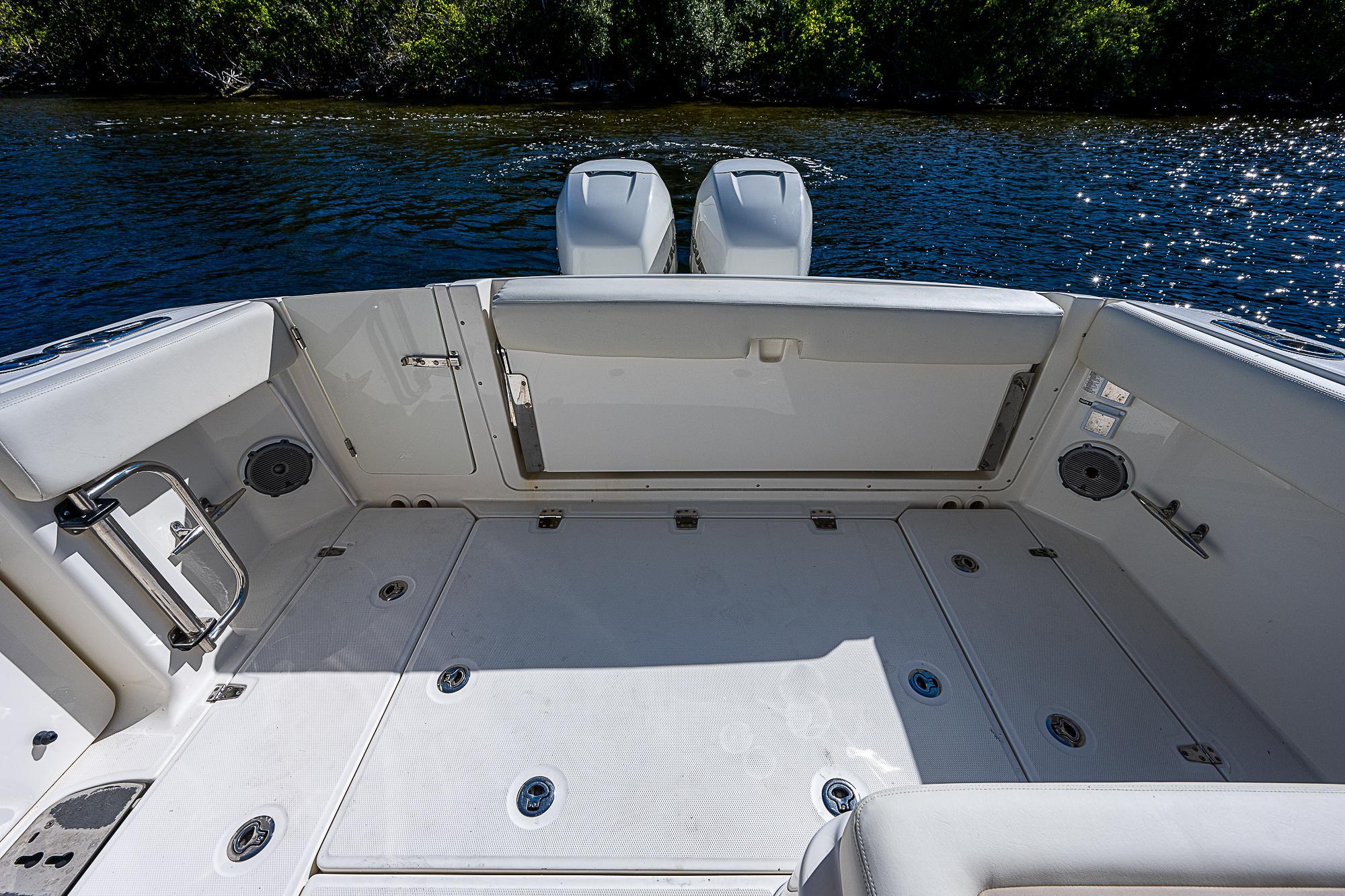 - Double convertible port lounge seat with storage (not available with Deluxe Prep Center with Livewell)