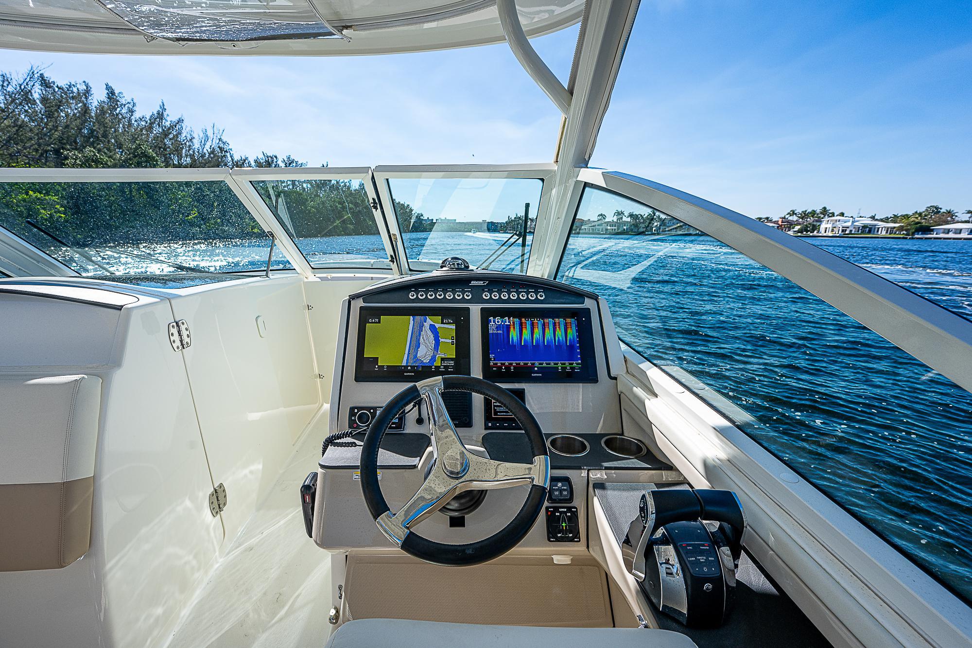 - Two touchscreens at the helm feature available Raymarine electronics and VesselView display.