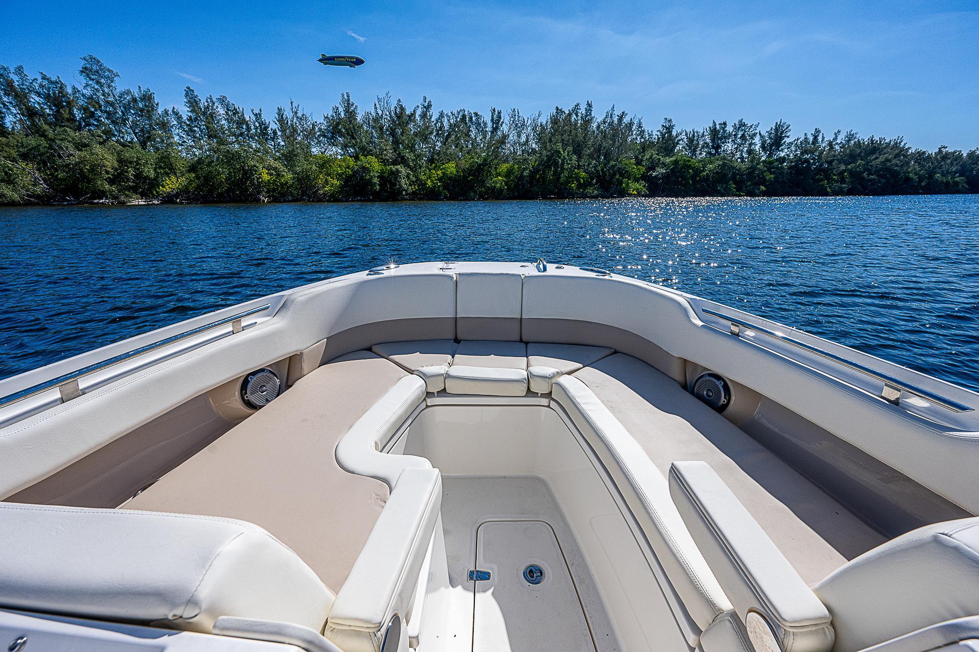 - Bow seating area with lounge backrests and armrests, port and starboard