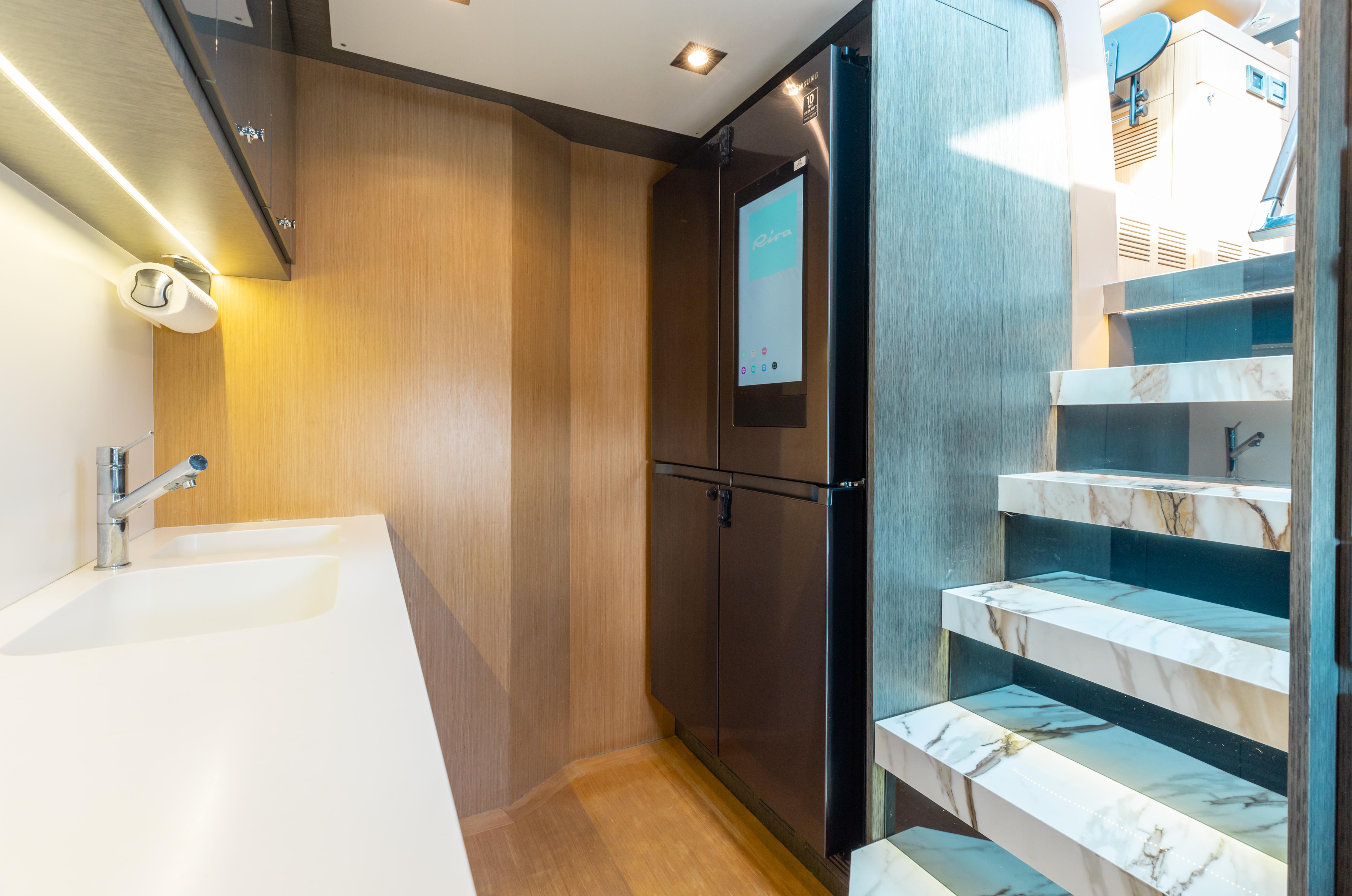 Updates include new salon sofa fillings, an Indel Webasto cockpit ice maker, an eight-person glass dining table, upgraded LED lighting, a new Samsung 55" The Frame QLED 4K TV, salon flooring, and Calacatta steps to the cabins and galley.