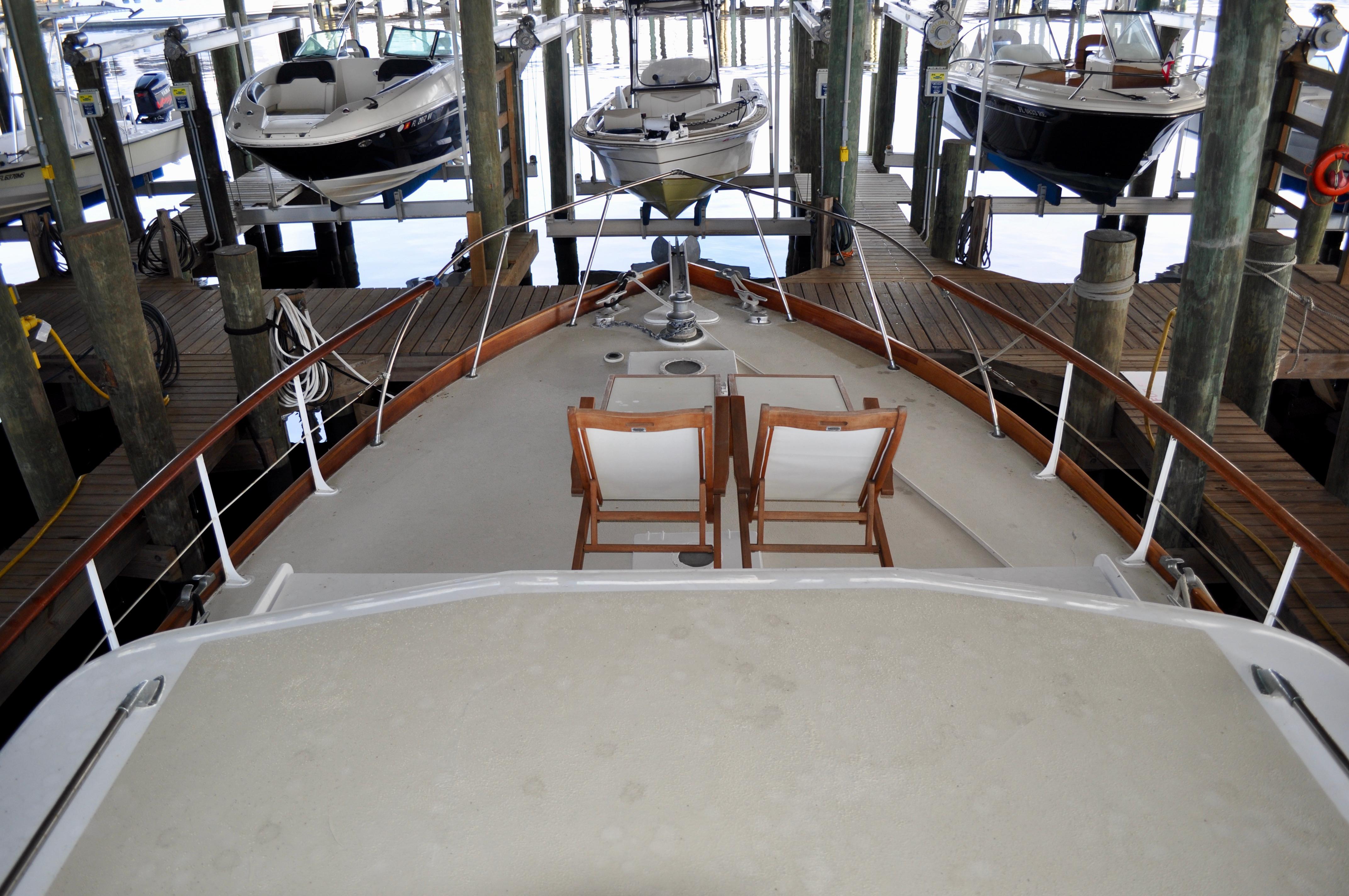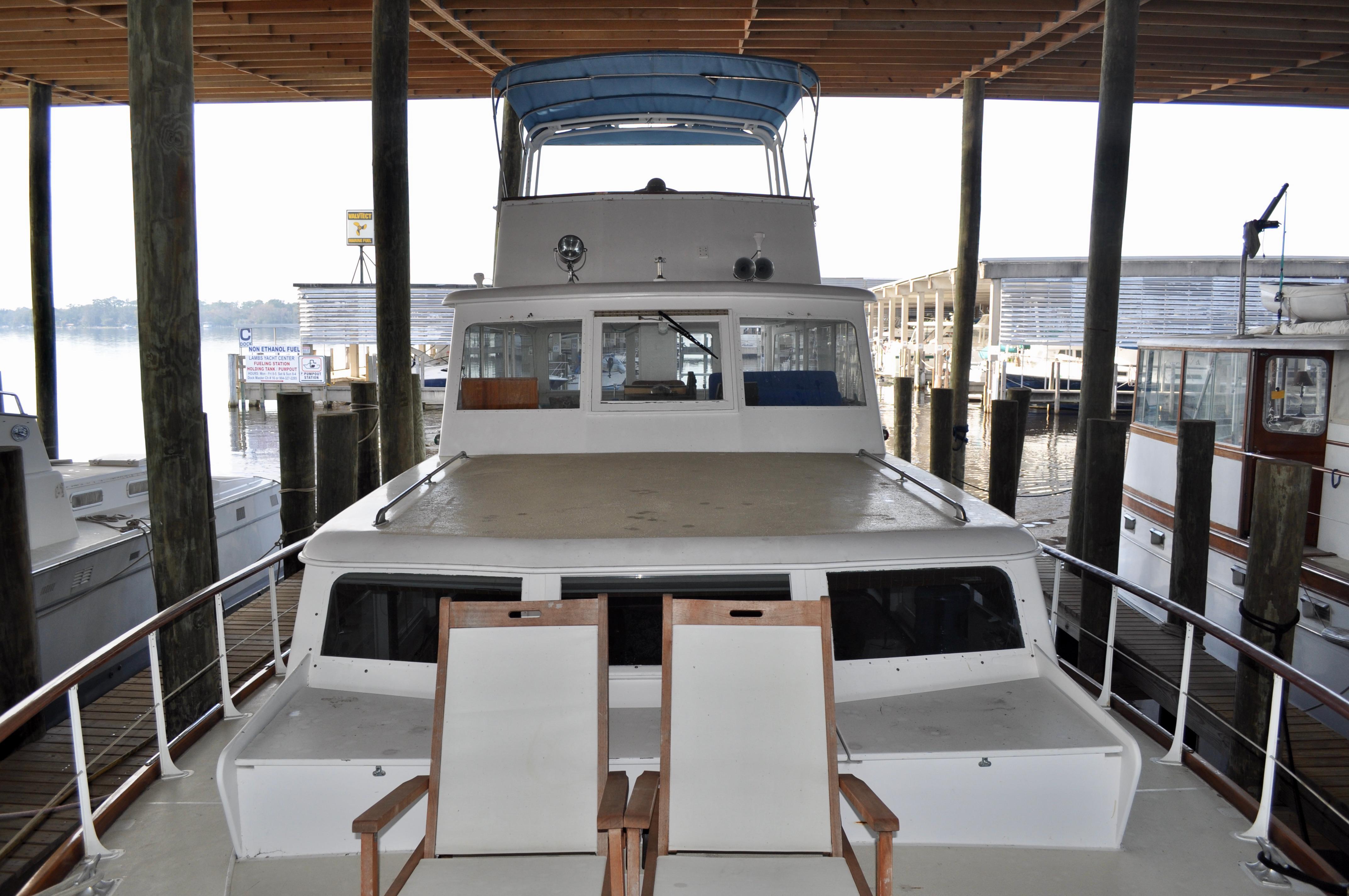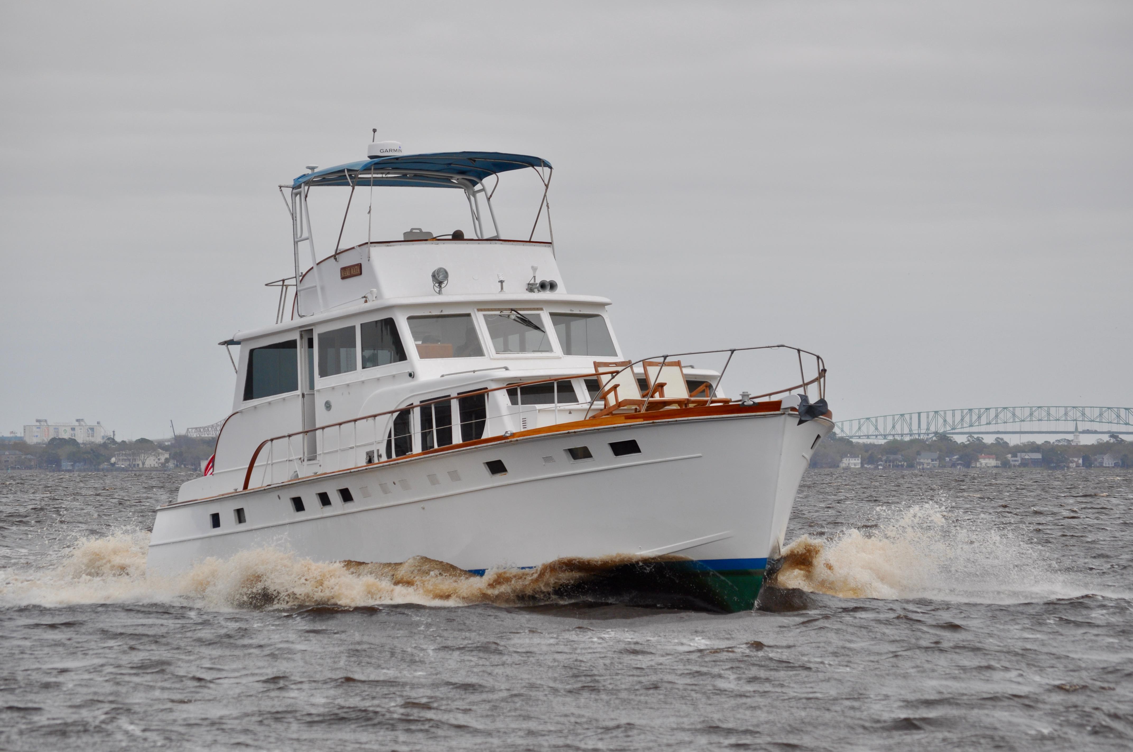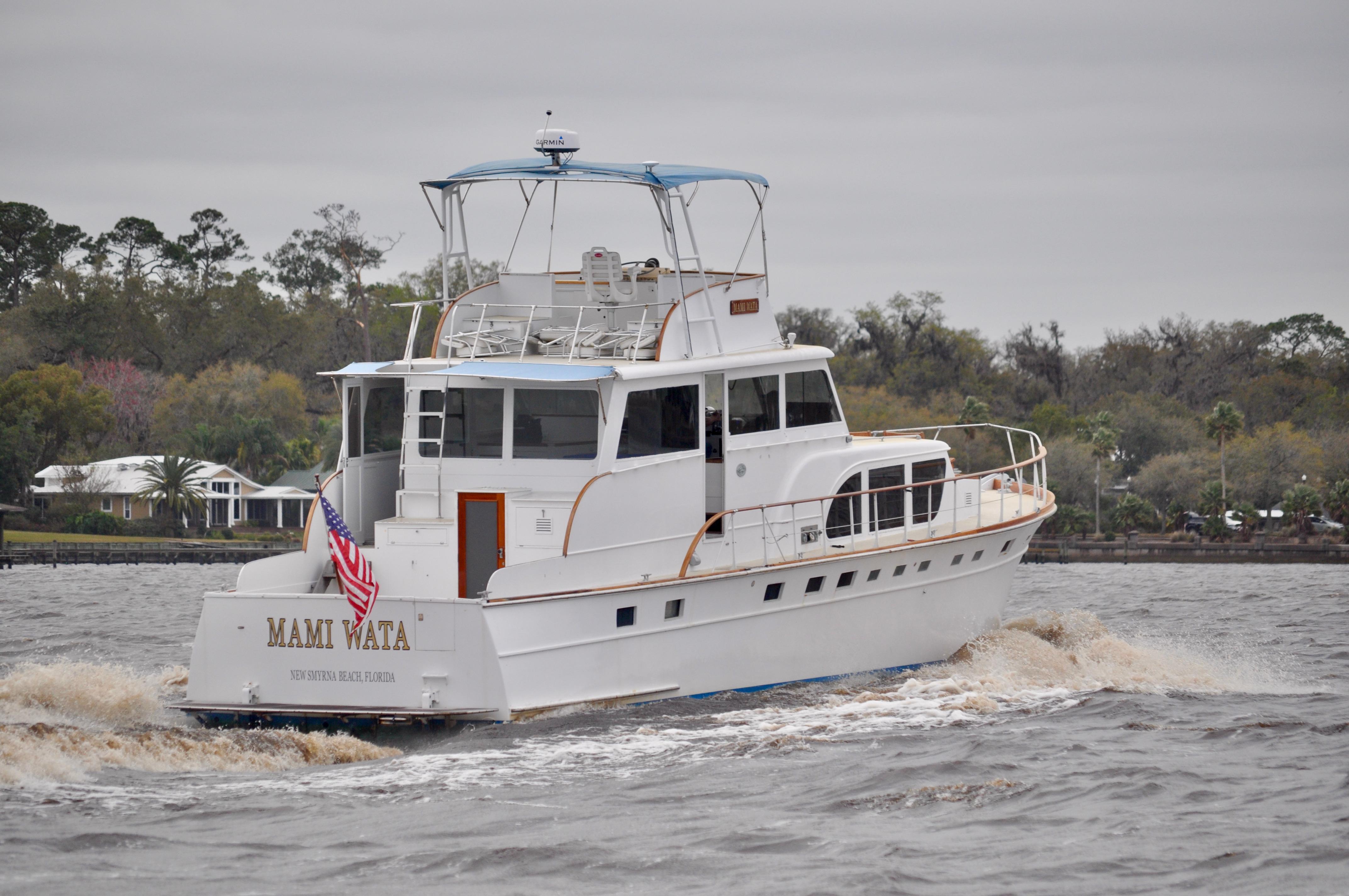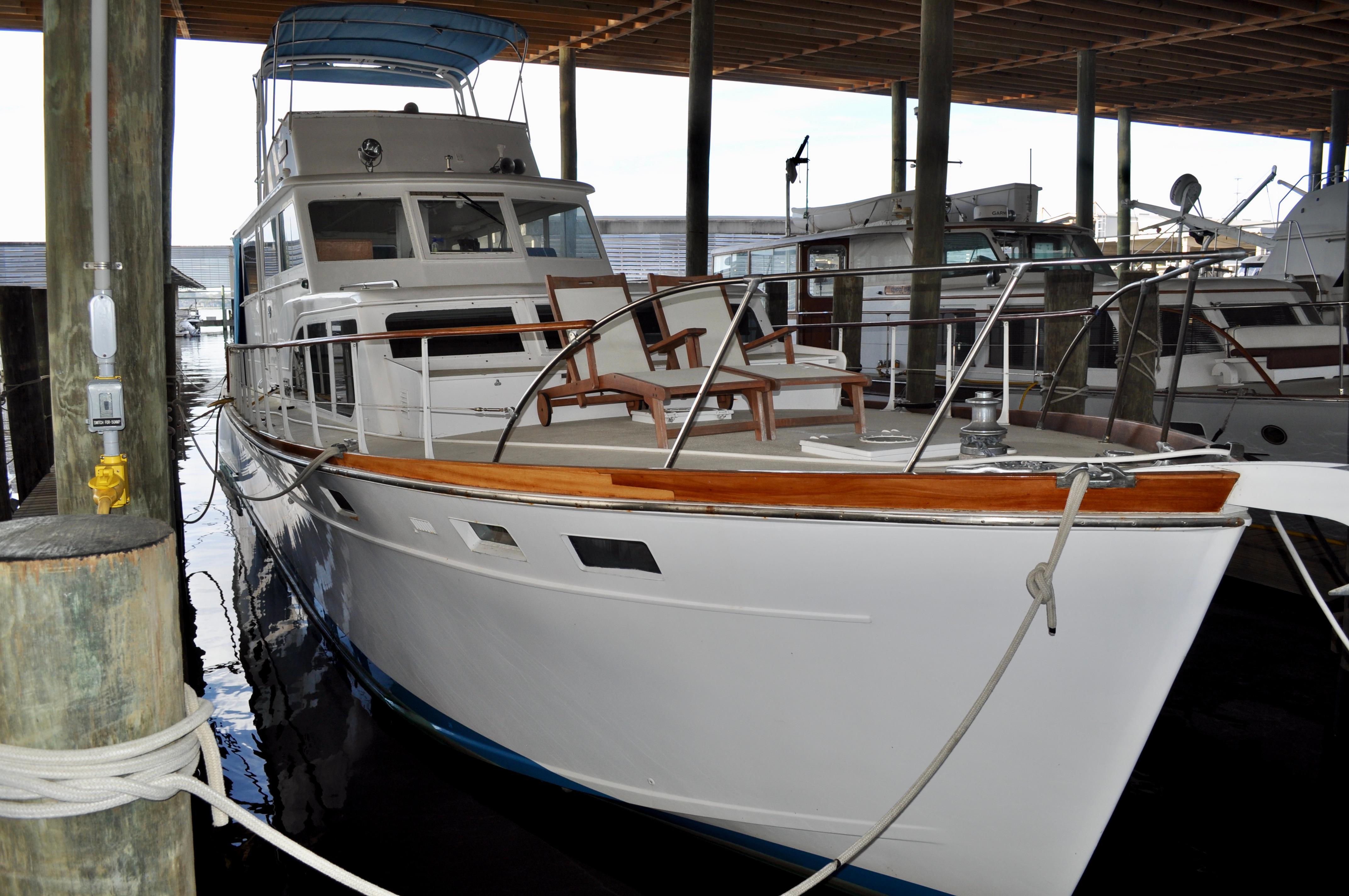 Mami Wata -1973 Huckins Offshore 58. Late model in the Huckins series of cold modeled vessels with epoxy coated bilges.Stepping aboard you will be invited into the large upper salon open to the enclosed lower helm. Stepping down into the lower salon, looking aft, you will find the master and guest staterooms, each accompanied with a private head and stall showers. Going back towards the bow and down the stairs you will entire the fully equipped galley to the port, and dinette to your starboard. Towards the bow you will find the 3rd stateroom and 3rd head with stall shower. Stepping out and down into the cockpit from the upper salon, you will have ample amount of space to fish and entertain as you please. The cockpit floors provide large access hatches to your twin Caterpillar diesels, and brand new Kohler generator, making maintenance a breeze. Climbing up the stairs into the flybridge, you have plenty of space for your friends, family, and crew. Recent Upgrades:New 16.5 Kohler gen setNew custom V-drivesBoth helms rewiredOwners state room converted to queen berthNew cooktopNew Isotherm marine fridgeCarpet removed, replaced with water-proof wood flooringDoor from owner’s state room restored to originalDoor between salon and bridge restored to originalNew Breville ovenNew electronics throughoutWindshield wipers converted to electricNew bottom paintAll top-side mahogany refinishedVarious gauges replaced as neededNew porthole screens throughoutNew cushions on the bow.AC units recently servicedPrevious names, Toolebox, & Kokomo.