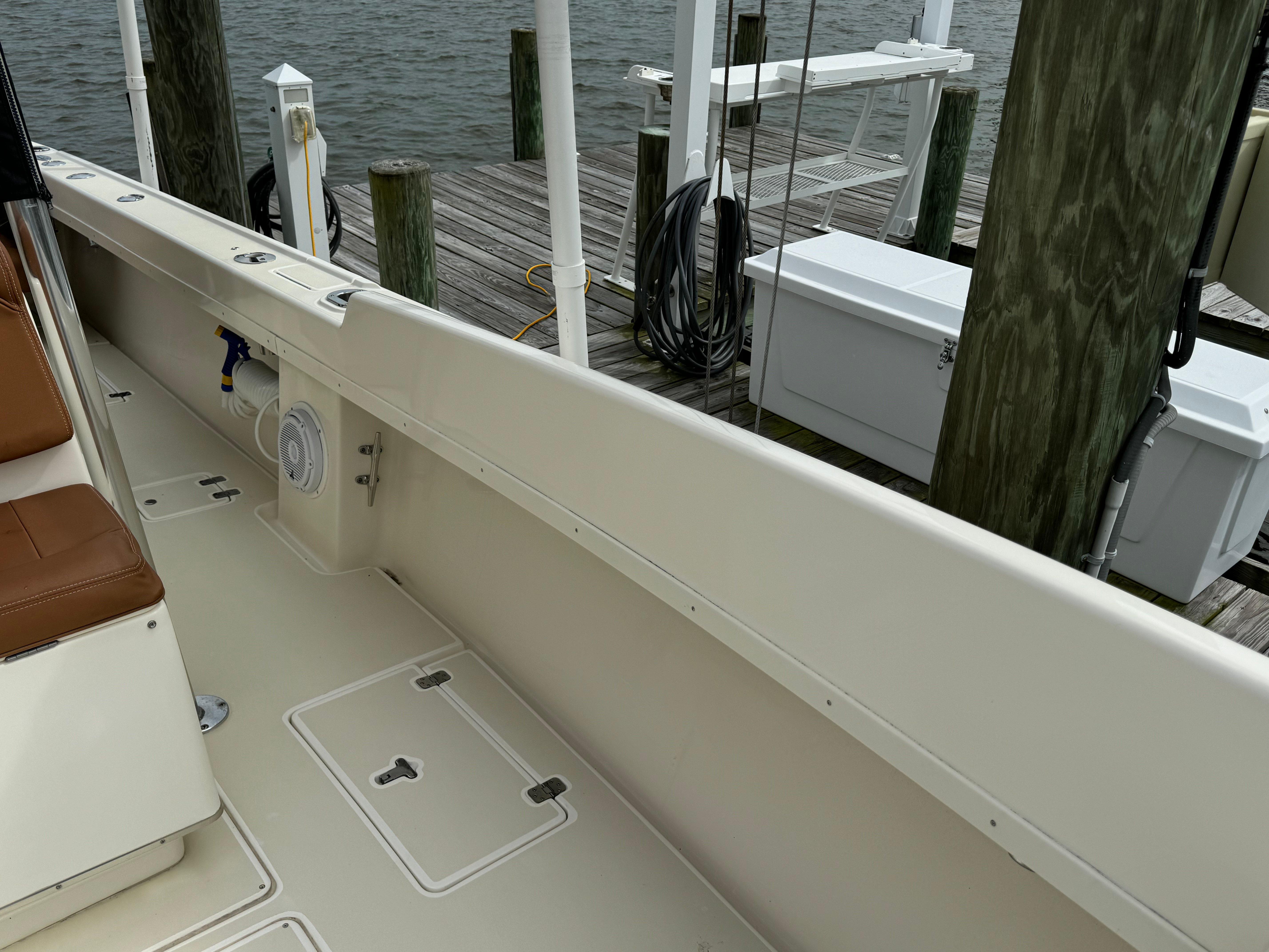 Navigation and control are effortless thanks to a two-year-old 12” Garmin unit paired with a 6k Garmin radar system, autopilot, electronic throttle, and dual VHF radios for dependable communication. Hydraulic Bennett trim tabs and SeaStar steering enhance handling, whether you're running offshore or cruising the coast. The boat also includes a 40’ Birdsall Marine Tackle Master for organized gear storage, outriggers for trolling, and two live wells for bait.