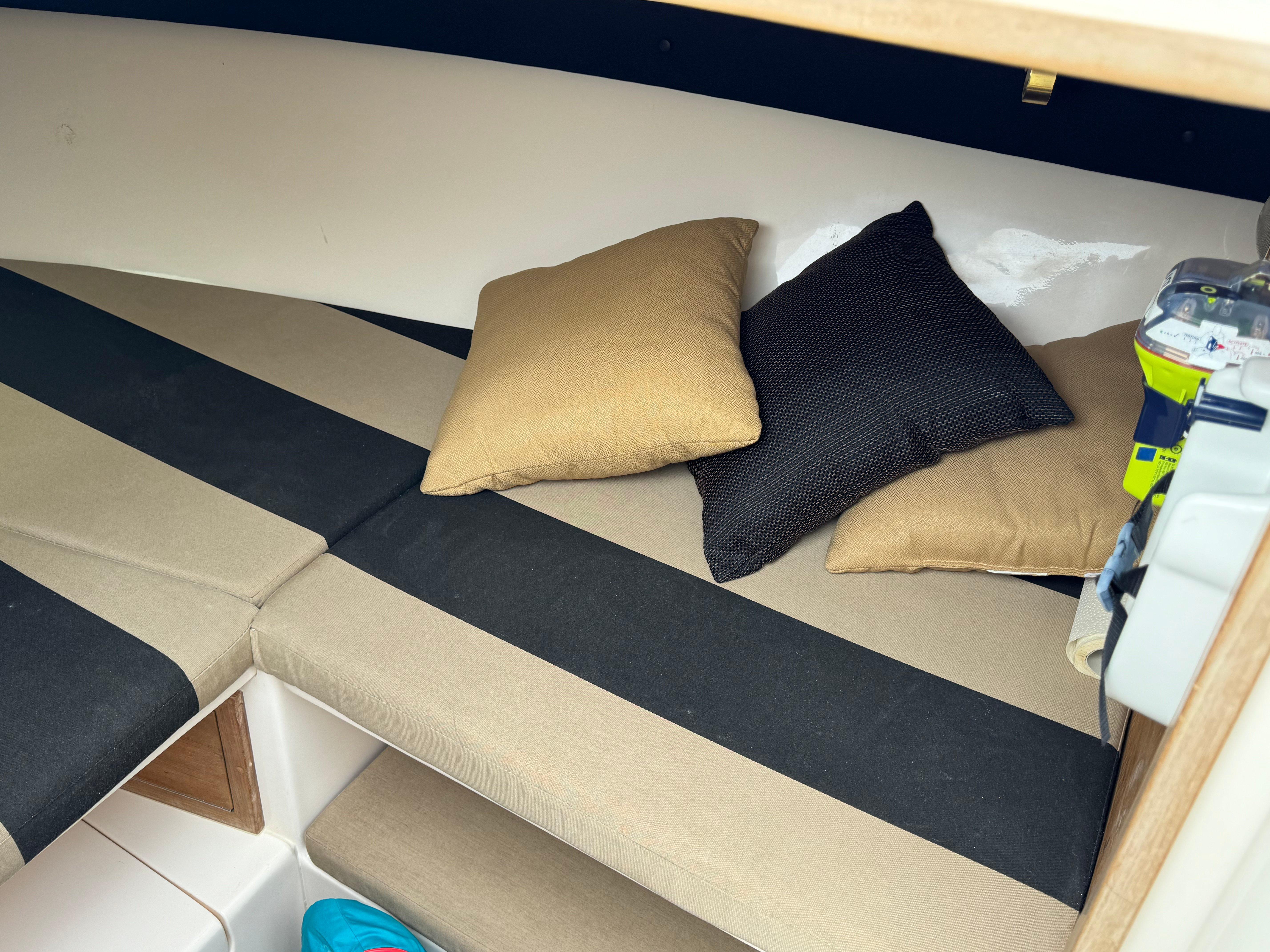 Comfort on board is just as impressive as its capabilities. The cuddy features a full sofa back, and the Polly enclosure, just two years old, provides protection from the elements. A cooler has been added up front for convenience, along with three bean bags for relaxed seating. The upholstery is in great condition, replaced about five to six years ago, and the non-skid decking is only two and a half years old. The T-top is solid and functional, approximately ten years old, offering plenty of shade and overhead storage.